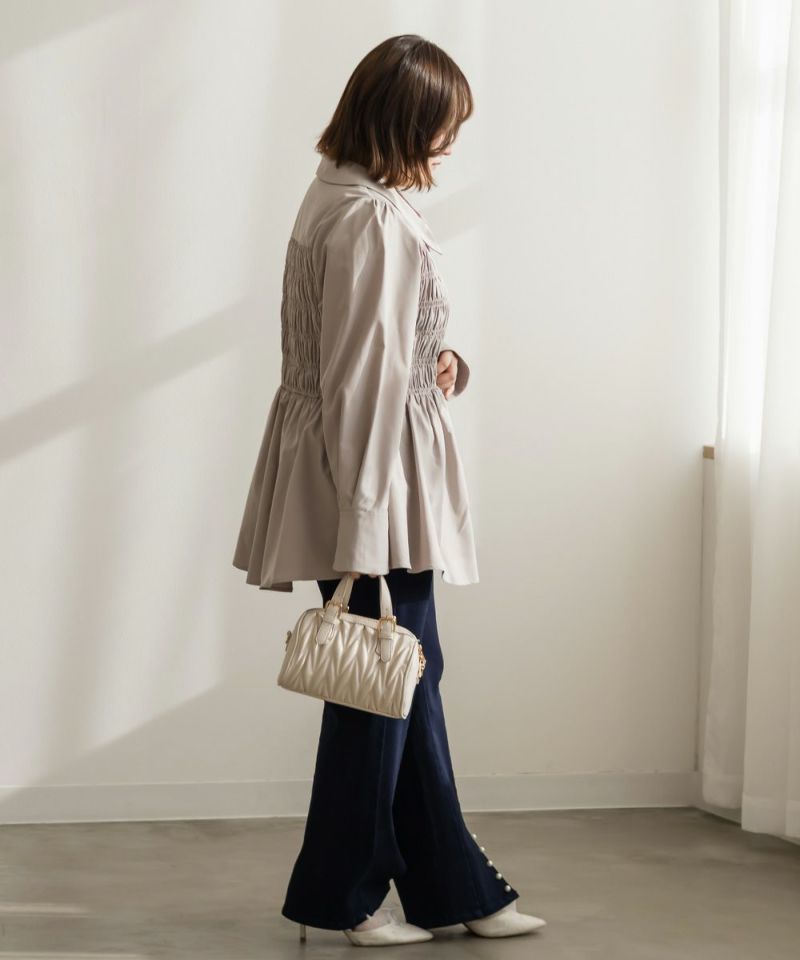 LLを着てちょうどいいサイズでした。シャツ襟がついたデザインで上品な雰囲気です◎首元は窮屈感が無くすっきり開いているのが嬉しいポイントです!ウエストから綺麗に広がるシルエットになっているからメリハリがあってすっきりとした印象になれます!胸元はシャーリング仕様のの柔らかいゴムだからストレスフリーな着心地です。お腹周りやお尻を隠せるデザインだから、着やせ効果も高いです。パンツや、ミニ丈・ナロースカートと合わせるとバランスが良いです。長いシーズン着まわせる生地感なのもお気に入りです♪