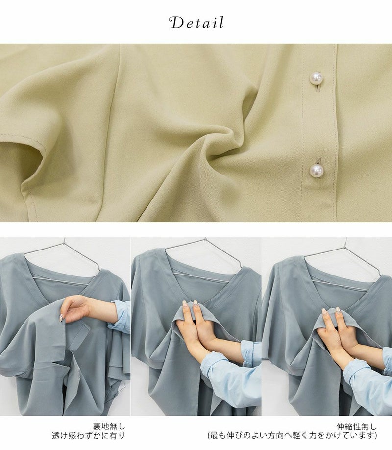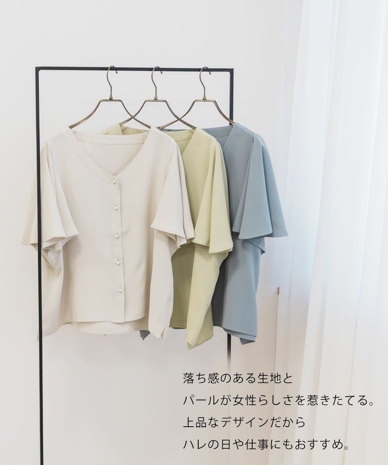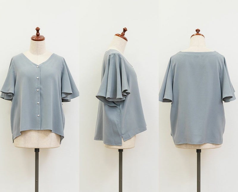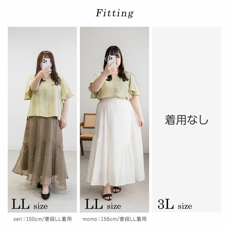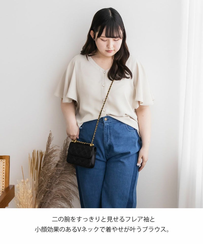 LLを着てちょうどいいサイズでした。袖がきれいなフレアになっていて、二の腕がすっぽりと隠れます。綺麗にあいたVネックで顔回りもすっきりとした印象に◎上品なデザインでパールボタンになっているから、きちんと感が必要なシーンにも使えそうです!丈が前後差のあるデザインになっていて、裾をだした着こなしも可愛いです。スカートにもパンツにも合わせやすい、色々なシーンで活躍できるブラウスです!