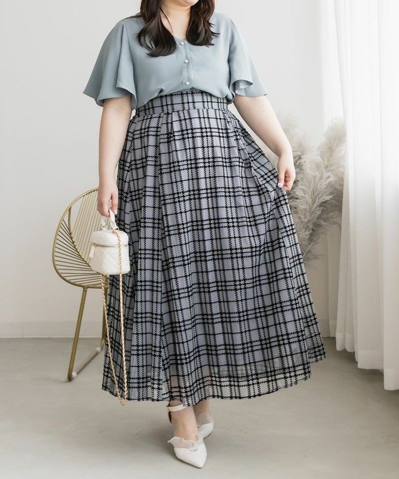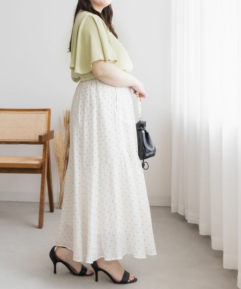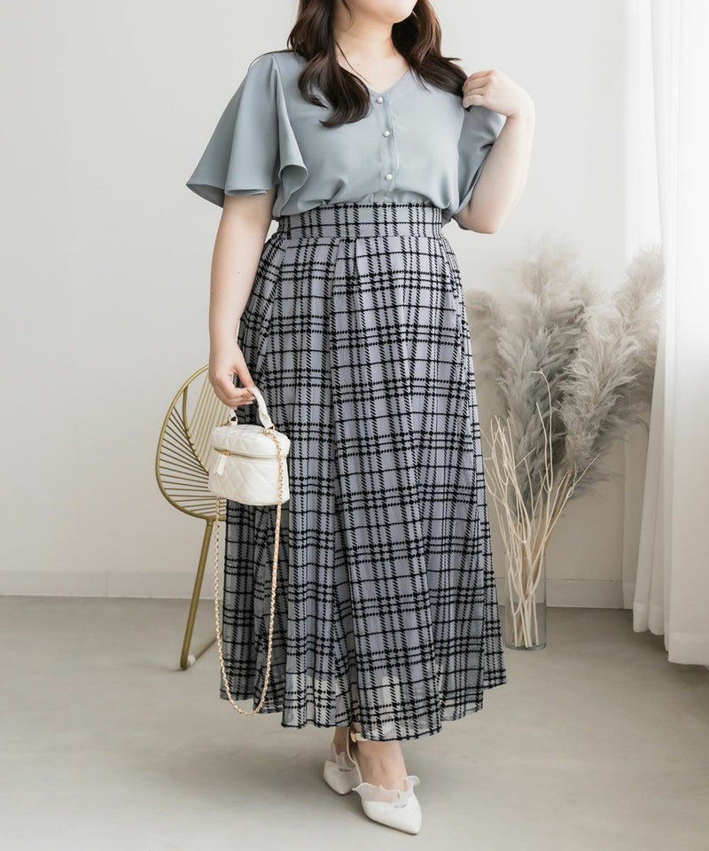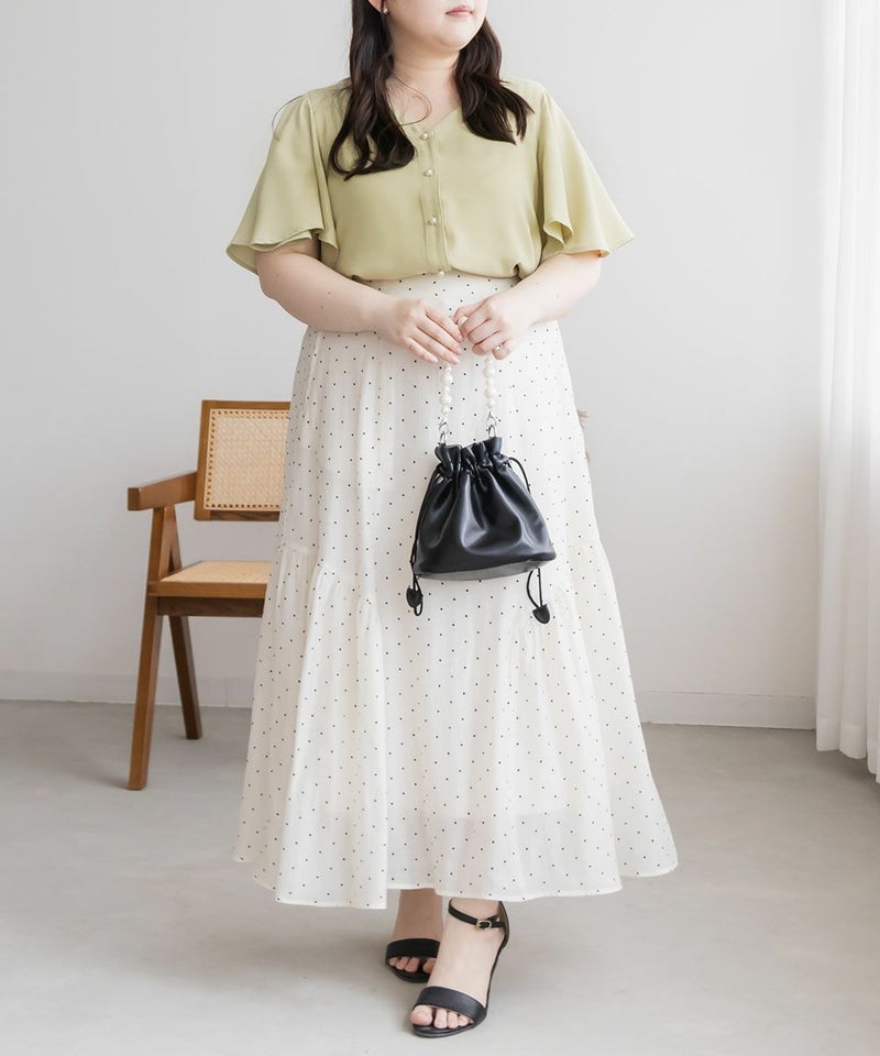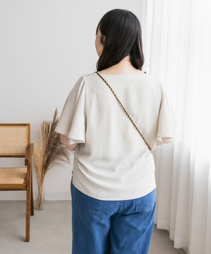 LLを着てちょうどいいサイズでした。袖がきれいなフレアになっていて、二の腕がすっぽりと隠れます。綺麗にあいたVネックで顔回りもすっきりとした印象に◎上品なデザインでパールボタンになっているから、きちんと感が必要なシーンにも使えそうです!丈が前後差のあるデザインになっていて、裾をだした着こなしも可愛いです。スカートにもパンツにも合わせやすい、色々なシーンで活躍できるブラウスです!