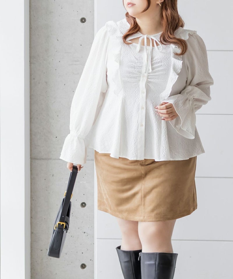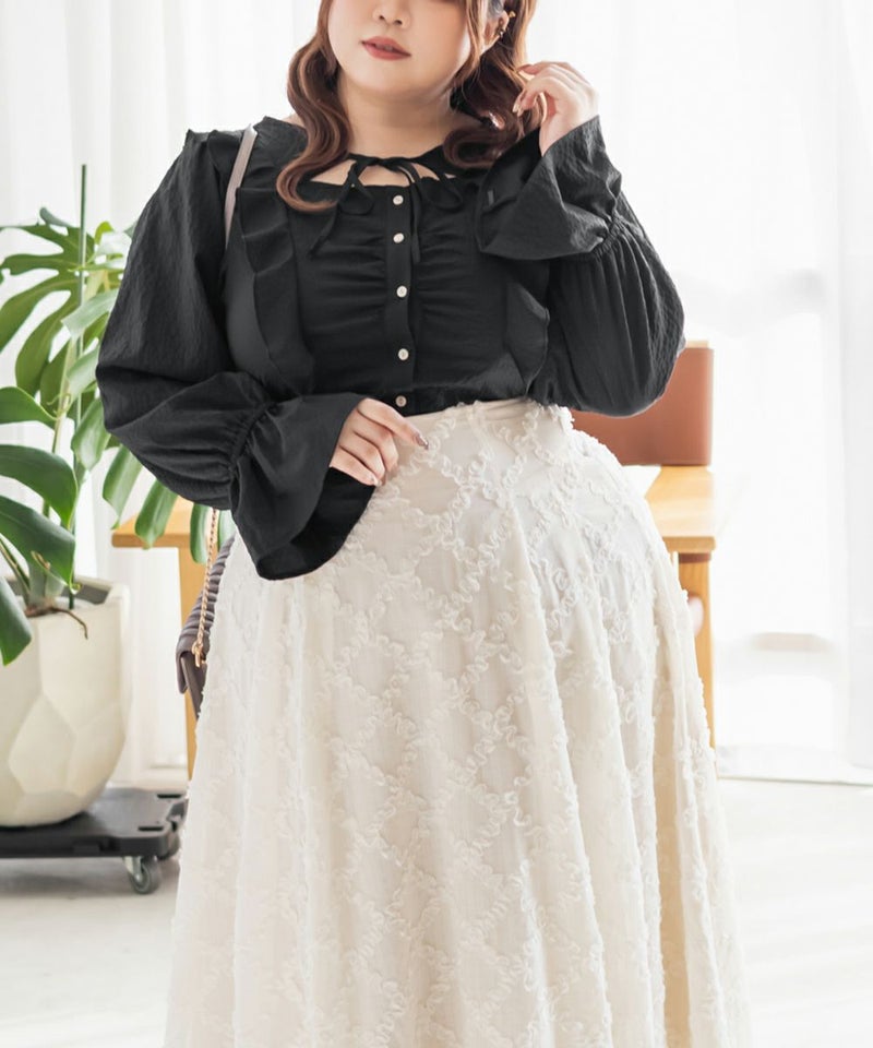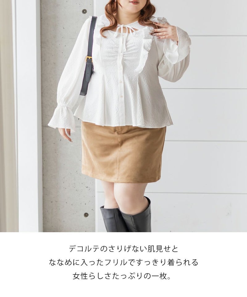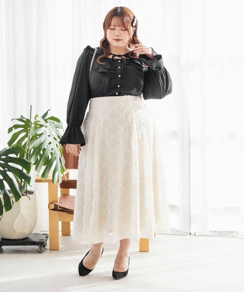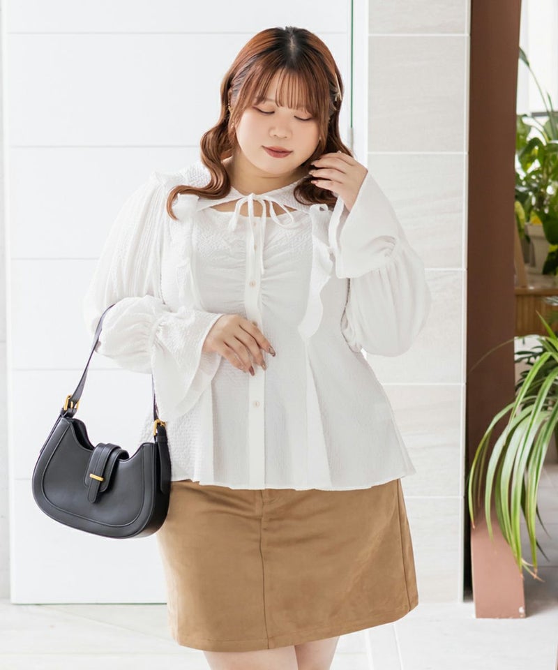 3Lサイズを着用してちょうどいいサイズ感でした。ウエストにタックが入っていて切替が無いのにメリハリが出てすっきりした印象で着用できました♪デコルテのリボンは女性らしいポイントになってネックレスいらずなのも嬉しいです◎ウエストはくびれて見えるデザインでスタイルアップ効果も◎凹凸のある軽い生地で長いシーズン着やすいです。袖もふんわりして二の腕カバーもバッチリで、デートやお出かけに着ていきたくなる1枚で着映えするブラウスです!