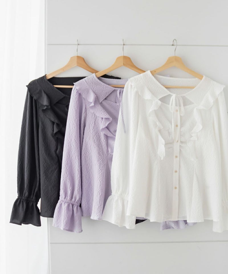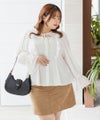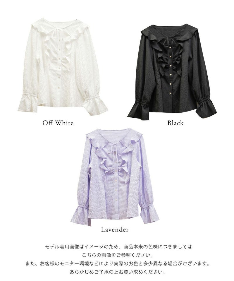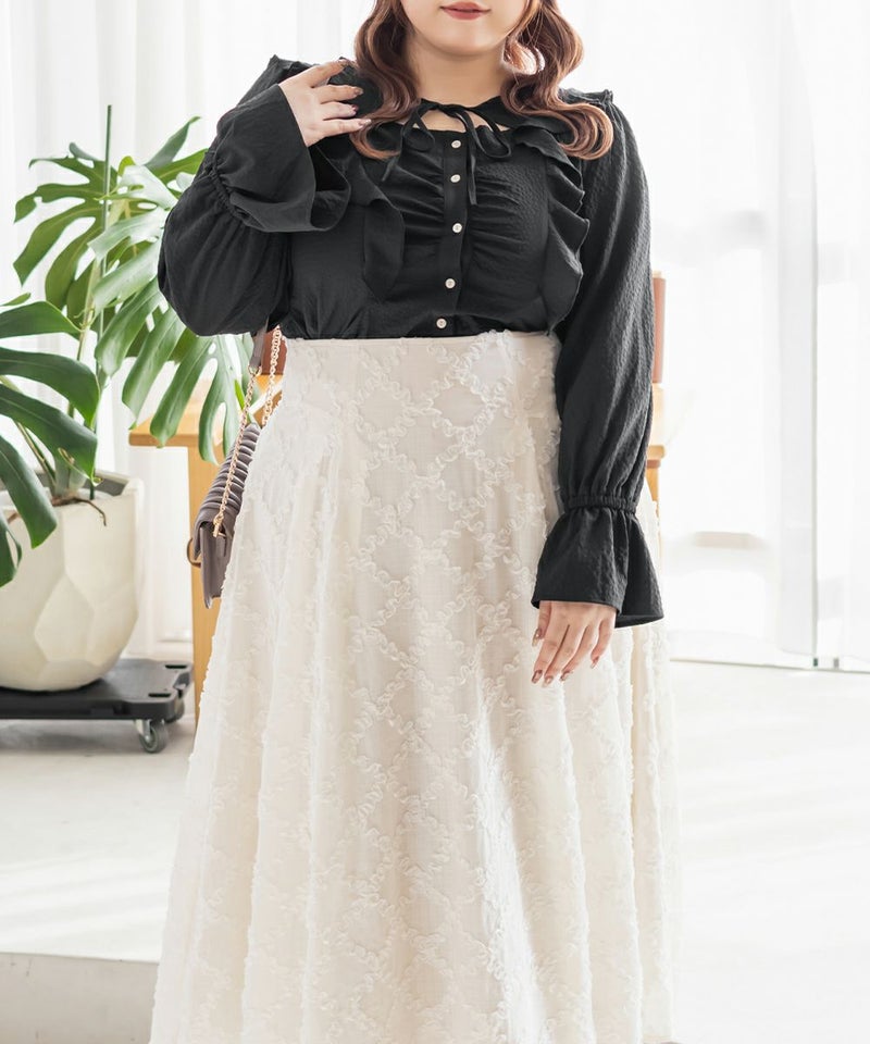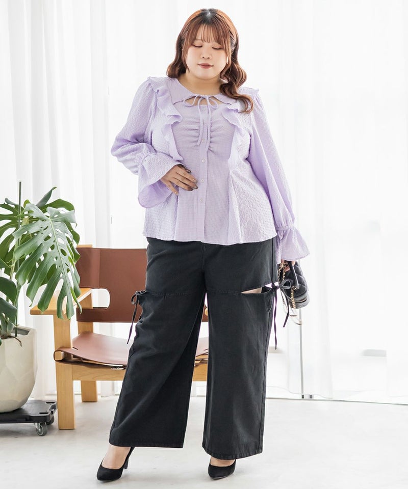 3Lサイズを着用してちょうどいいサイズ感でした。ウエストにタックが入っていて切替が無いのにメリハリが出てすっきりした印象で着用できました♪デコルテのリボンは女性らしいポイントになってネックレスいらずなのも嬉しいです◎ウエストはくびれて見えるデザインでスタイルアップ効果も◎凹凸のある軽い生地で長いシーズン着やすいです。袖もふんわりして二の腕カバーもバッチリで、デートやお出かけに着ていきたくなる1枚で着映えするブラウスです!