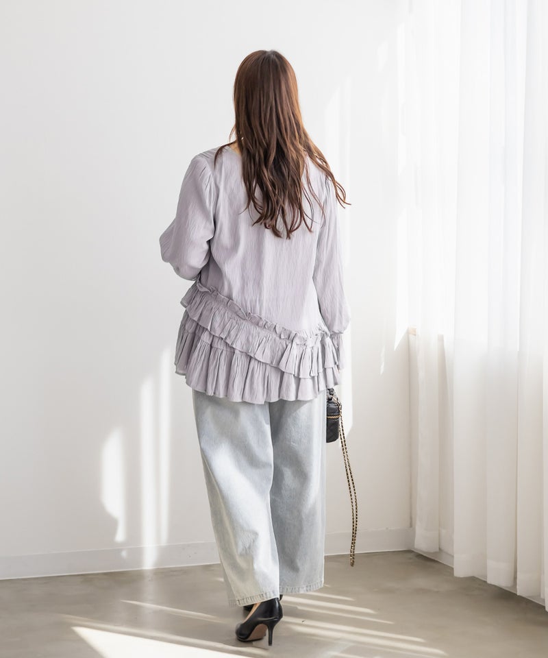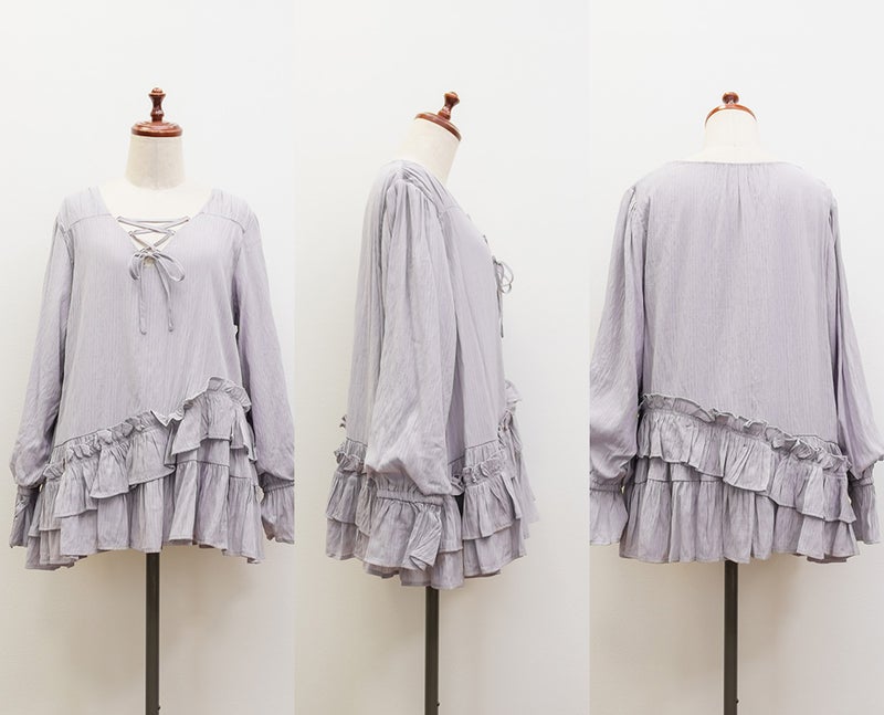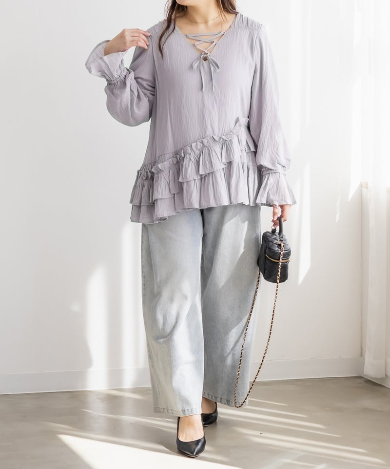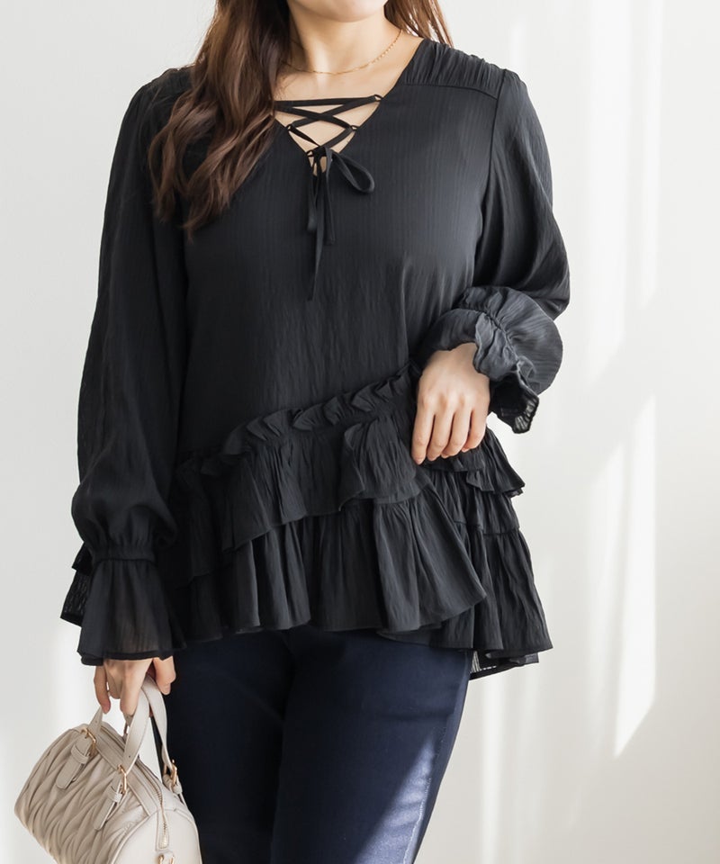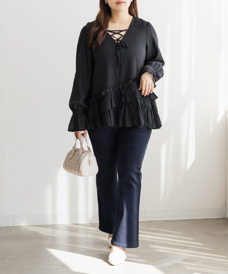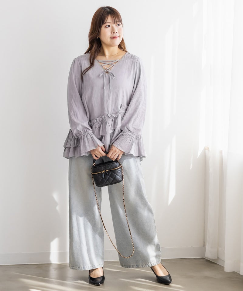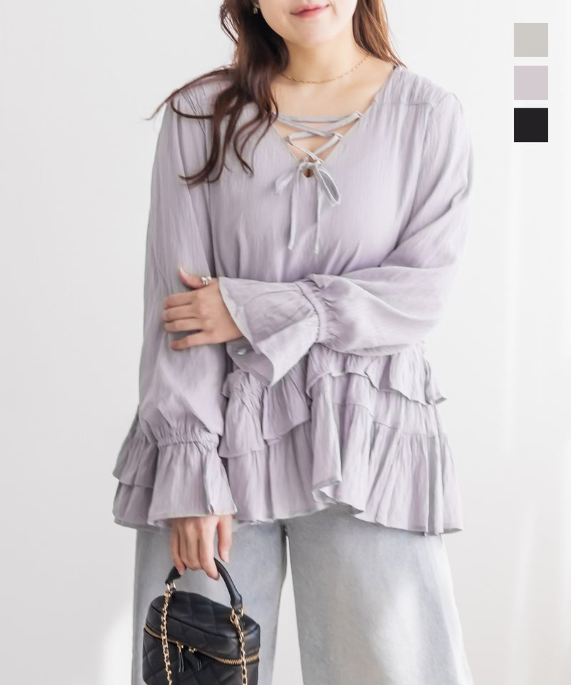 3Lを着て程よくゆとりがあって余裕をもって着ることができました。Aラインシルエットが体型をカバーしてすっきりとした印象にしてくれます◎しかもさらっとした肌ざわりで着心地も軽やかなのでロングシーズン活躍しそうです♪フロントのレースアップデザインが女性らしいポイントで、ネックラインはすっきりと開いており顔回りも綺麗な印象◎大人っぽいけどフェミニンな雰囲気もあり、様々なシーンで使えそうです!パンツは勿論、コンパクトなスカートと合わせても可愛いです。