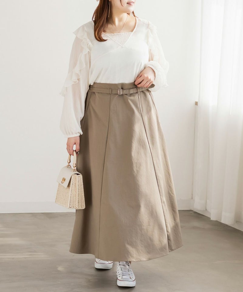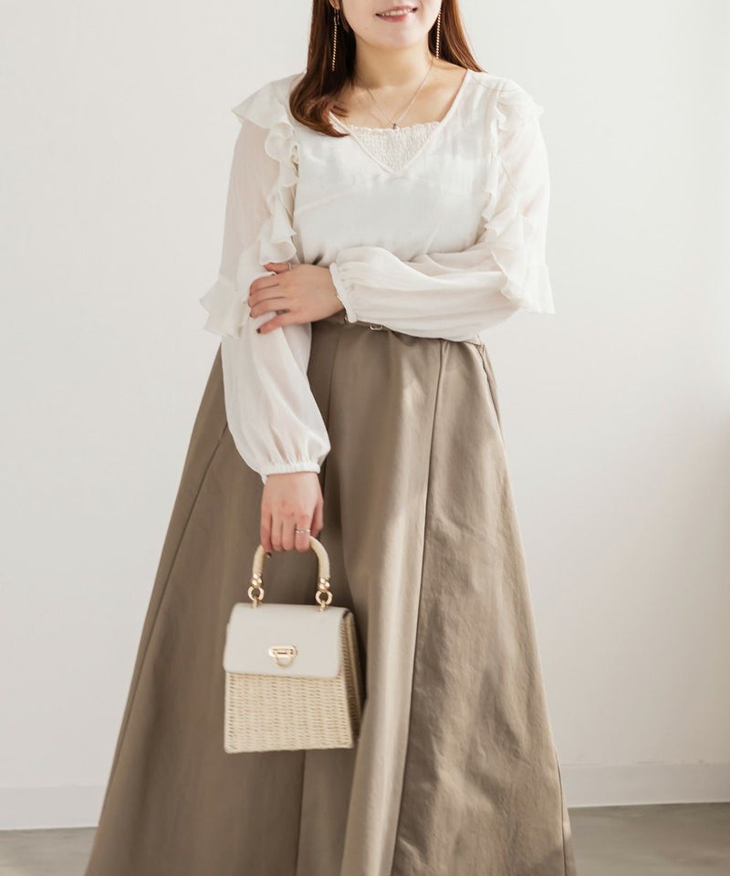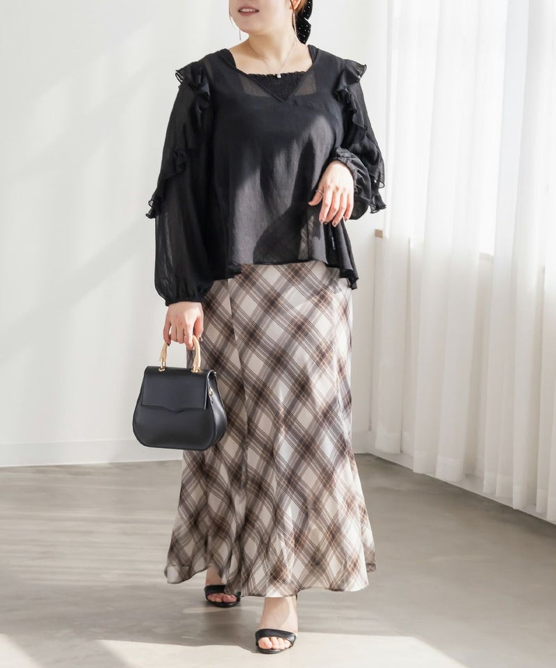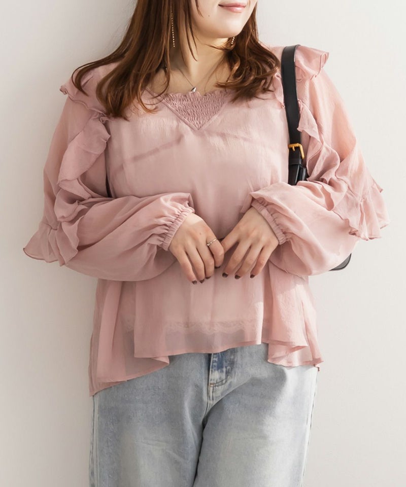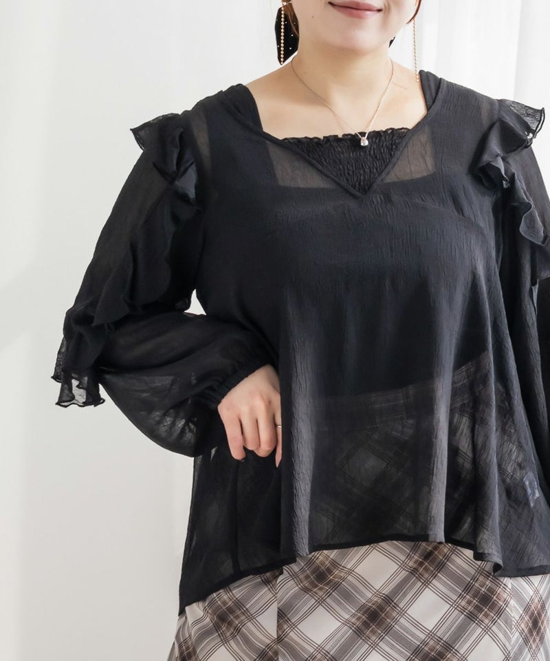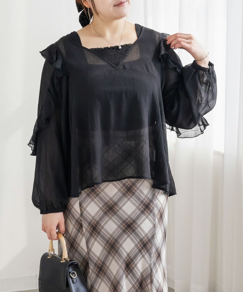 3Lサイズを着用しました。全体的にちょうどよく、シアー素材ですが身幅に程よいゆとりがあり、窮屈感なく着られました。ラッフルフリルが顔まわりを華やかに見せてくれて、1枚でしっかり着映えするのが嬉しいポイント♪ 透け感はありますが、インナー次第で上品に着られる印象です。インでもアウトでもバランスが取りやすく、スカート合わせでフェミニンにも、パンツで甘さを抑えたコーデにも使いやすいブラウスだと思います◎
