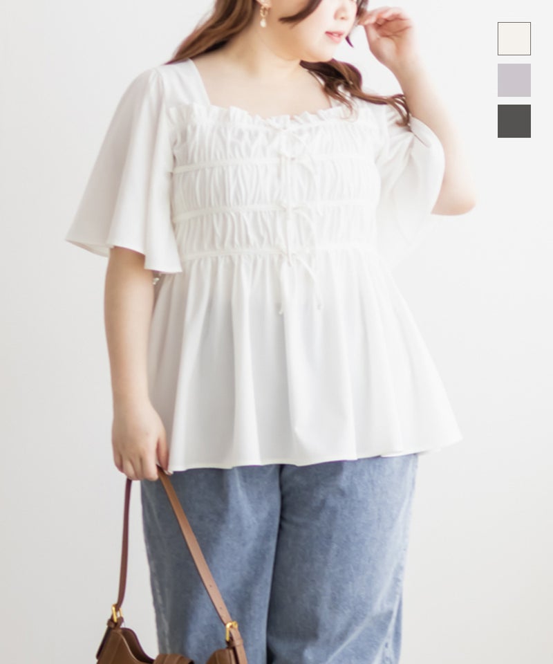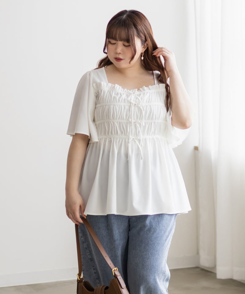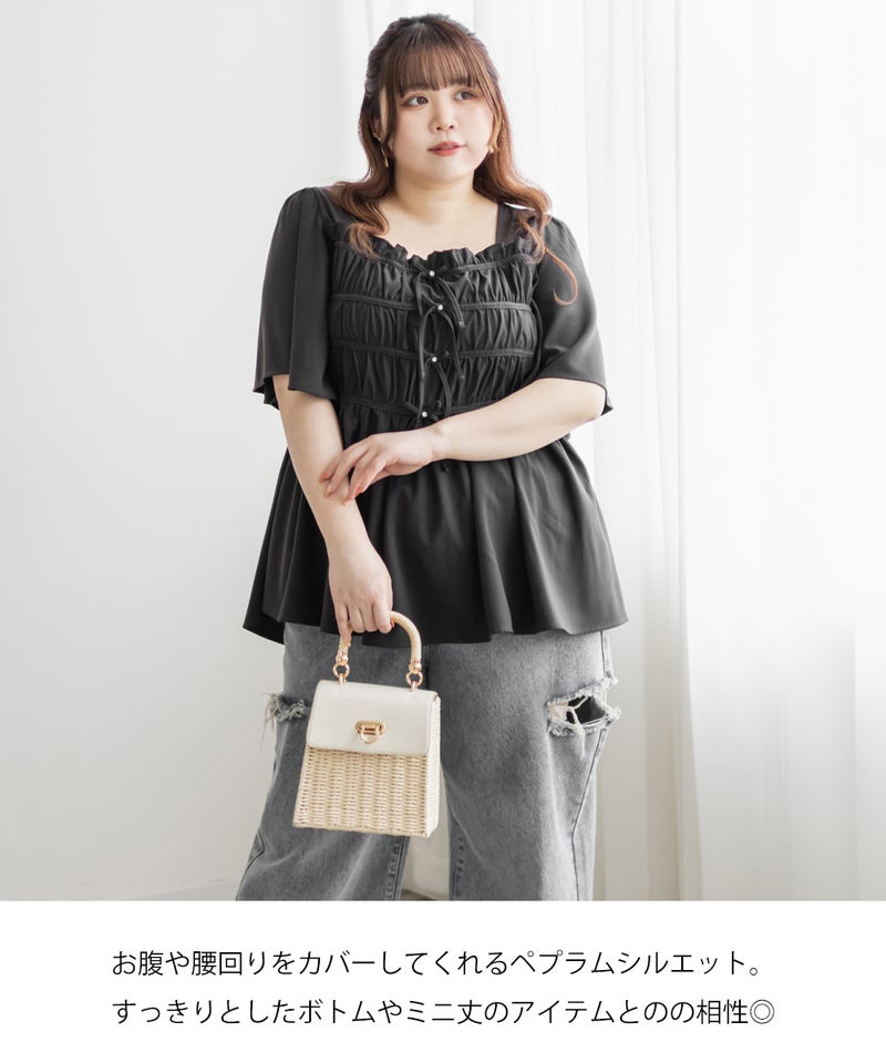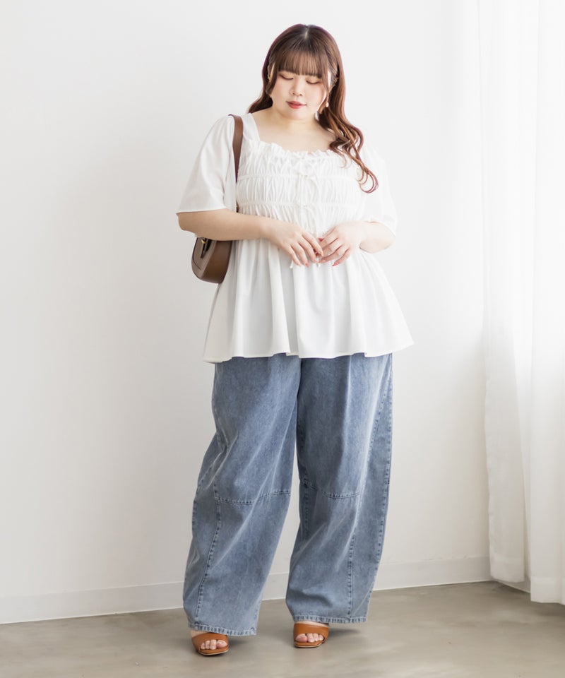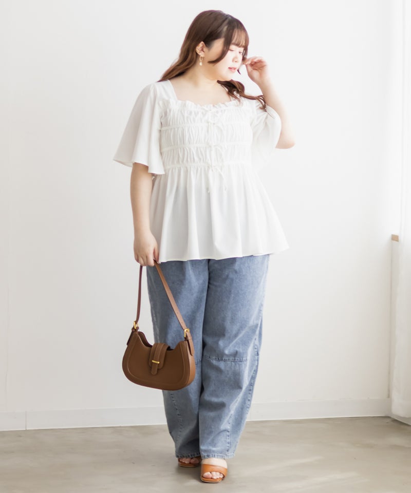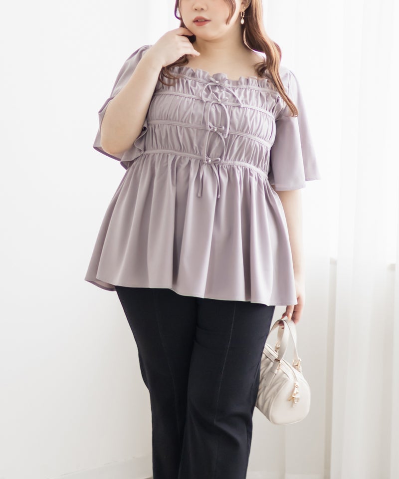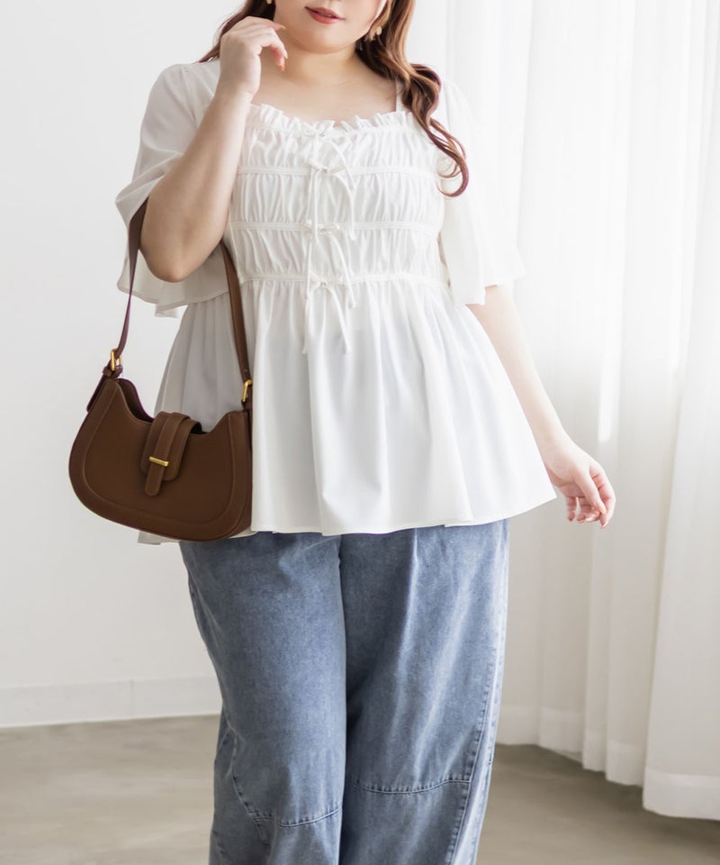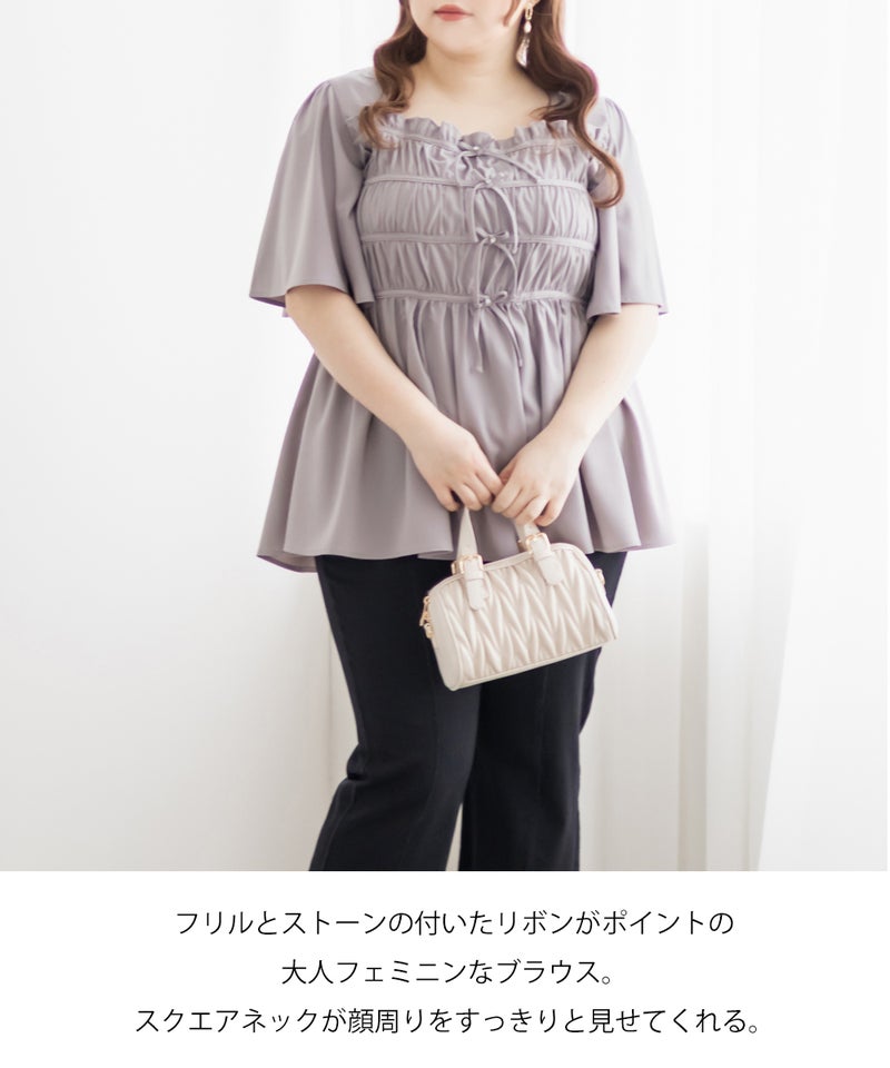 3Lサイズを着用して、ちょうどいいサイズ感で着ることができました◎バストからウエストまではシャーリングゴムでボディラインをカバーしながらフィット感があり着やせできるデザインでした。フロントのリボンにはビジューもついていてガーリーながら高級感のある上品な雰囲気に。ふわっと軽やかな生地感で肌なじみもよく、暑い時期でもさらっと快適に着られそうです♪リボンは甘すぎず、さりげないポイントになっているので、大人っぽさをキープしながら可愛さも楽しめるデザインです。袖も程よくゆったりしていて、二の腕を自然にカバーしてくれるのが嬉しいポイント◎デニムやワイドパンツと合わせてカジュアルに、きれいめなボトムと合わせればお仕事などにもぴったりな万能ブラウスです!