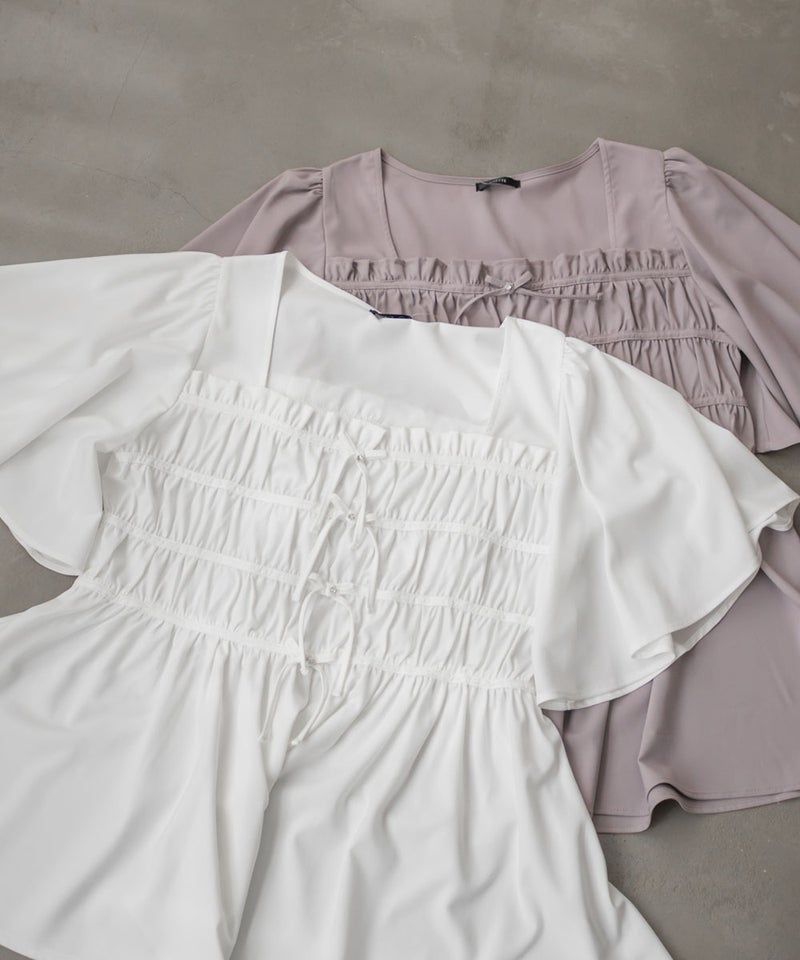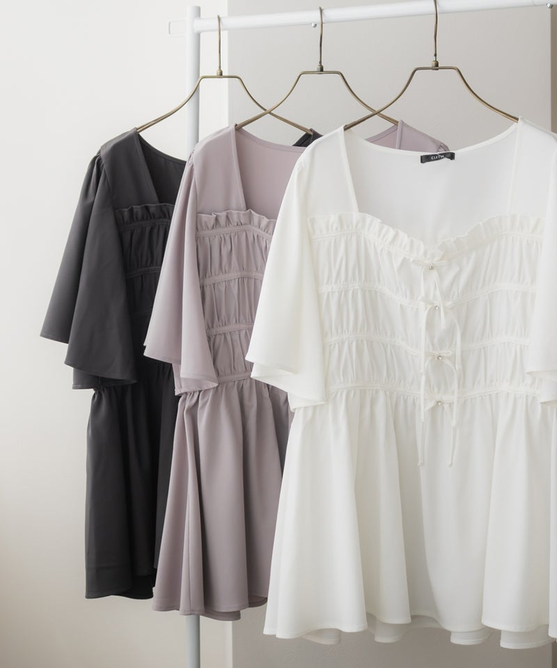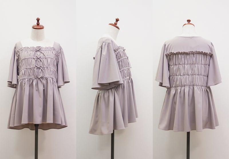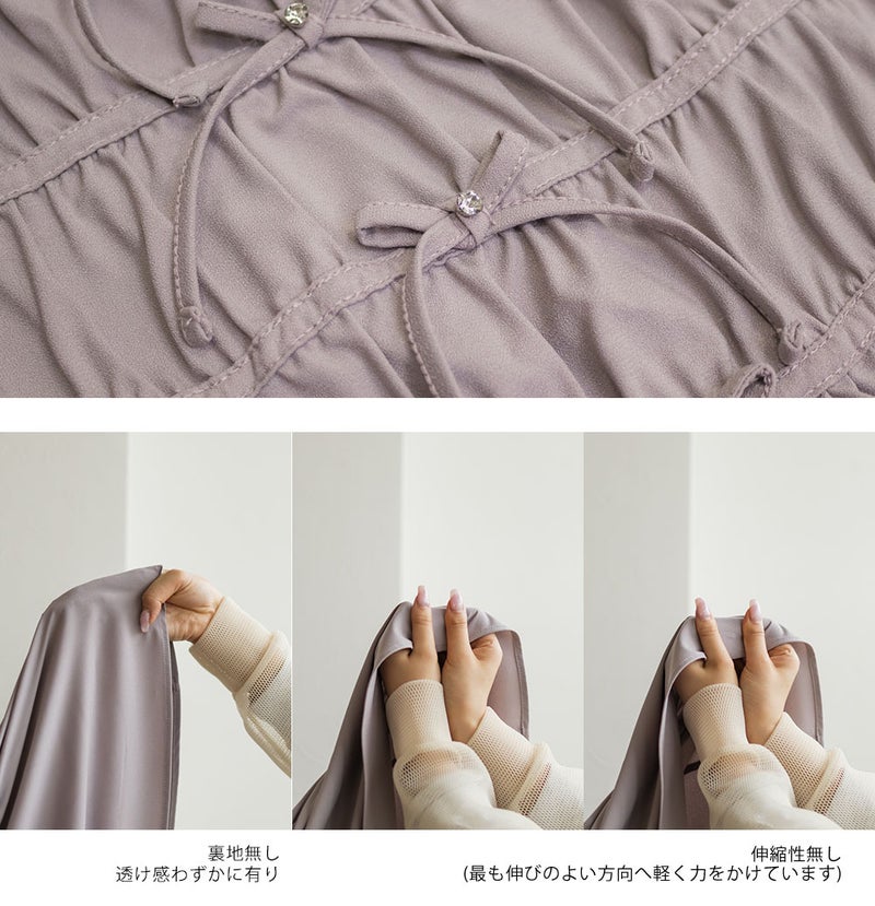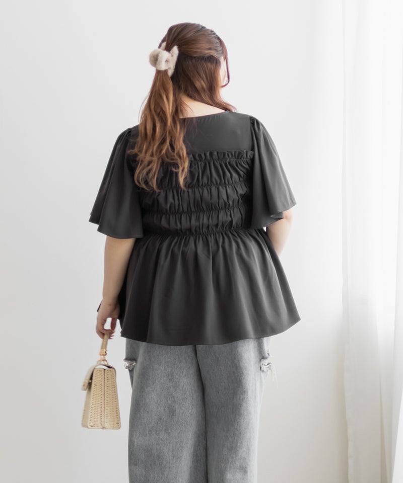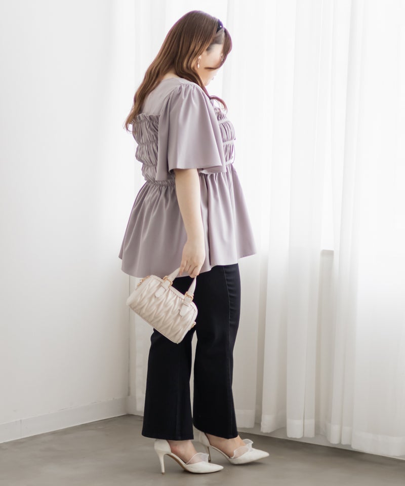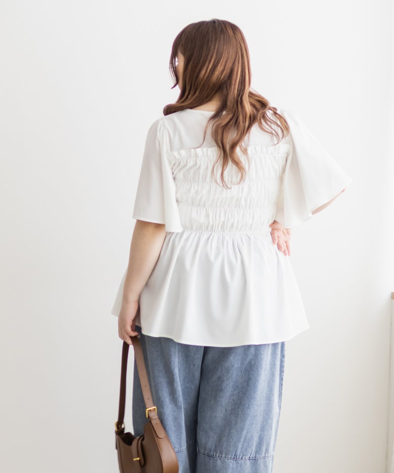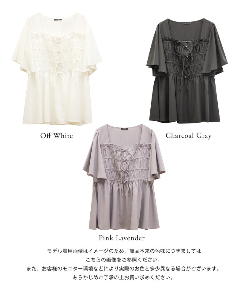 3Lサイズを着用して、ちょうどいいサイズ感で着ることができました◎バストからウエストまではシャーリングゴムでボディラインをカバーしながらフィット感があり着やせできるデザインでした。フロントのリボンにはビジューもついていてガーリーながら高級感のある上品な雰囲気に。ふわっと軽やかな生地感で肌なじみもよく、暑い時期でもさらっと快適に着られそうです♪リボンは甘すぎず、さりげないポイントになっているので、大人っぽさをキープしながら可愛さも楽しめるデザインです。袖も程よくゆったりしていて、二の腕を自然にカバーしてくれるのが嬉しいポイント◎デニムやワイドパンツと合わせてカジュアルに、きれいめなボトムと合わせればお仕事などにもぴったりな万能ブラウスです!
