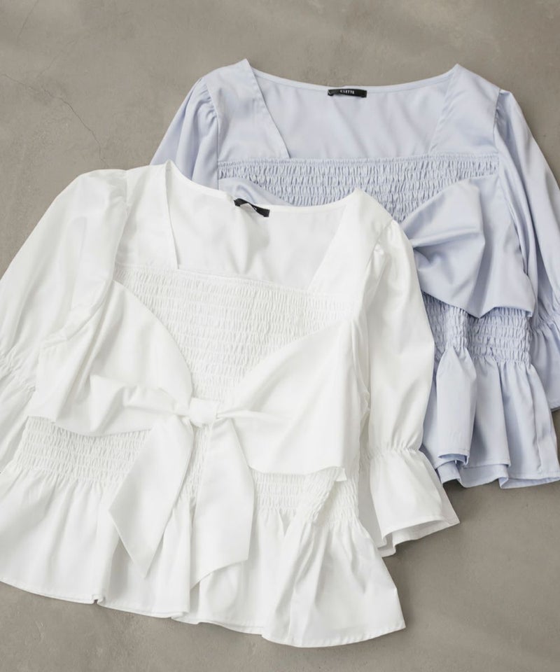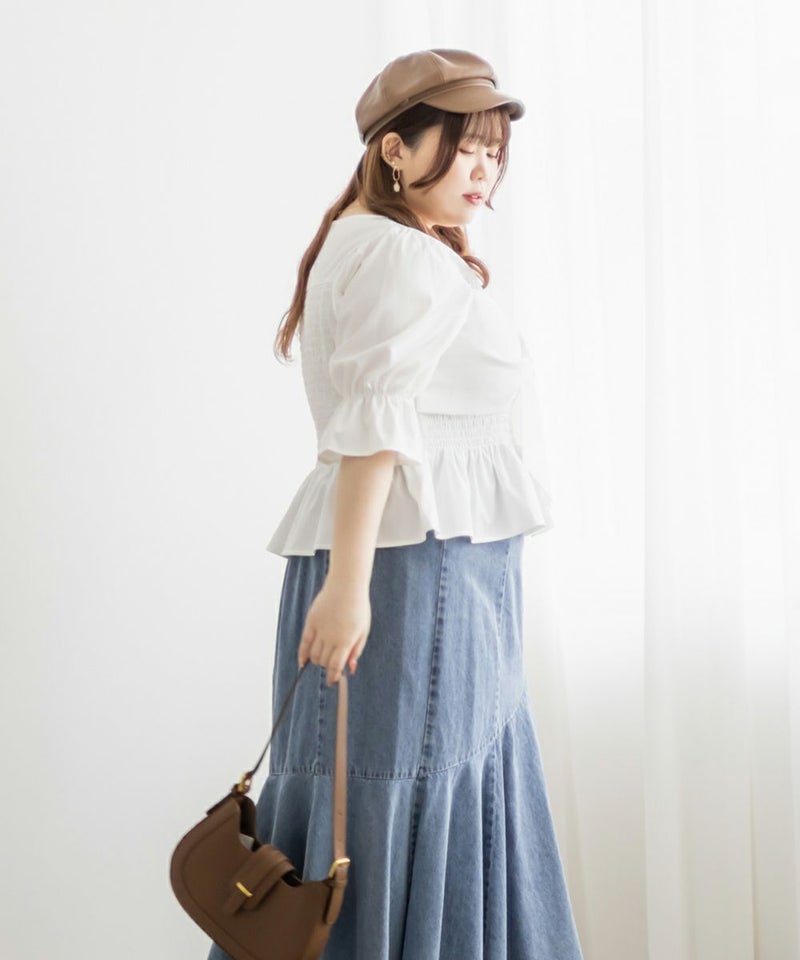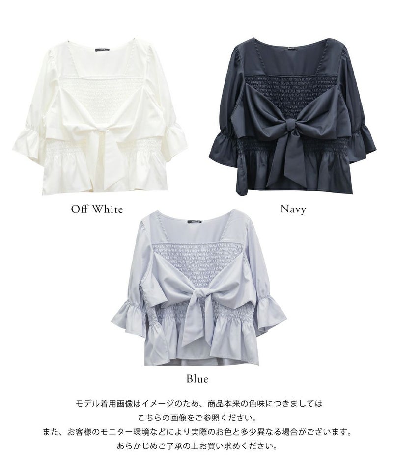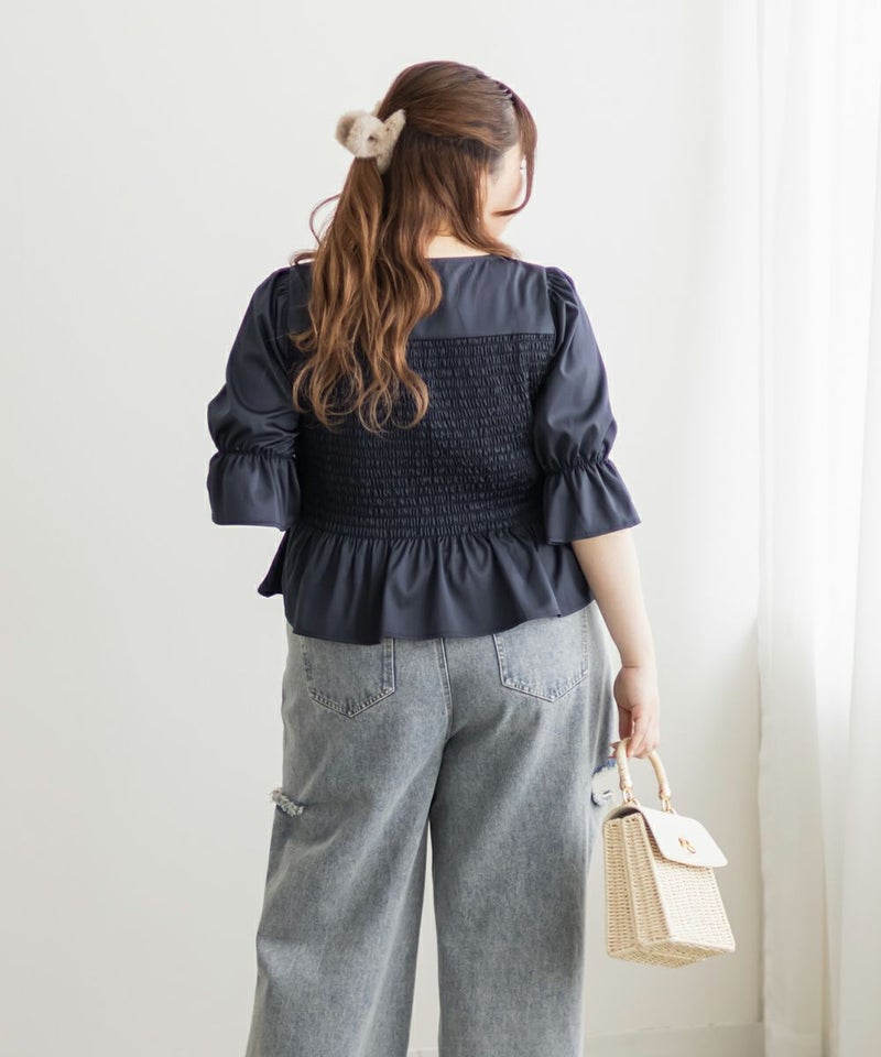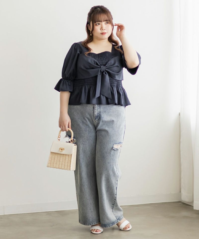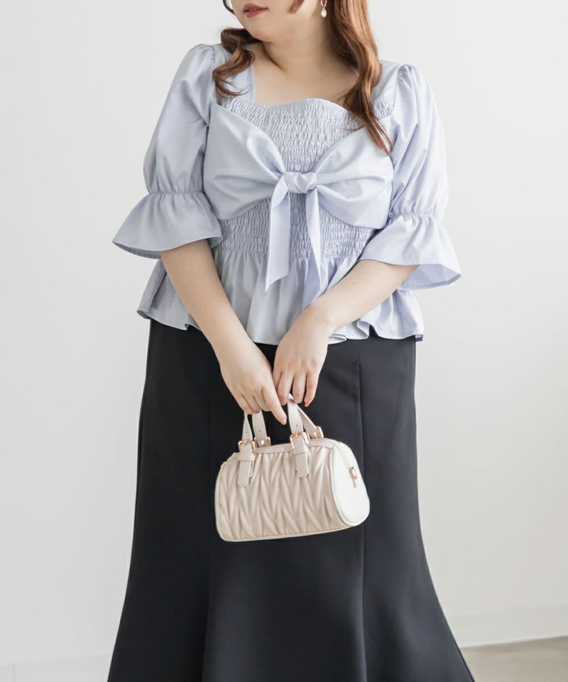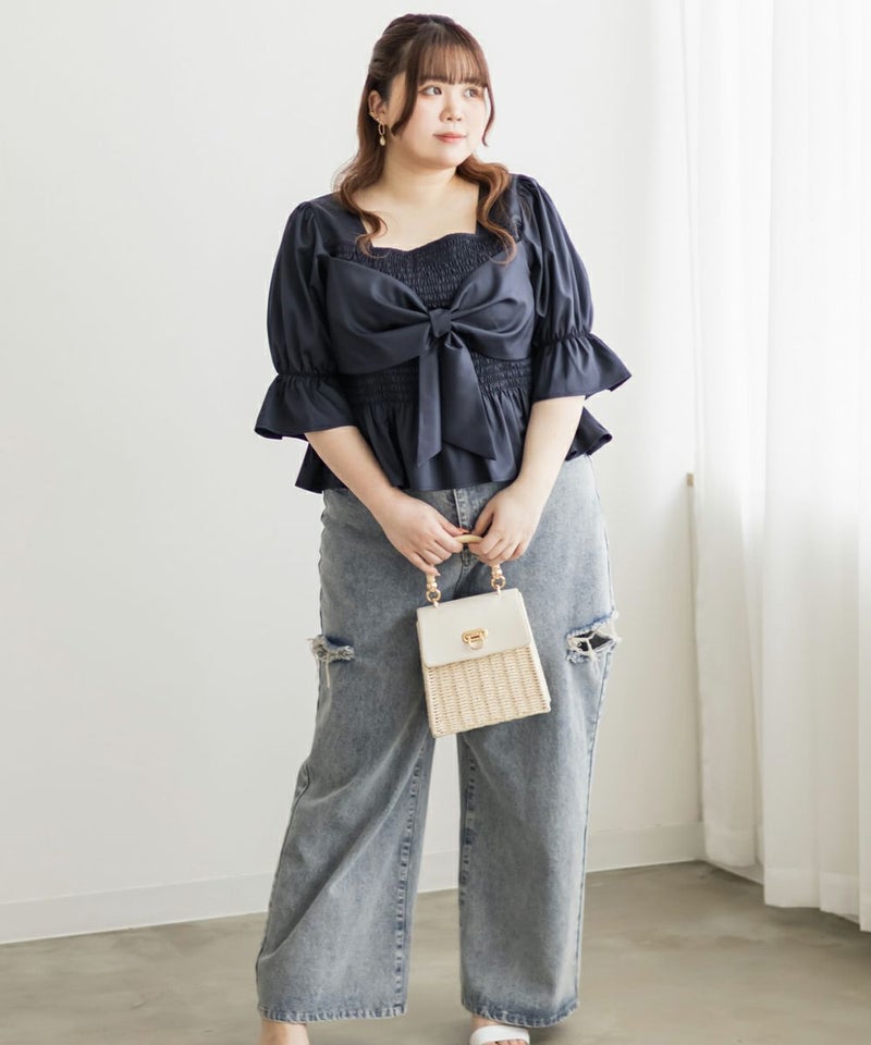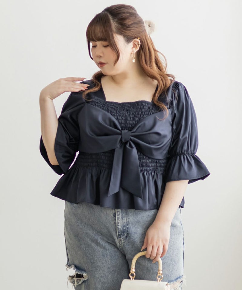 3Lサイズを着用しましたが、ぴったりちょうどいいサイズ感でした◎全体にたっぷりとシャーリングが入っているので、体のラインを拾いにくく、自然と着痩せして見えるシルエットが叶います。素材は軽やかな光沢のある布帛生地で長時間着ていてもストレスなく過ごせそうです♪胸元の大きいリボンデザインがアクセントになっていて、甘さがありながらも生地の光沢感でどこか上品な印象に。袖はふんわりとしたシルエットで、肘も二の腕もさりげなくカバーしてくれました。デニムを合わせたカジュアルスタイルはもちろん、きれいめなスカートと合わせれば、お仕事にもぴったりです!1枚で華やかさをプラスできるので、ワードローブに加えておきたいアイテムです◎