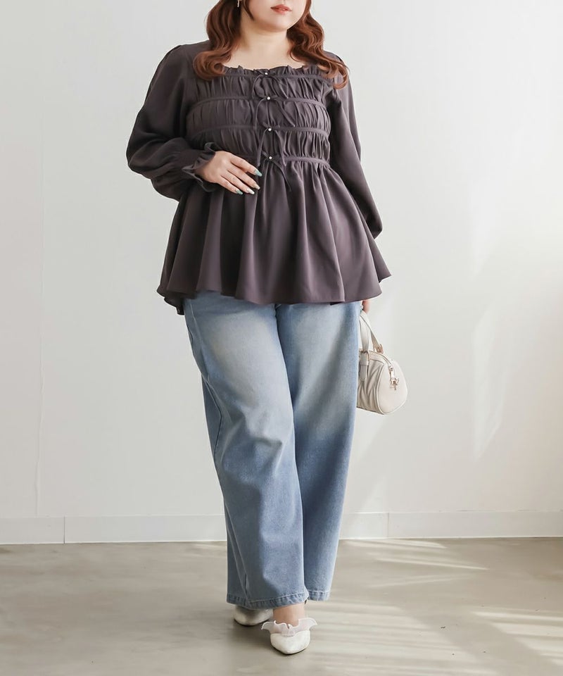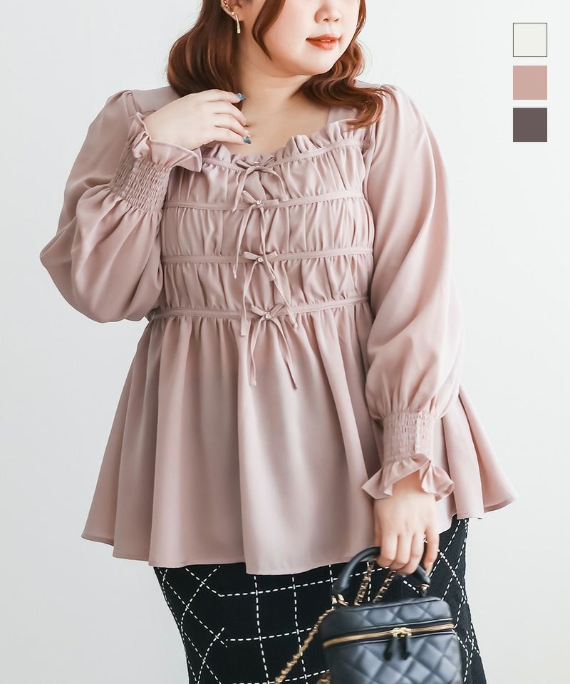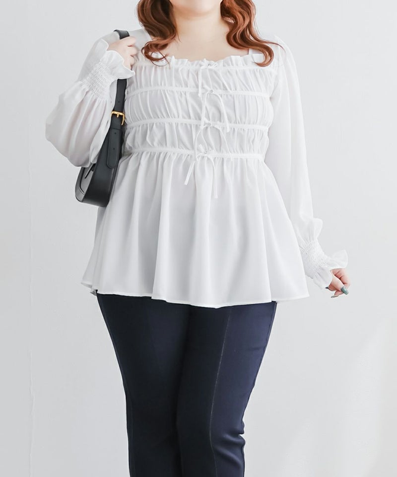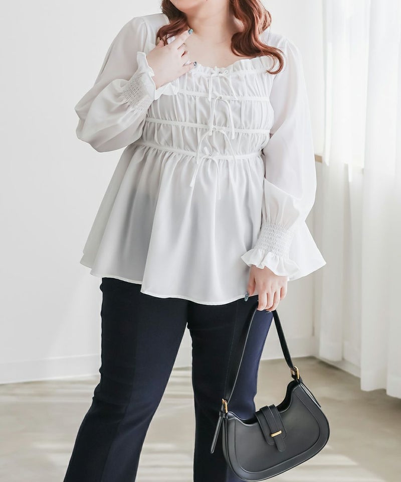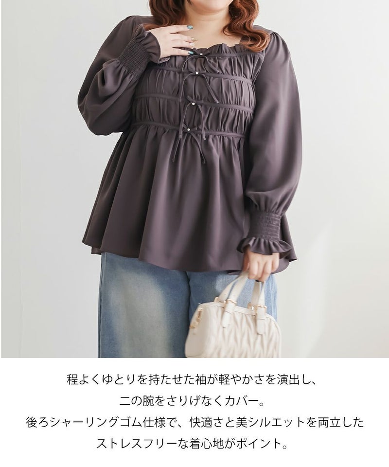 3Lサイズを着用して、ちょうどいいサイズ感で着ることができました◎バストからウエストまではシャーリングゴムでボディラインをカバーしながらフィット感があり着やせできるデザインでした。フロントのリボンにはビジューもついていてガーリーながら高級感のある上品な雰囲気に。ふわっと軽やかな生地感で肌なじみもよく、さらっと快適に着られそうです♪リボンは甘すぎず、さりげないポイントになっているので、大人っぽさをキープしながら可愛さも楽しめるデザインです。袖も程よくゆったりしていて、二の腕を自然にカバーしてくれるのが嬉しいポイント。デニムやワイドパンツと合わせてカジュアルに、きれいめなボトムと合わせればお仕事などにもぴったりな万能ブラウスです!