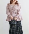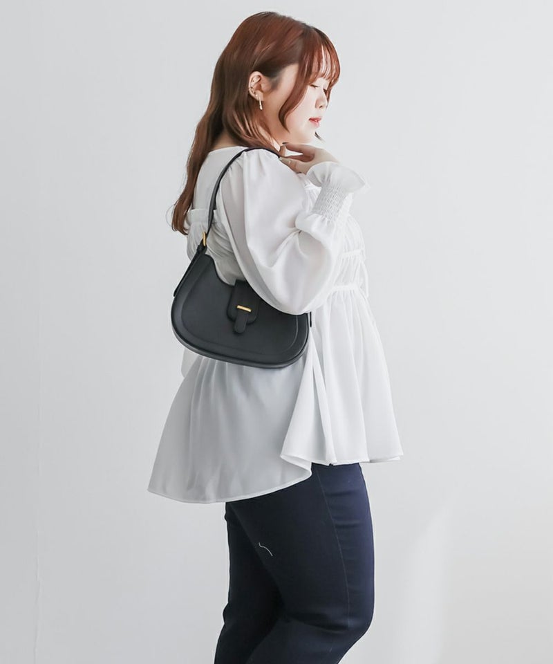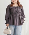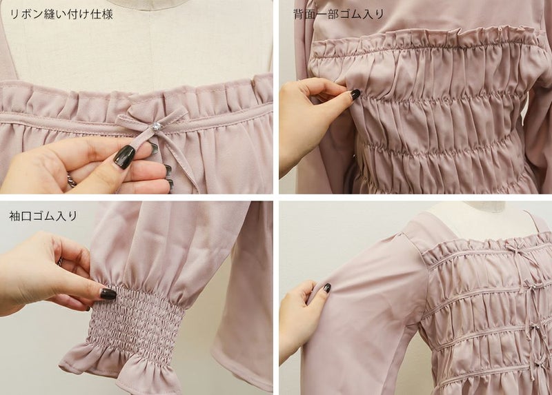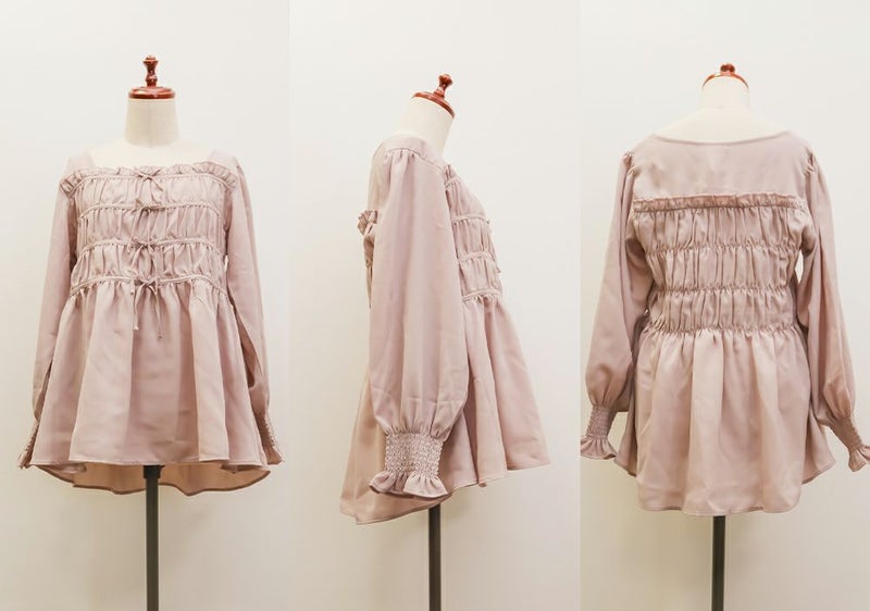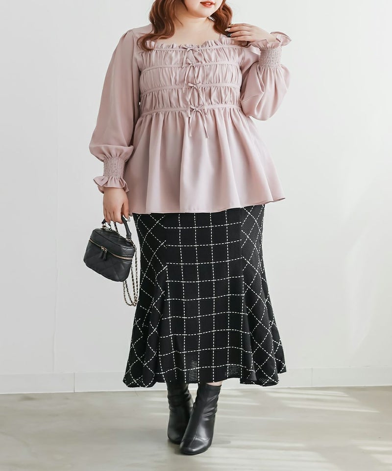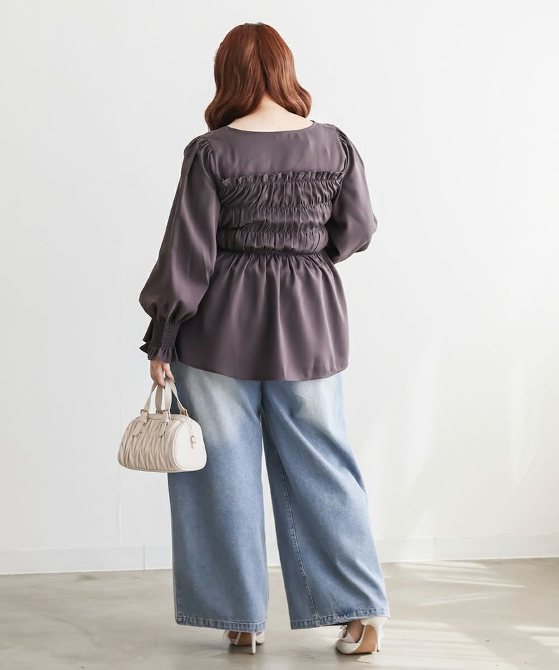 3Lサイズを着用して、ちょうどいいサイズ感で着ることができました◎バストからウエストまではシャーリングゴムでボディラインをカバーしながらフィット感があり着やせできるデザインでした。フロントのリボンにはビジューもついていてガーリーながら高級感のある上品な雰囲気に。ふわっと軽やかな生地感で肌なじみもよく、さらっと快適に着られそうです♪リボンは甘すぎず、さりげないポイントになっているので、大人っぽさをキープしながら可愛さも楽しめるデザインです。袖も程よくゆったりしていて、二の腕を自然にカバーしてくれるのが嬉しいポイント。デニムやワイドパンツと合わせてカジュアルに、きれいめなボトムと合わせればお仕事などにもぴったりな万能ブラウスです!