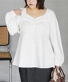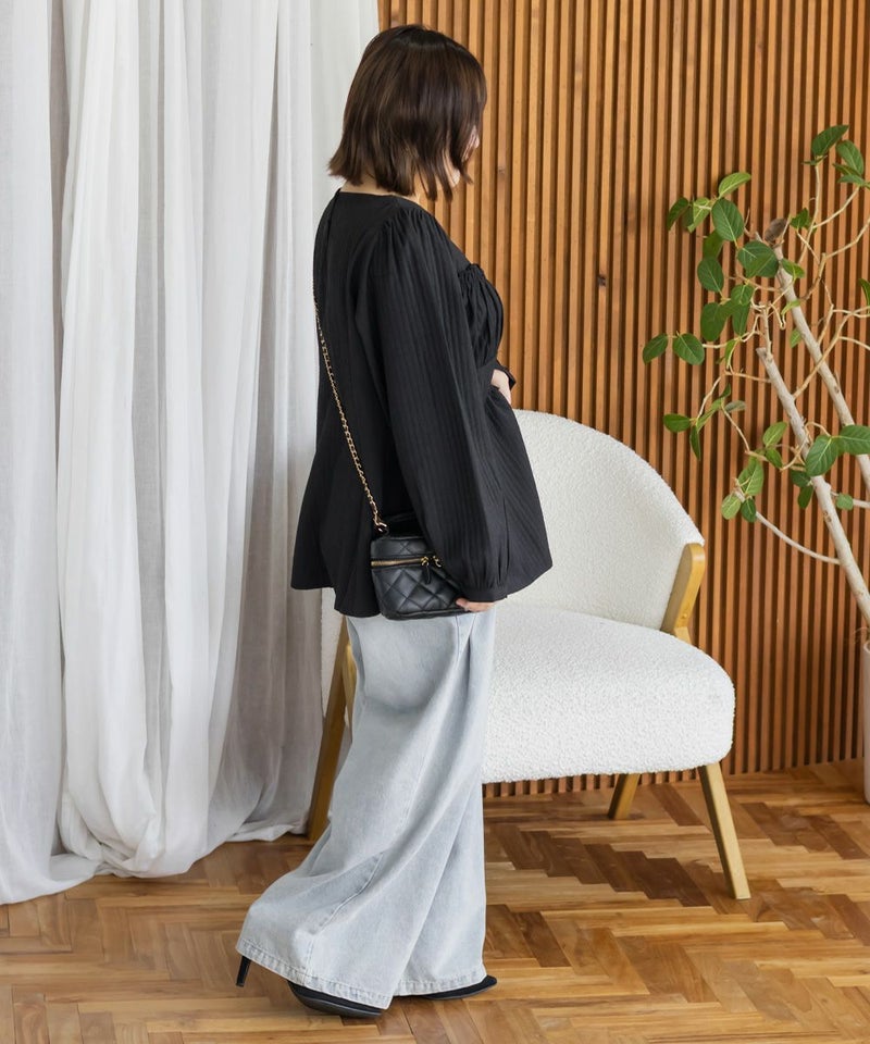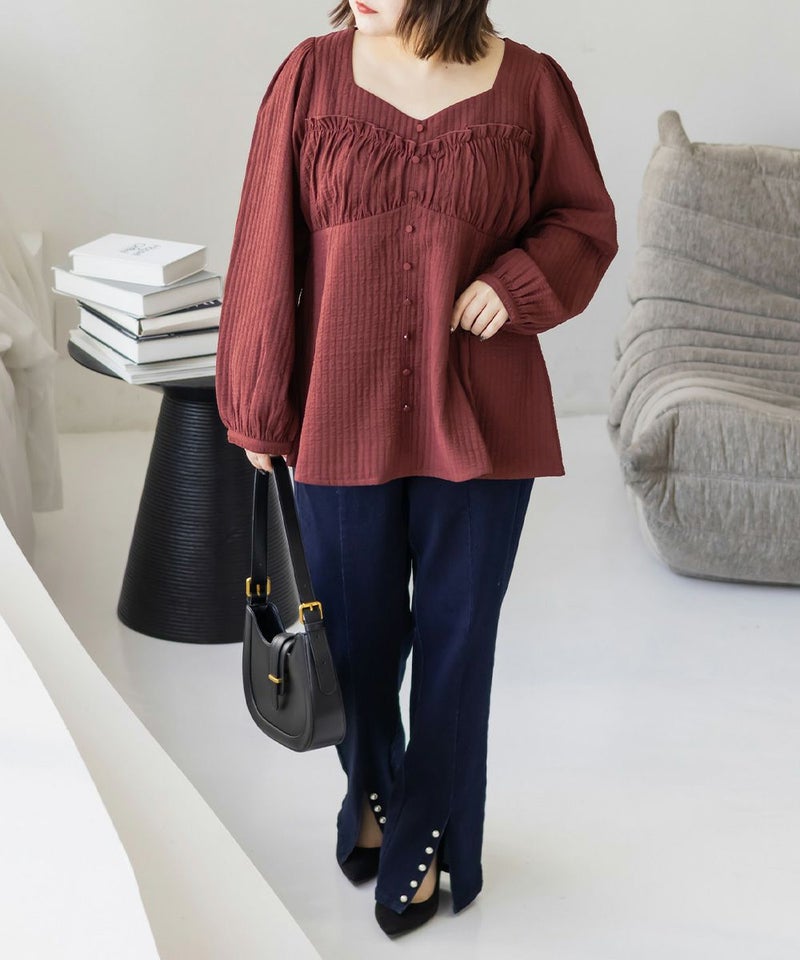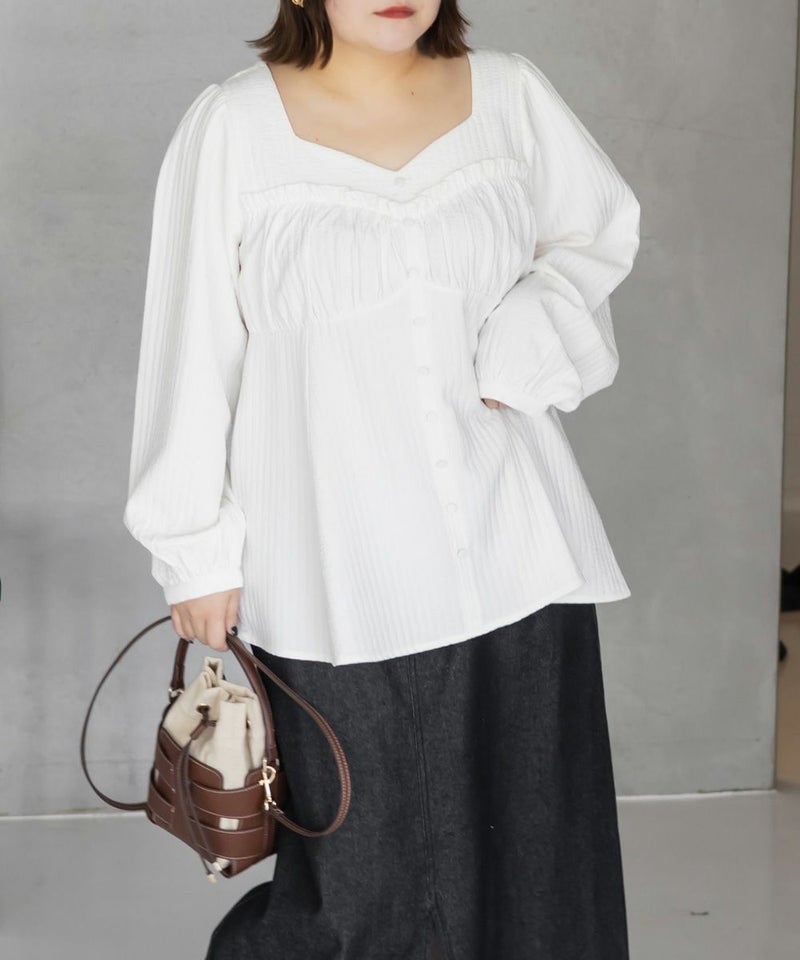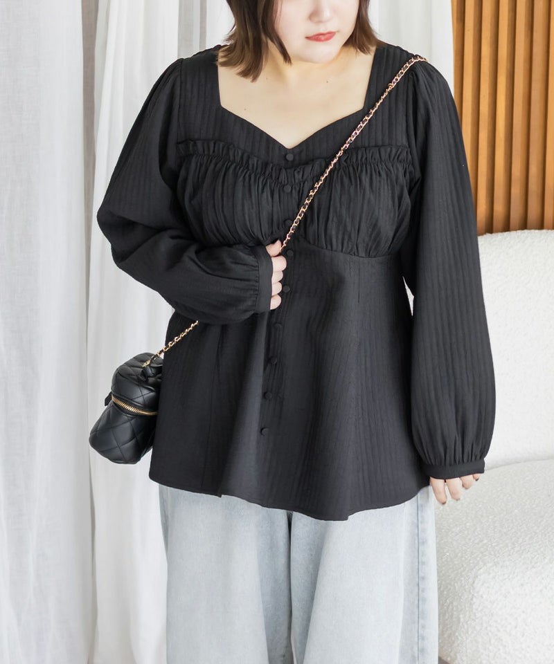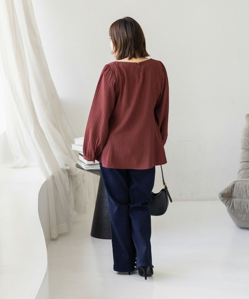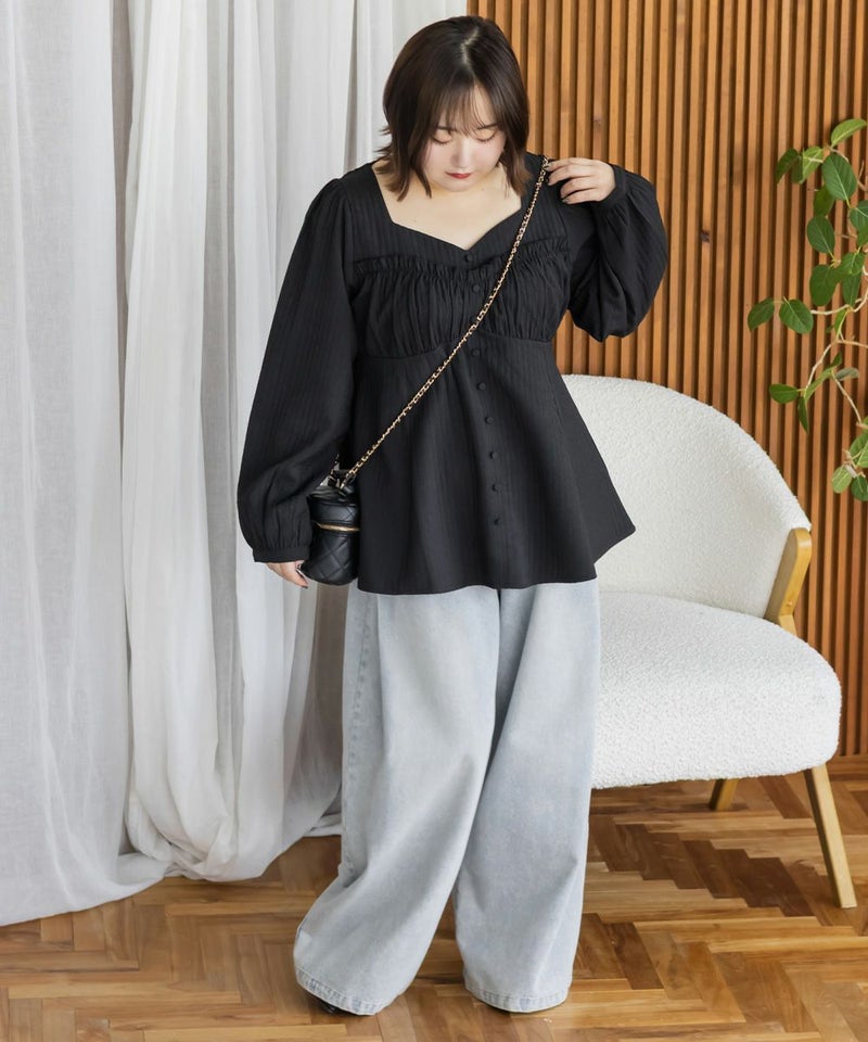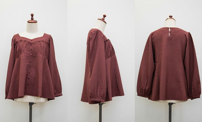 LLサイズでぴったりしすぎず程よくゆとりのある着心地でした。ゴムはないデザインなのですっきり見え抜群です!切り替えが無いのに裾に向かってフレアになっていて、楽なのに華奢見えします!軽いブラウス地で、凹凸のある生地がボディラインもカバーしてくれます。胸元のデザインがフェミニンな雰囲気で、大人っぽくもあり華やかな雰囲気のブラウスです♪ふわっと広がり、くびれはある印象なのに気になるお腹や腰まわりも自然にカバーしてくれます。デニムを合わせてカジュアルに、スカートでガーリーにも着回せる万能アイテムです!オンオフ使えて、季節も長く使えるのであると嬉しい1枚です!
