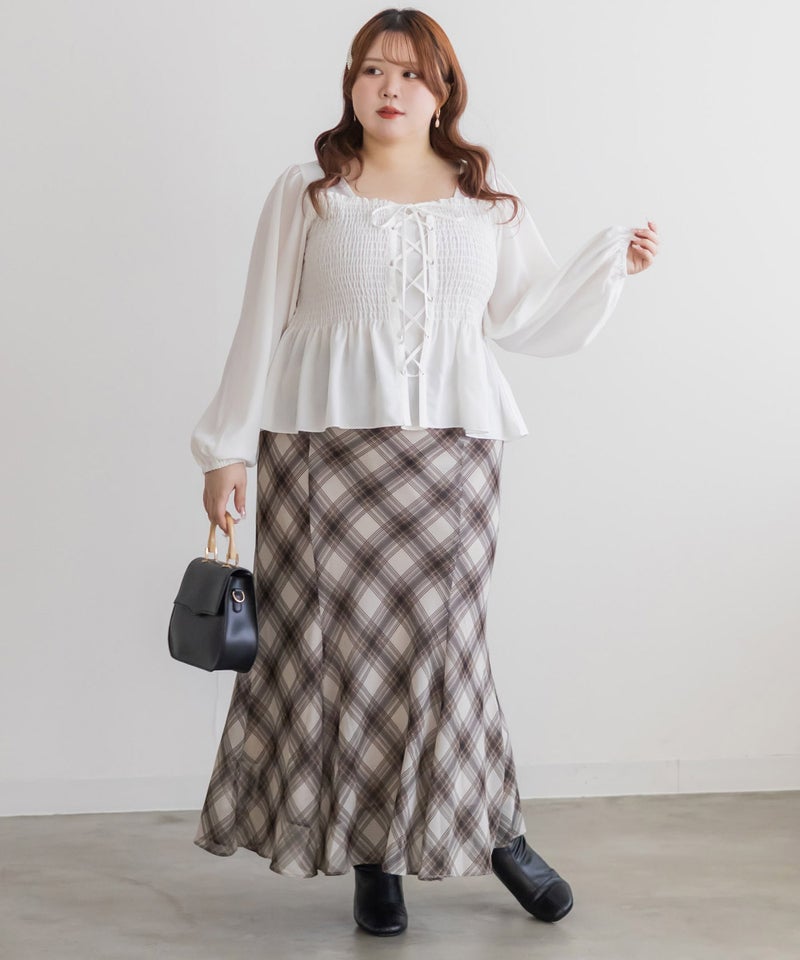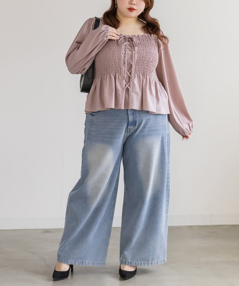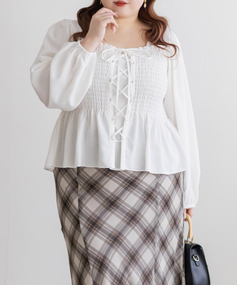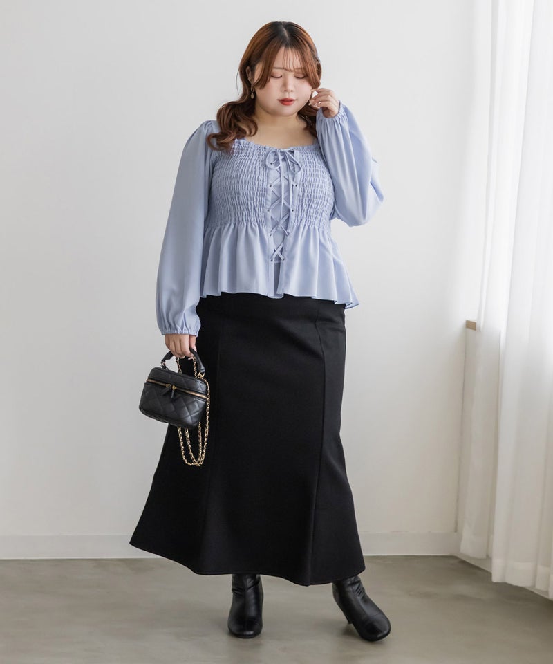 フロントのレースアップデザインが目線を上に集めてくれて、顔まわりも華やかな印象に♪ ふんわり広がるシルエットでお腹まわりや腰まわりもしっかりカバーできました。