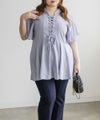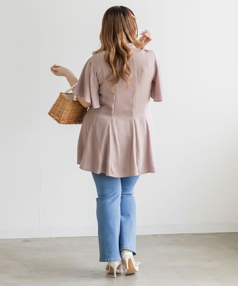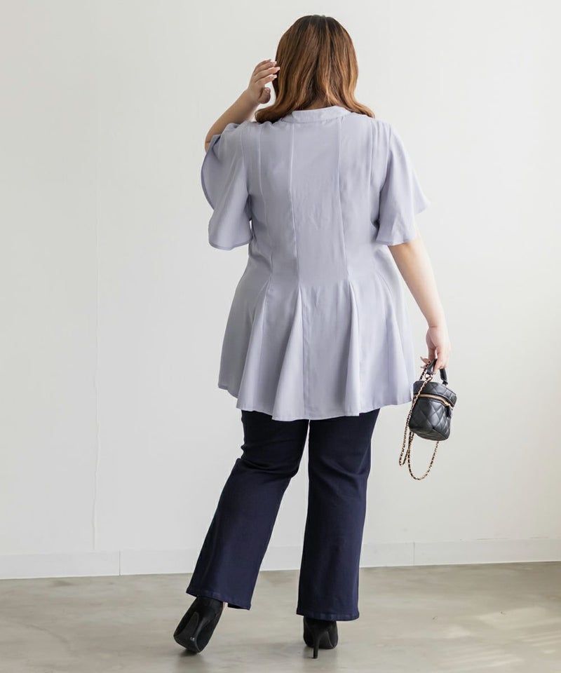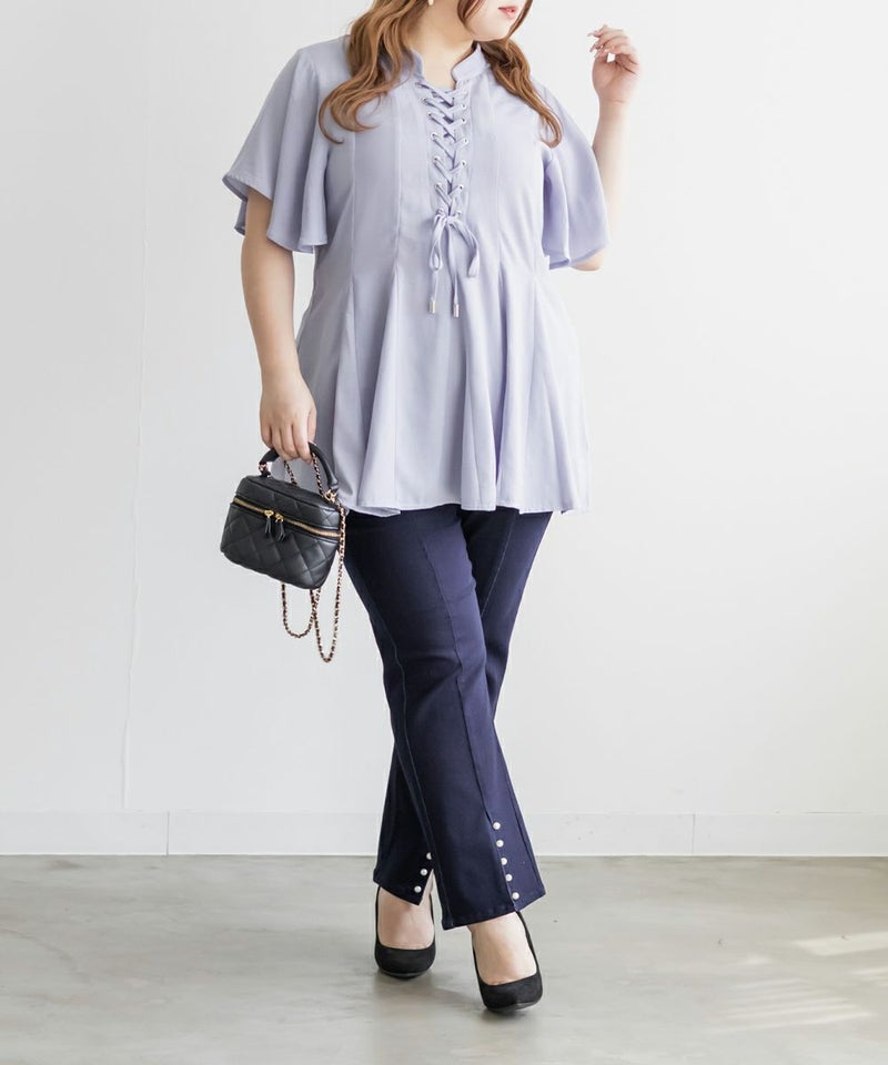 3Lサイズでぴったりしすぎず、ゆとりもある着心地でした。ゴムはないデザインなのですっきり見え抜群です!そではフレアになっていて、楽なのに華奢見え&涼しいです!ウエストのレースアップでメリハリのあるシルエットが叶う、華やかブラウス♪切替でペプラムの広がりを演出する、美しいブラウスです!ふわっと広がり、くびれはある印象なのに気になるお腹や腰まわりも自然にカバーしてくれるのが嬉しいです◎デニムを合わせてカジュアルに、スカートでガーリーにも着回せる万能アイテムです!