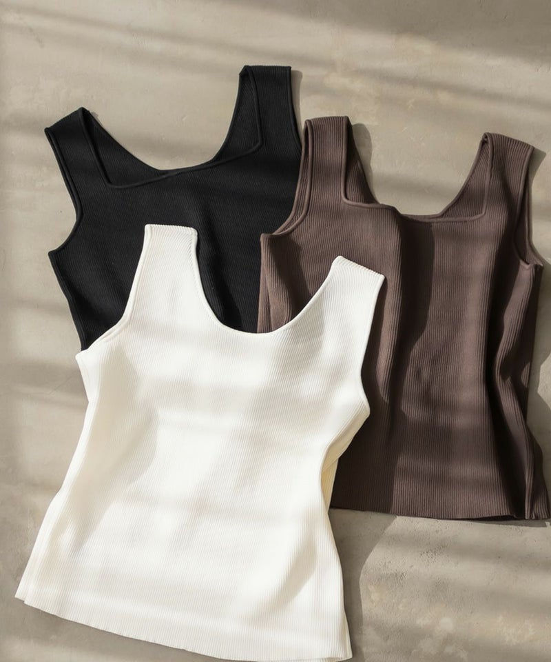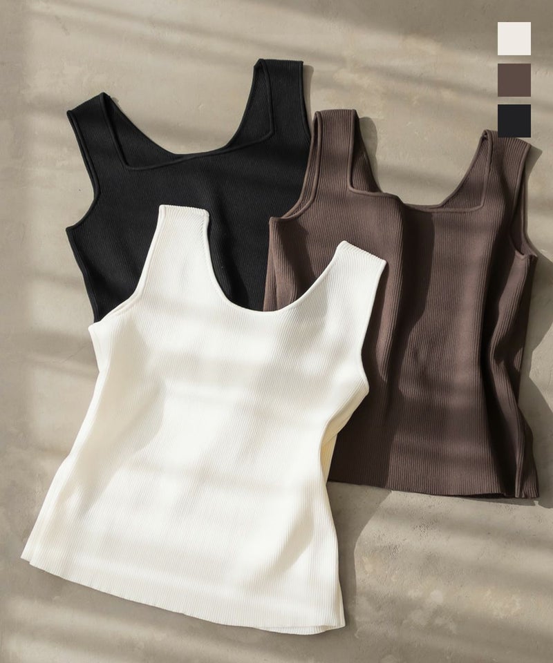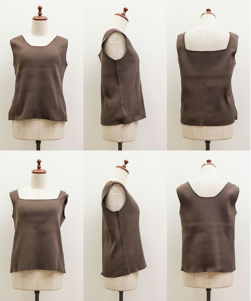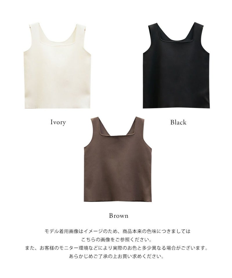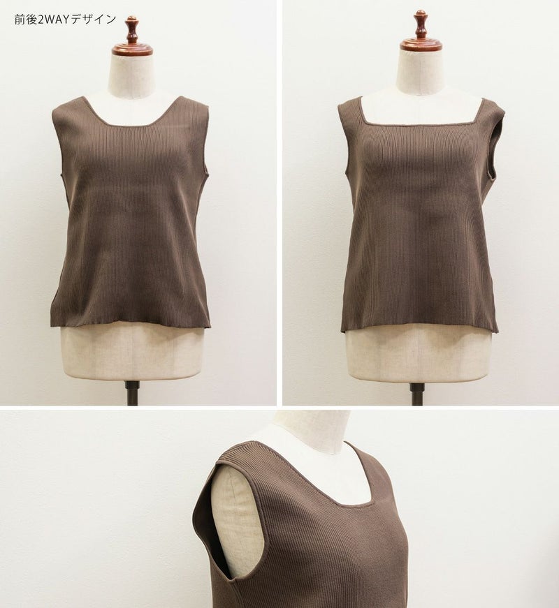 スクエアネックとクルーネックの前後2WAYで変化できるニットタンクトップ。カットソーよりも上品にコーディネートに使えるてコーディネートの幅が広がる1枚。