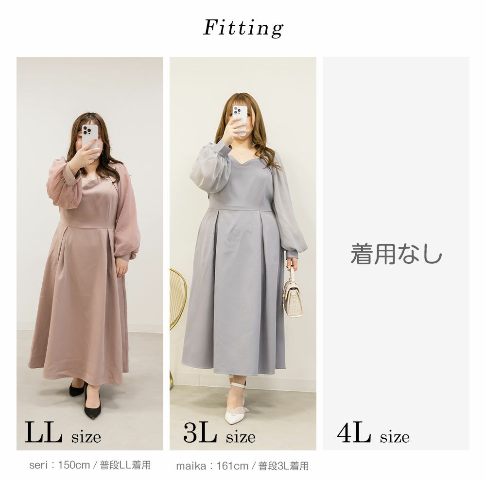 3Lを着て丁度いいサイズでした。襟が綺麗なラインで開いていて女性らしさたっぷりのデザインです。胸元がどちらかというと見えやすいので、あまり強調したくない方にはお勧めできないかもしれません。袖は上品な透け感でふんわりとしたボリューム感がとにかく可愛いです♪透けすぎなくて二の腕が気にならないのも嬉しいです!ウエスト切替でタックもあるから、お腹周りや腰周りが全く目立たずに着る事が出来ました◎女性らしい部分はしっかり強調して、気になる部分は隠してくれる、細かな部分まで考えられたワンピースです!
