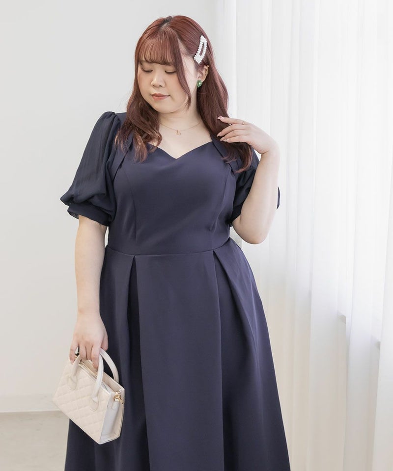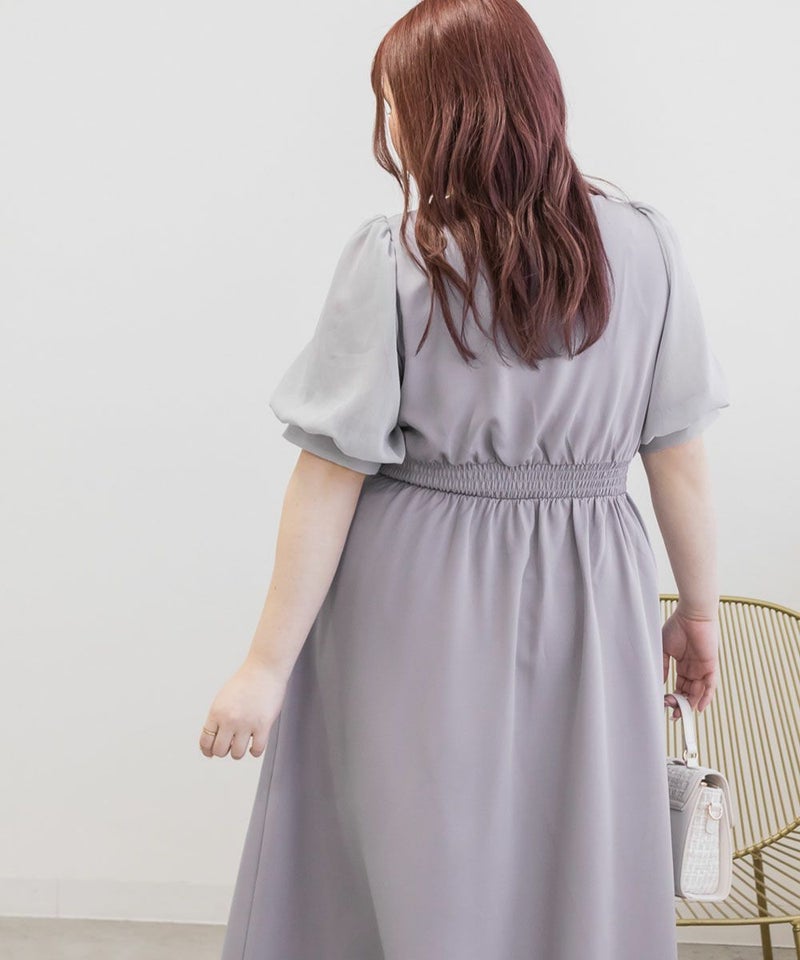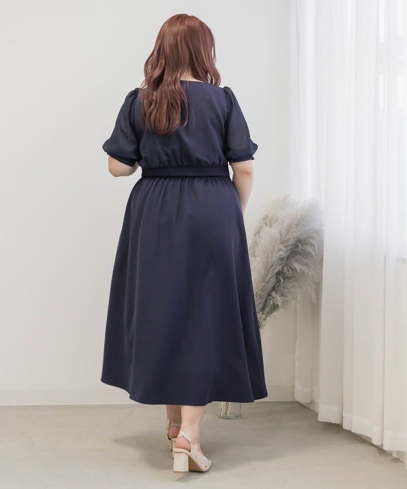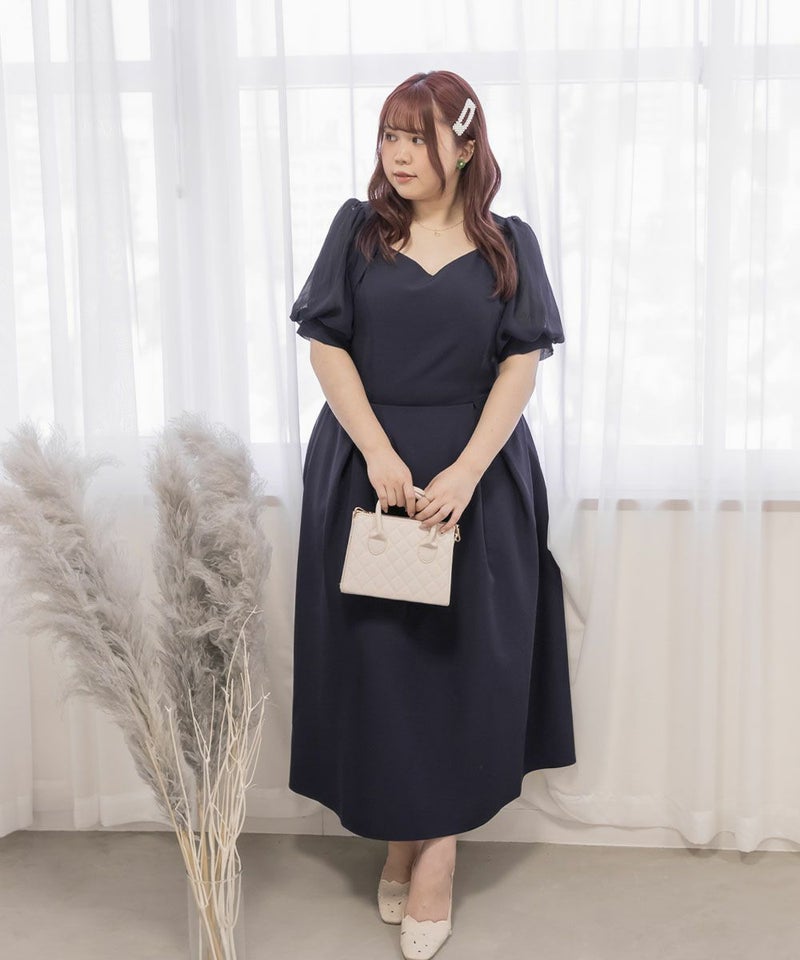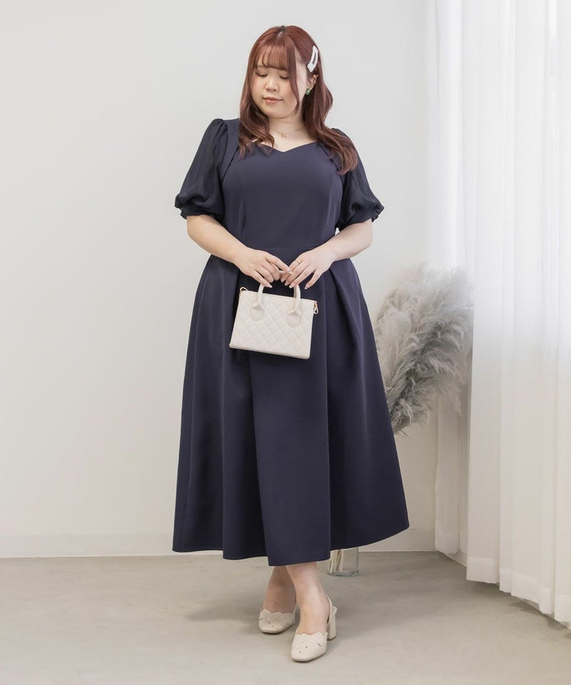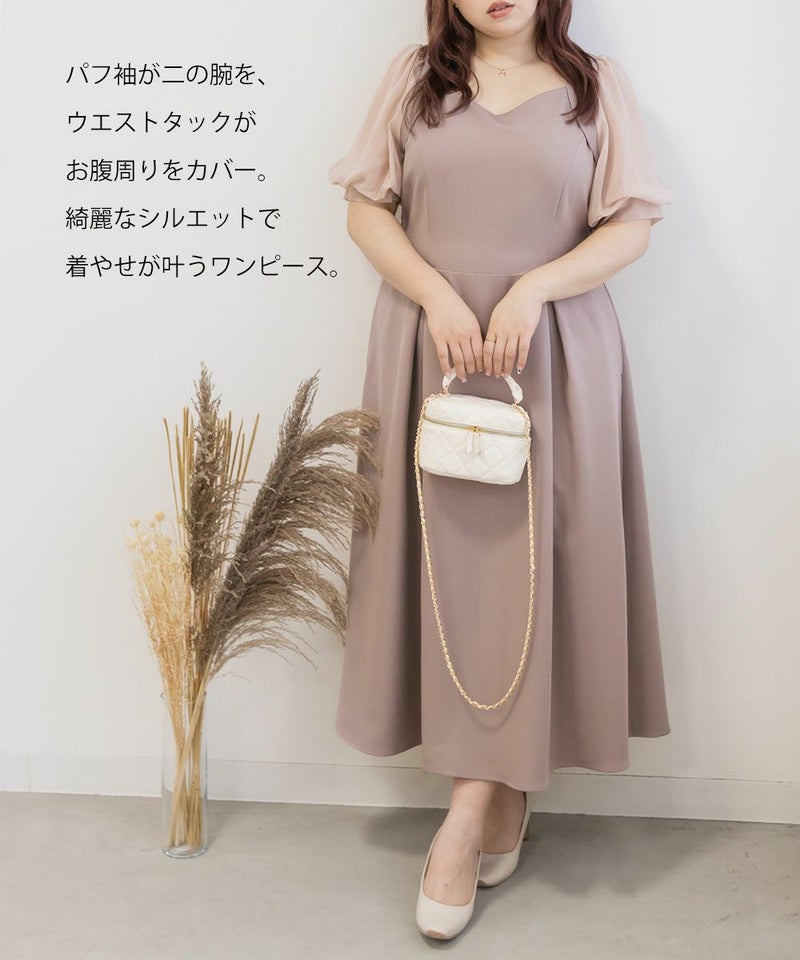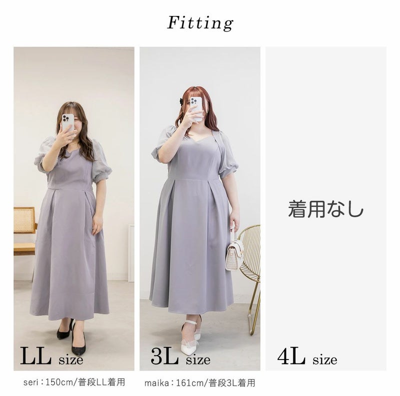 3Lを着てちょうどいいサイズでした。顔回りすっきりとしたとっても女性らしいデザインで、肩から袖口にかけてふんわりとしたパフスリーブだから、可愛いうえに、肩の丸みをカバーしつつ二の腕をしっかり隠してくれます。袖がほんのり透けるシアー素材なのも可愛いです。上品な雰囲気で、二次会やちょっときちんと感が必要な華やかなシーンなどにもおすすめです◎ウエストのボックスタックがお腹周りもしっかりカバーします!着るだけで美人度が上がるワンピースです♪