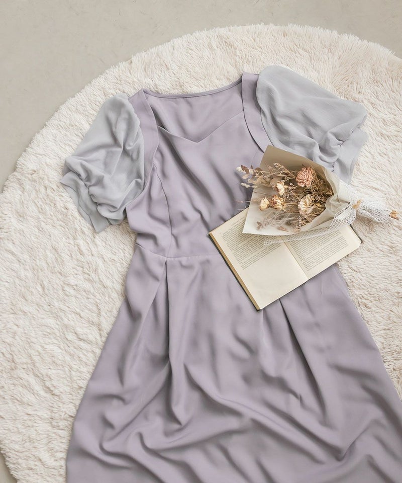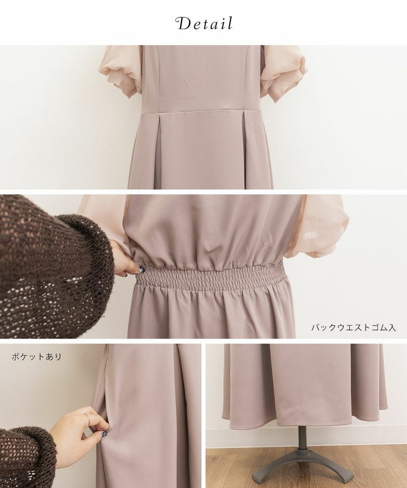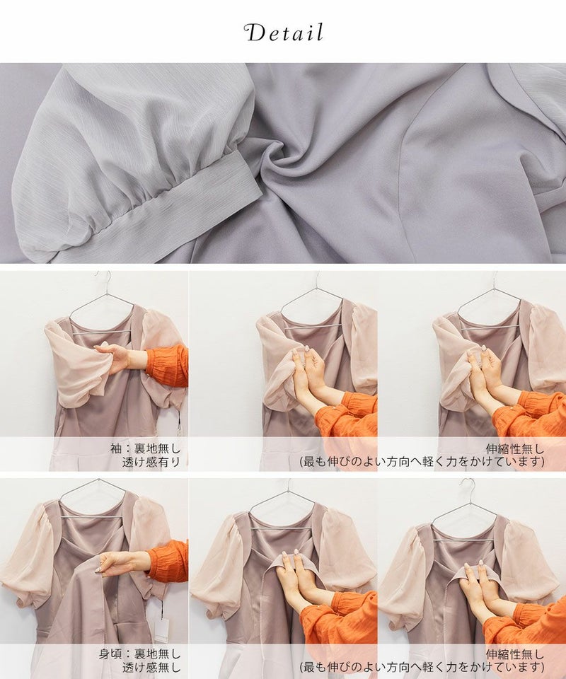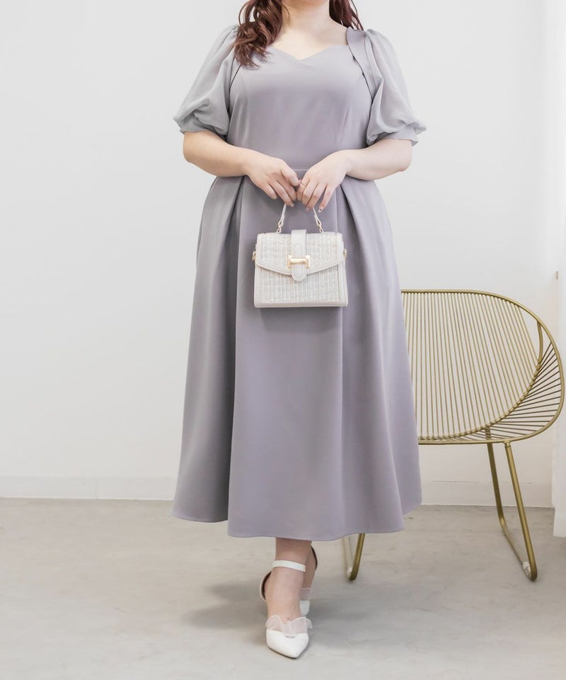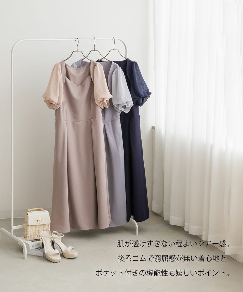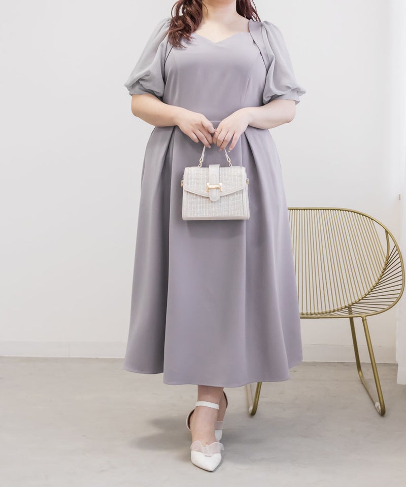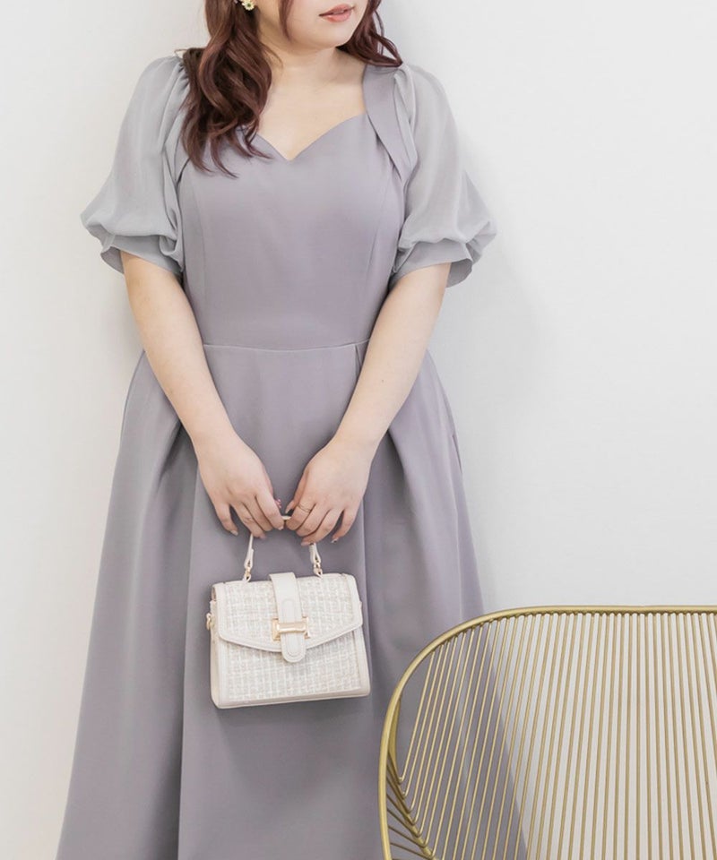 3Lを着てちょうどいいサイズでした。顔回りすっきりとしたとっても女性らしいデザインで、肩から袖口にかけてふんわりとしたパフスリーブだから、可愛いうえに、肩の丸みをカバーしつつ二の腕をしっかり隠してくれます。袖がほんのり透けるシアー素材なのも可愛いです。上品な雰囲気で、二次会やちょっときちんと感が必要な華やかなシーンなどにもおすすめです◎ウエストのボックスタックがお腹周りもしっかりカバーします!着るだけで美人度が上がるワンピースです♪