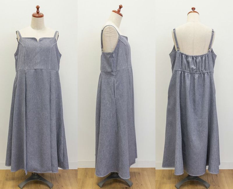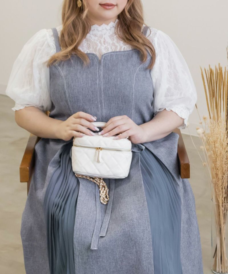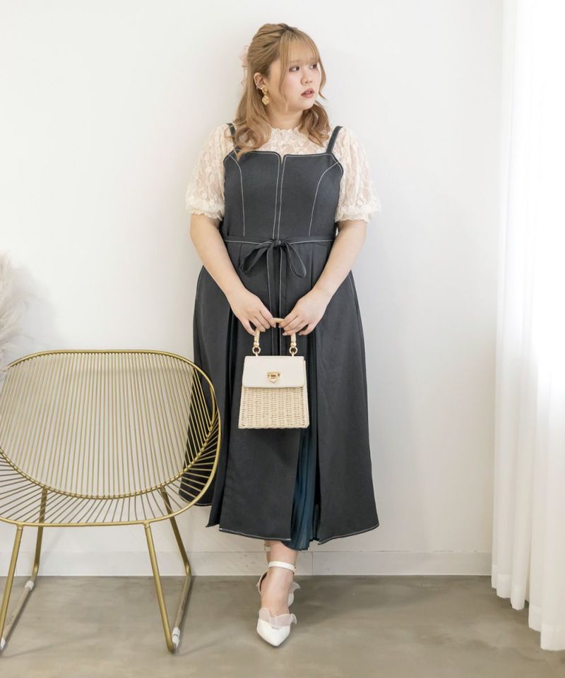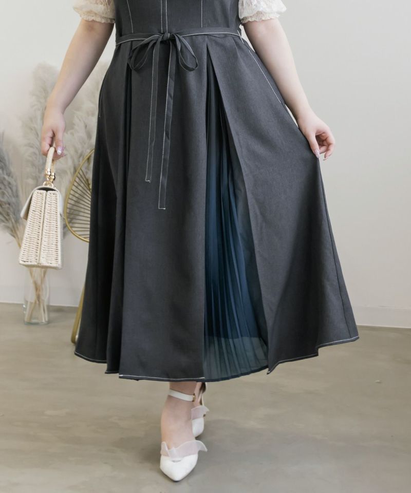 3Lを着てちょうどいいサイズでした。フィット&フレアシルエットで、配色ステッチやウエストリボン、プリーツ切替の縦長効果で着やせ効果の高いデザインです!着心地も窮屈感はまりません◎プリーツは動くと見えるような感じで、派手にならずにアクセントになっています。胸元のV切替もさりげないけど可愛いです♪