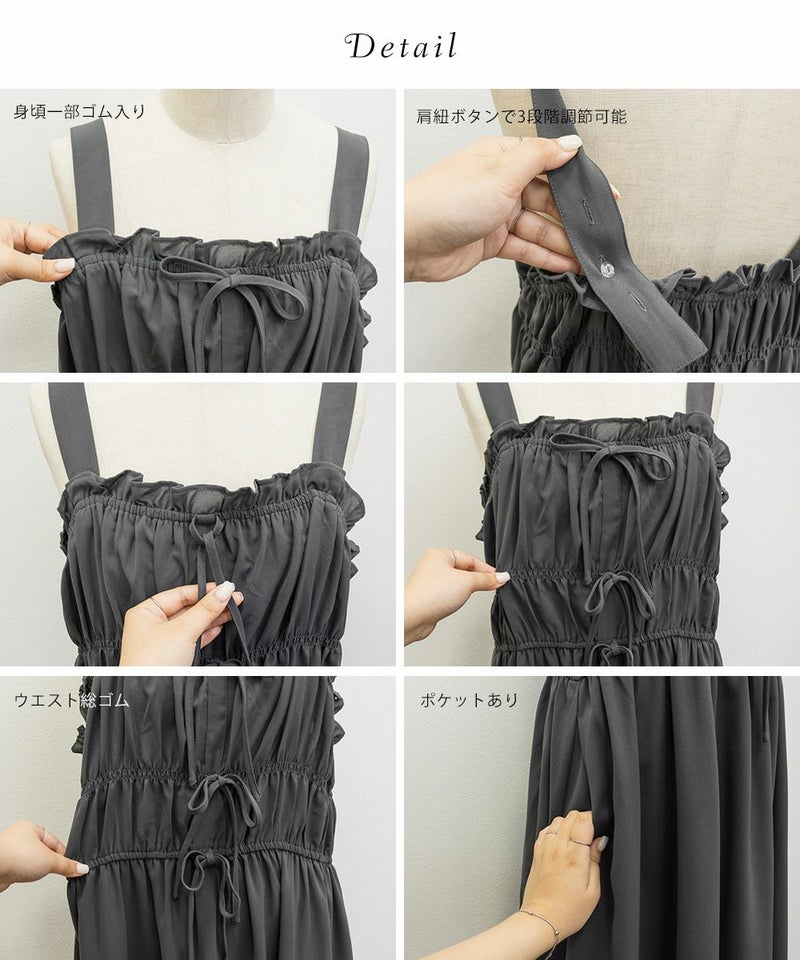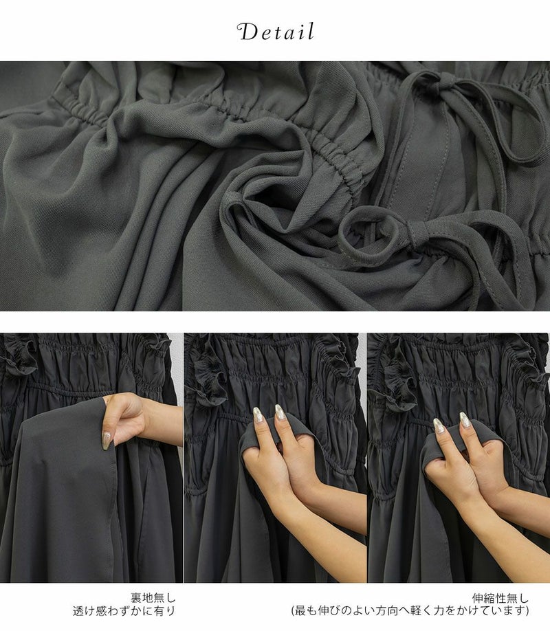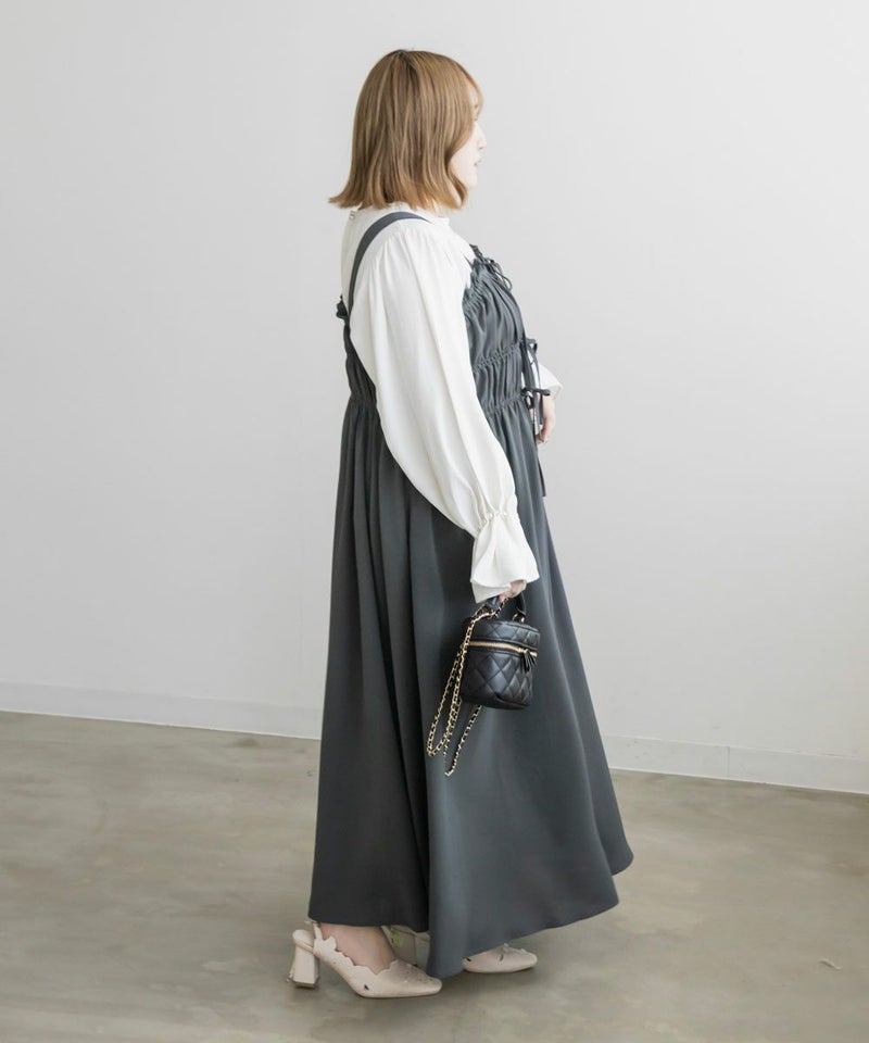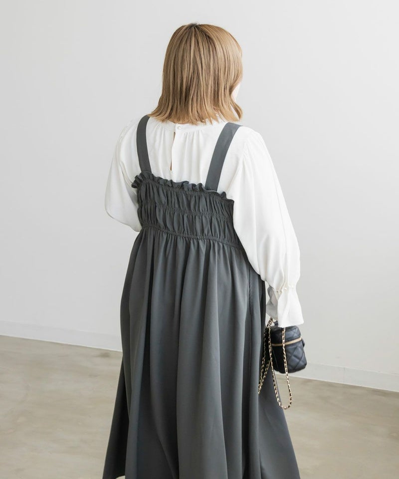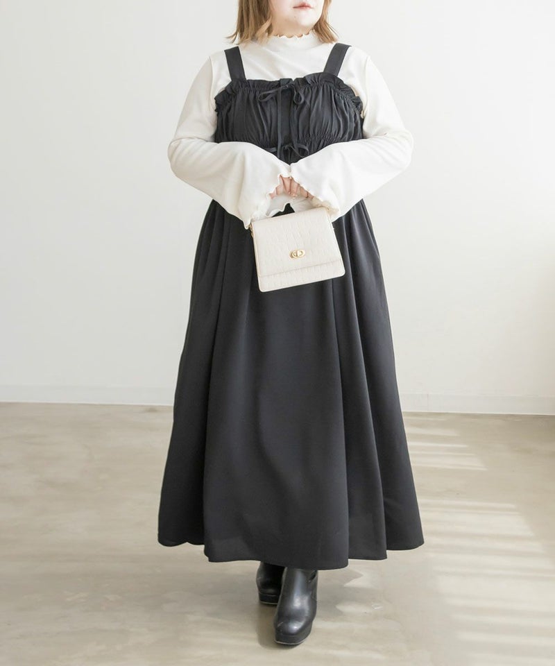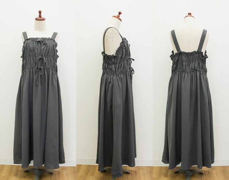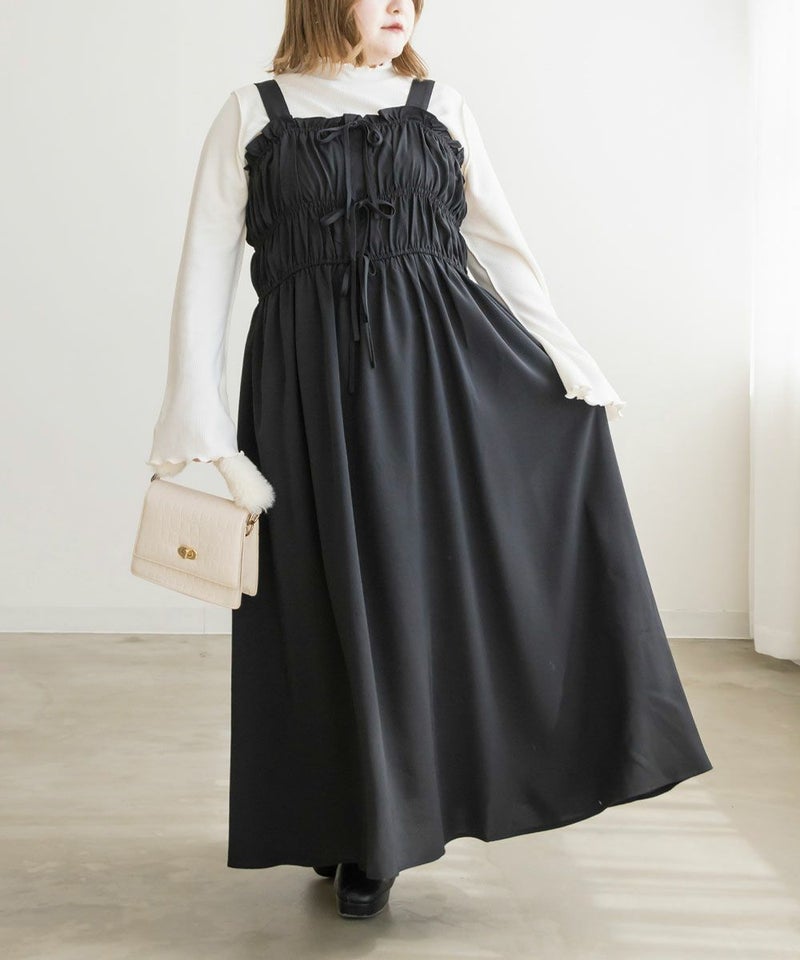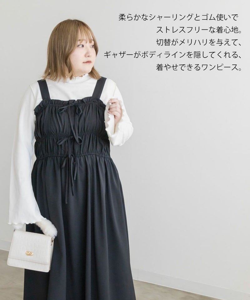 LLを着て程よいサイズ感でした!低身長の私で足首が隠れるくらいの着丈で、スニーカーと合わせても床に擦ることは無さそうでした。低身長の方も高身長の方も問題なく着ることができそうです!上半身はシャーリング仕様になっていて、伸びるので楽ちんな着心地。ギャザーがたっぷり入ったデザインが可愛くて、体型をカバーしてくれます。スカート部分はフレアに広がるので、お腹やお尻も綺麗に隠せる着やせできるワンピース!季節関係なく使える生地で、嫌みが無い好感度の高いデザインだから、デート、友達や家族とのお出かけにも、色々なシーンに着ていきたくなる1枚です♪