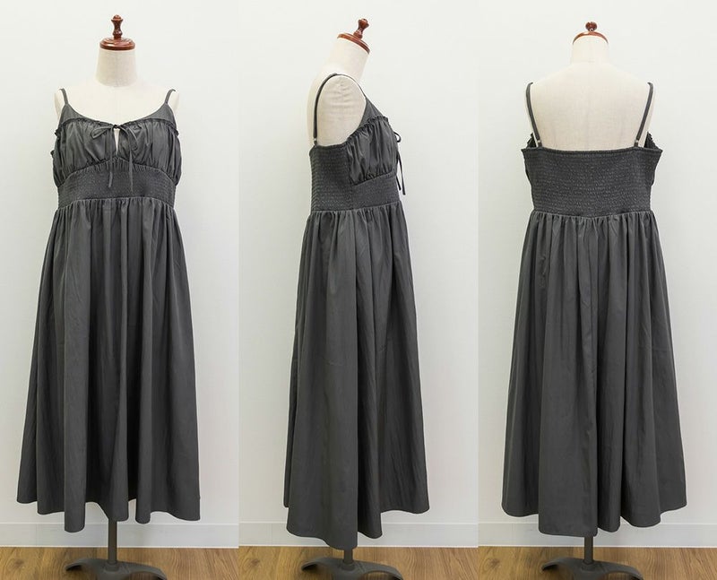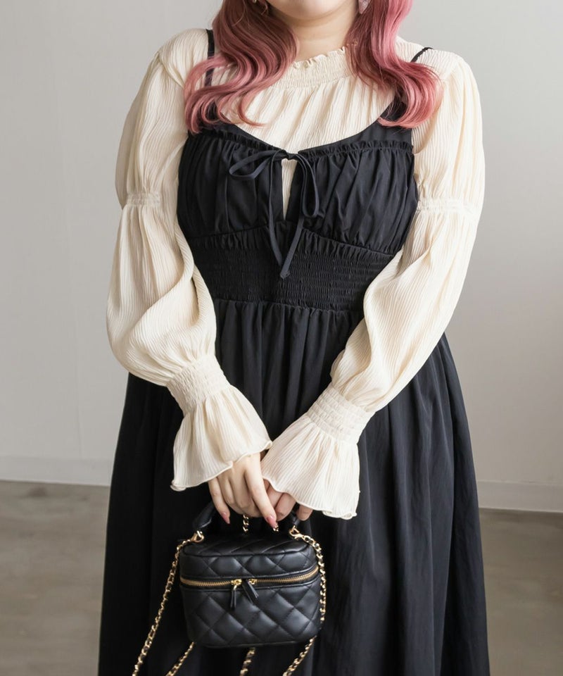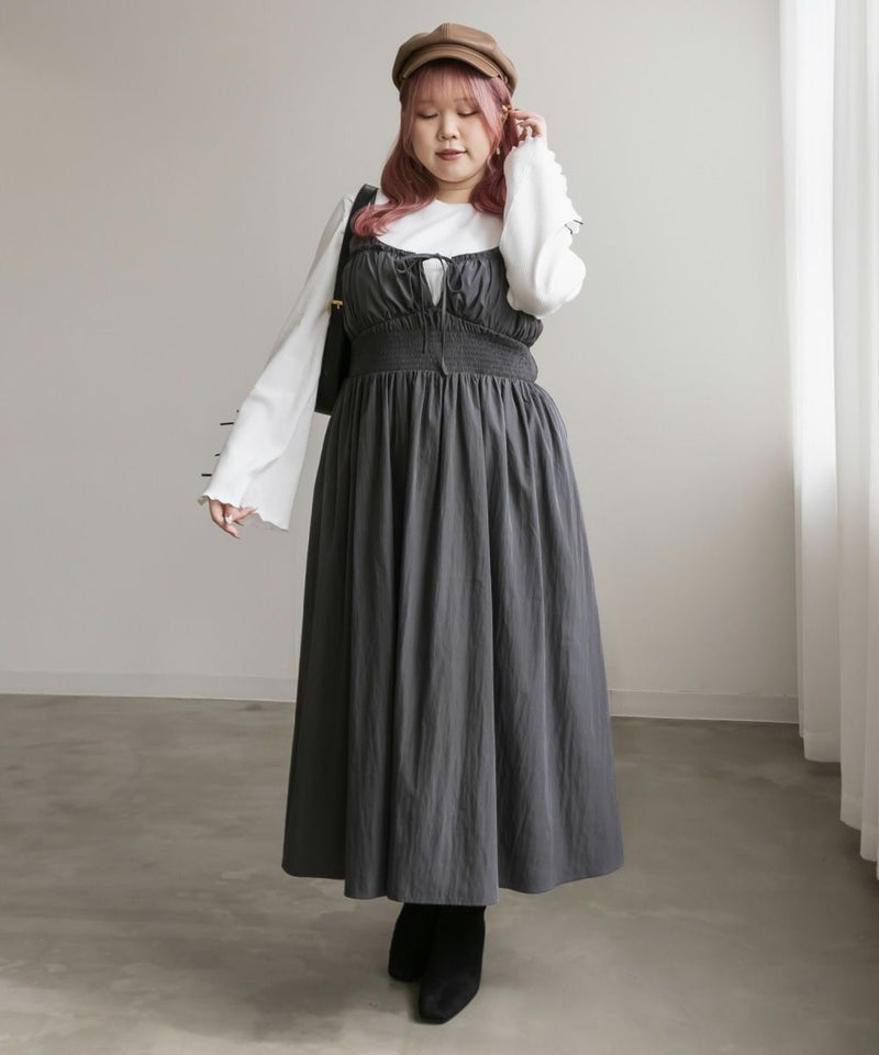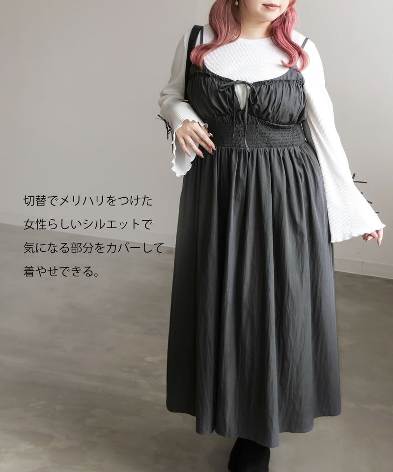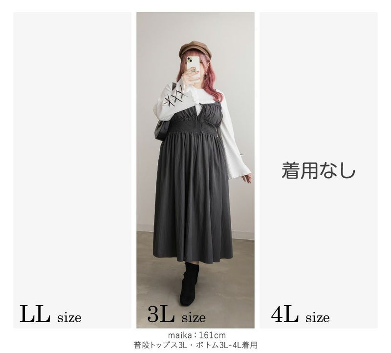 3Lを着てちょうどいいサイズ感でした!上半身はリボンとギャザーがたっぷりあしらわれていて可愛い!胸下の切替が斜めに入っていてコンパクトに見えるのがポイント!ウエスト部分と背中が全面シャーリングゴムになっていてとっても楽ちんで、後ろ姿もすっきりして見えます◎ウエストからフレアに広がるので、お腹やお尻も綺麗に隠して着やせできるワンピースです♪季節関係なく使える軽い生地なのでコンパクトになり旅行にもおすすめです!季節問わず使えてインナーを変えて色々なコーディネートに着回しできます!