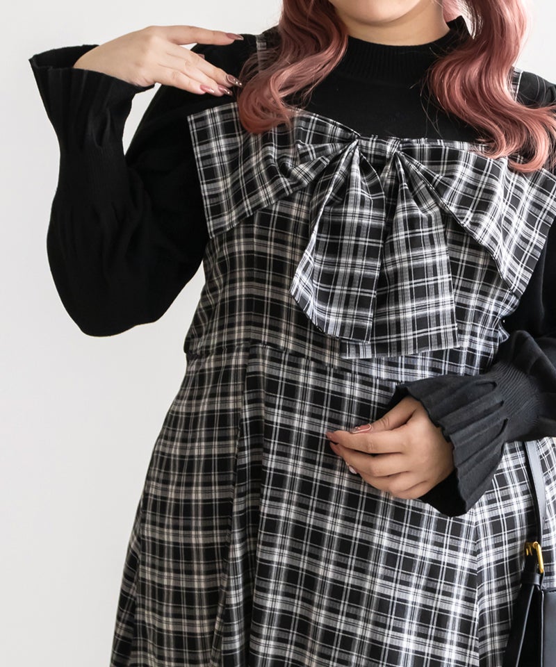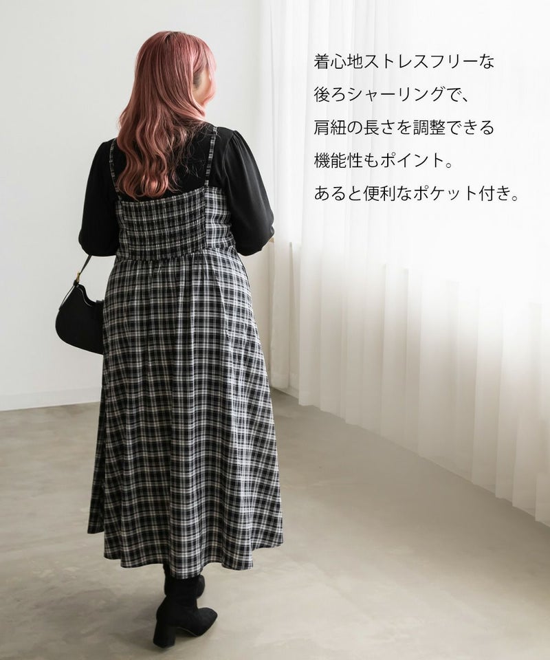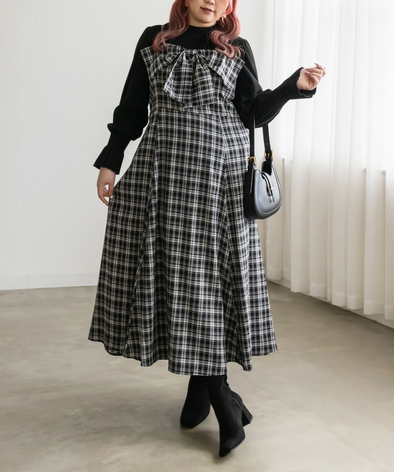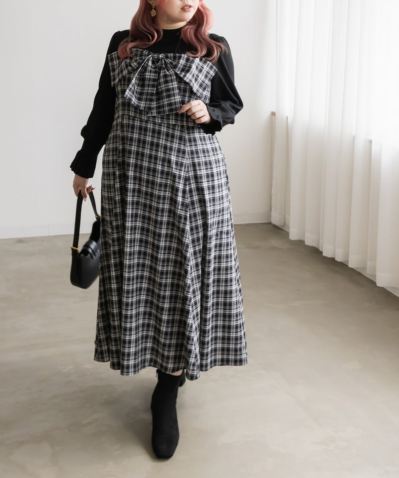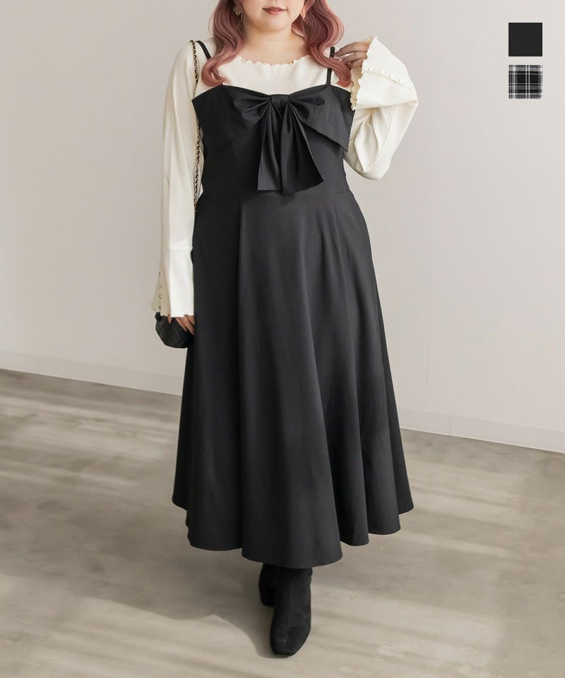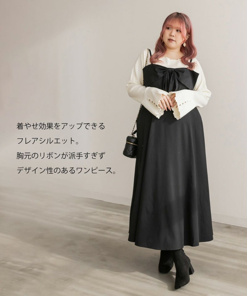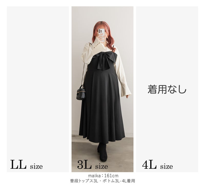3Lを着て丁度いいサイズでした。後ろシャーリングが窮屈感なく身体にフィットして、ウエストからフレアに広がってくれるから、お腹やお尻を隠しつつ着やせできます◎大き目のリボンがついたデザインが可愛くて着映えします♪リボンがあることによってボディラインをカバーしてくれるだけでなく小顔に見える視覚効果もあります!インナーを変えてオールシーズン使えるワンピースです!