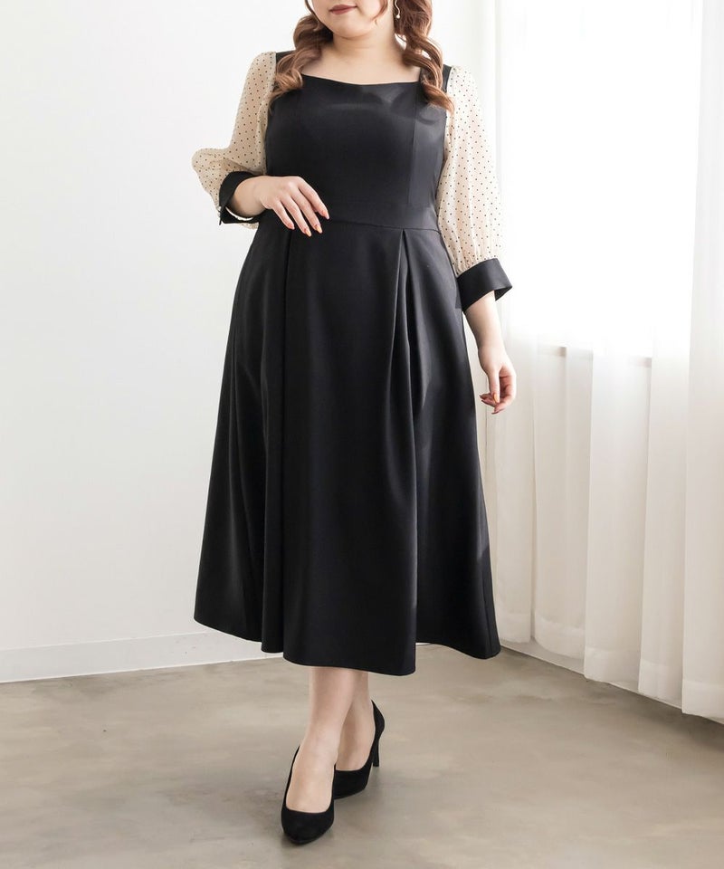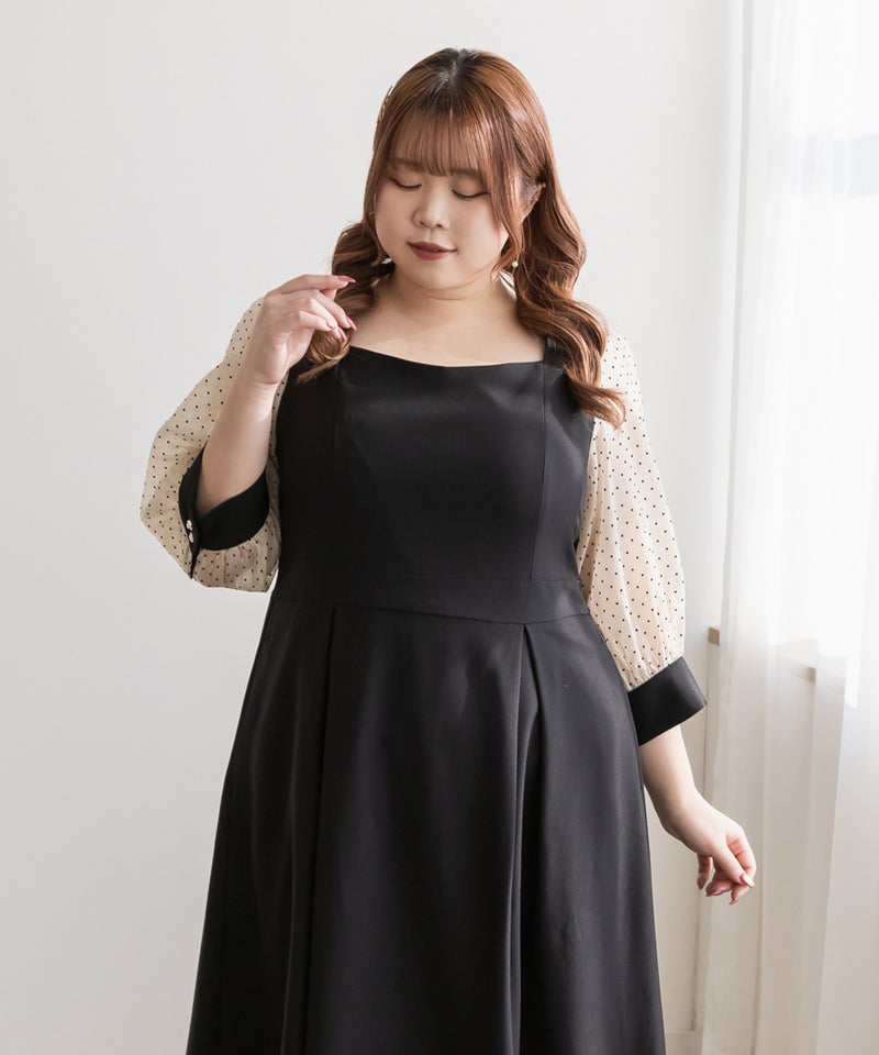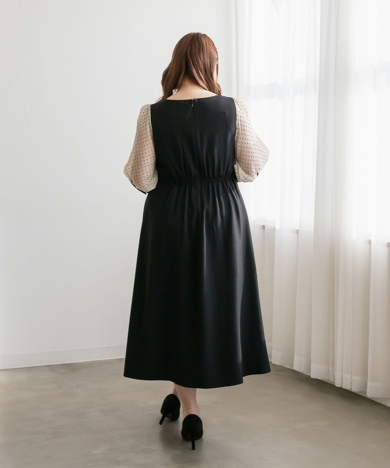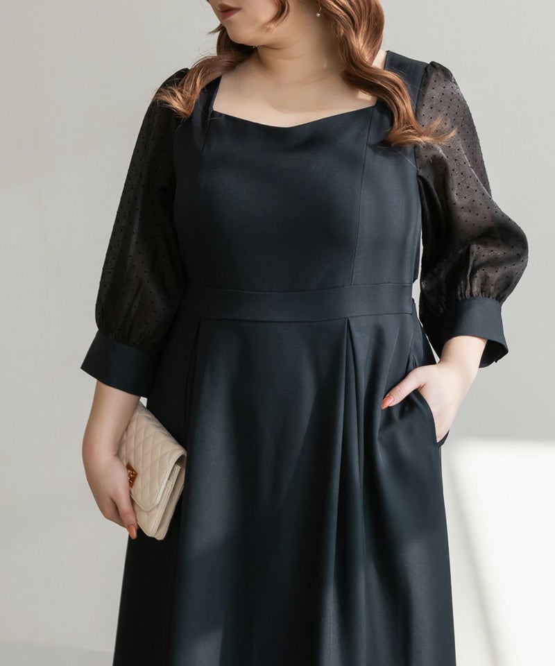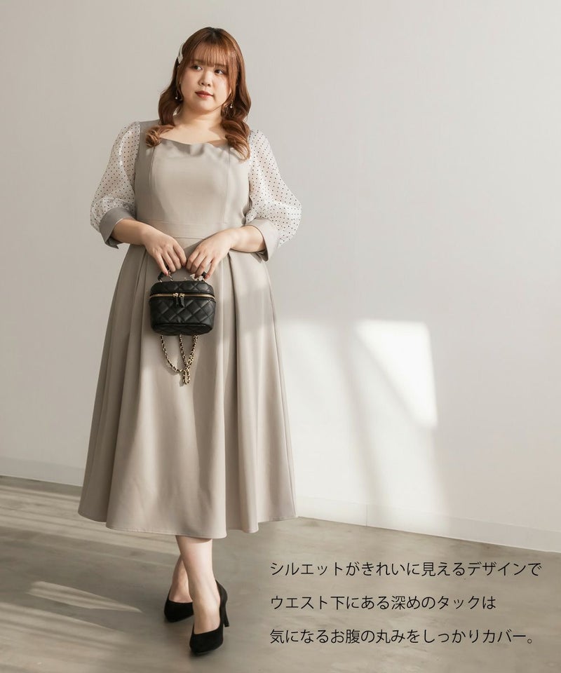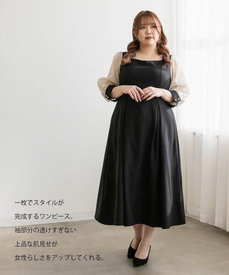 3Lを着て丁度いいサイズでした。ネック周りが綺麗なラインで開いていて女性らしさたっぷりのデザインです◎胸元がどちらかというと見えやすいので、あまり強調したくない方にはお勧めできないかもしれません。袖は上品な透け感でふんわりとしたボリューム感がとにかく可愛いです♪ドット柄なのもあって透けすぎなくて二の腕が気にならないのも嬉しいです!ウエスト切替でタックもあるから、お腹周りや腰周りが全く目立たずに着る事が出来ました◎女性らしい部分はしっかり強調して、気になる部分は隠してくれる、細かな部分まで考えられたワンピースです!普段使いはもちろん、特別なお出かけやセミオケージョンにもおすすめな1枚!小物使いで印象が変わるのでコーディネートの幅が広がります!