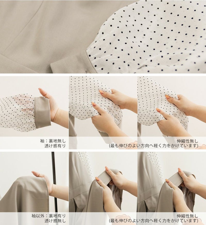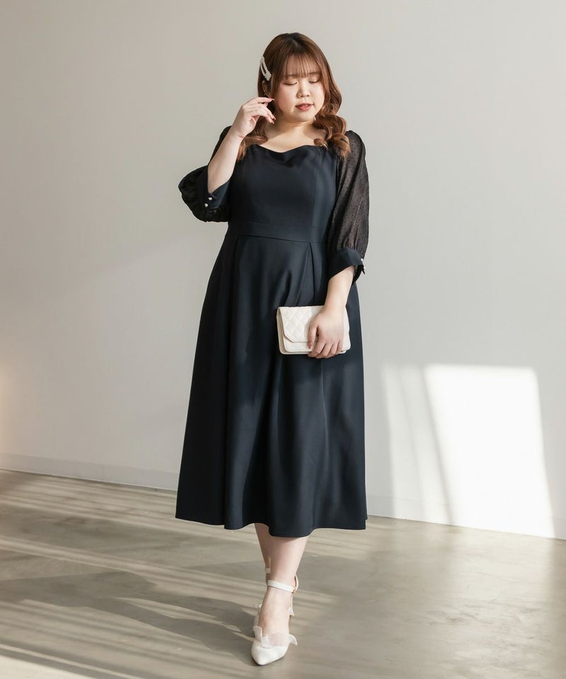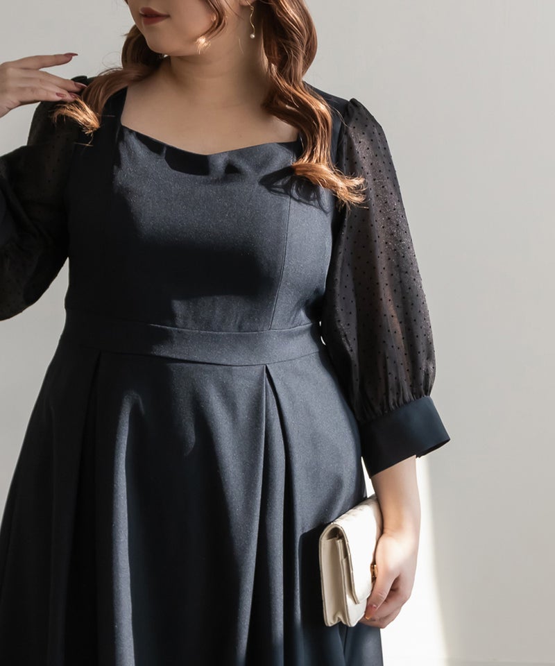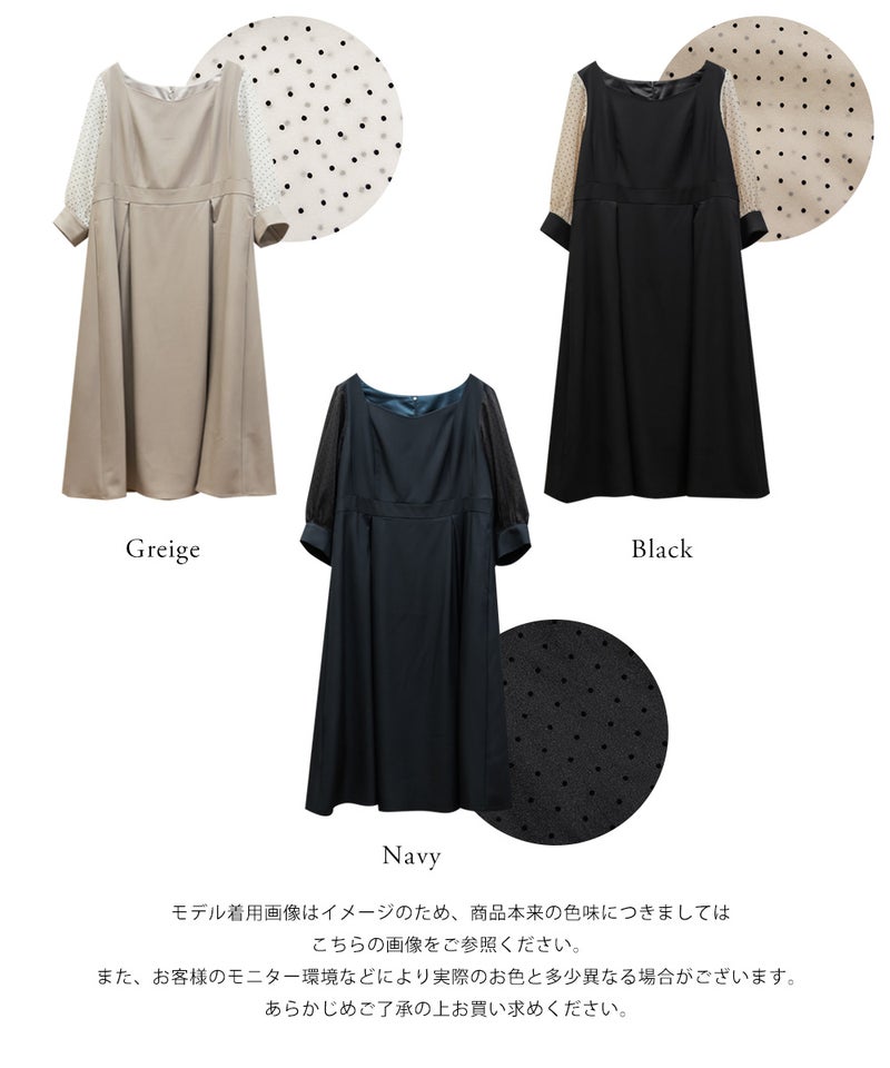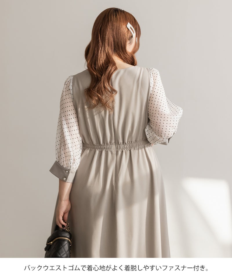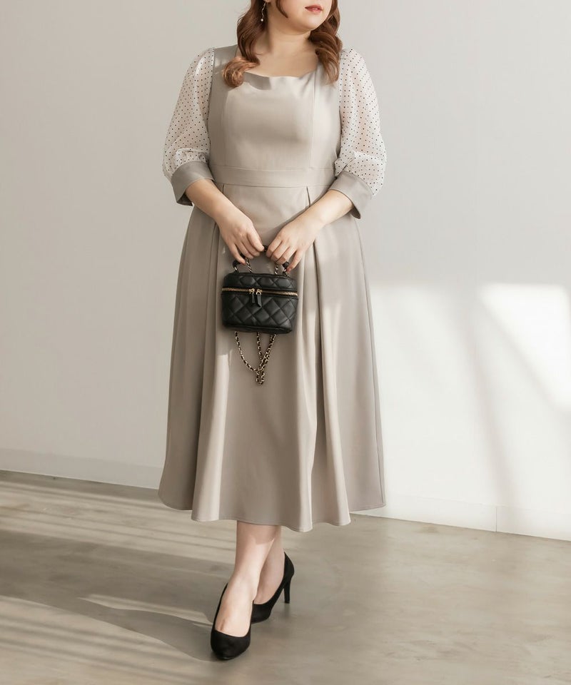 3Lを着て丁度いいサイズでした。ネック周りが綺麗なラインで開いていて女性らしさたっぷりのデザインです◎胸元がどちらかというと見えやすいので、あまり強調したくない方にはお勧めできないかもしれません。袖は上品な透け感でふんわりとしたボリューム感がとにかく可愛いです♪ドット柄なのもあって透けすぎなくて二の腕が気にならないのも嬉しいです!ウエスト切替でタックもあるから、お腹周りや腰周りが全く目立たずに着る事が出来ました◎女性らしい部分はしっかり強調して、気になる部分は隠してくれる、細かな部分まで考えられたワンピースです!普段使いはもちろん、特別なお出かけやセミオケージョンにもおすすめな1枚!小物使いで印象が変わるのでコーディネートの幅が広がります!