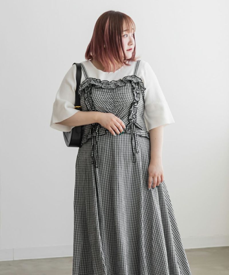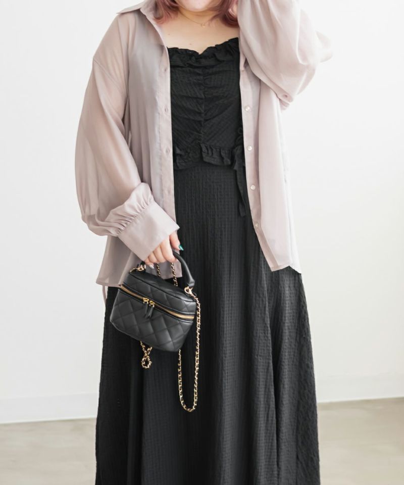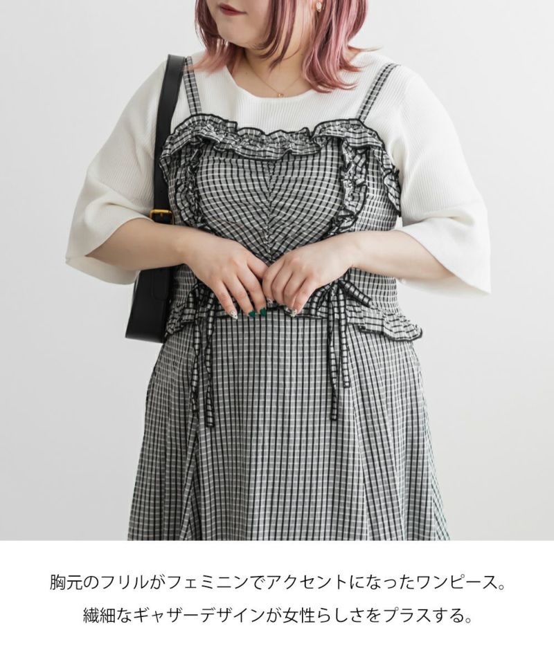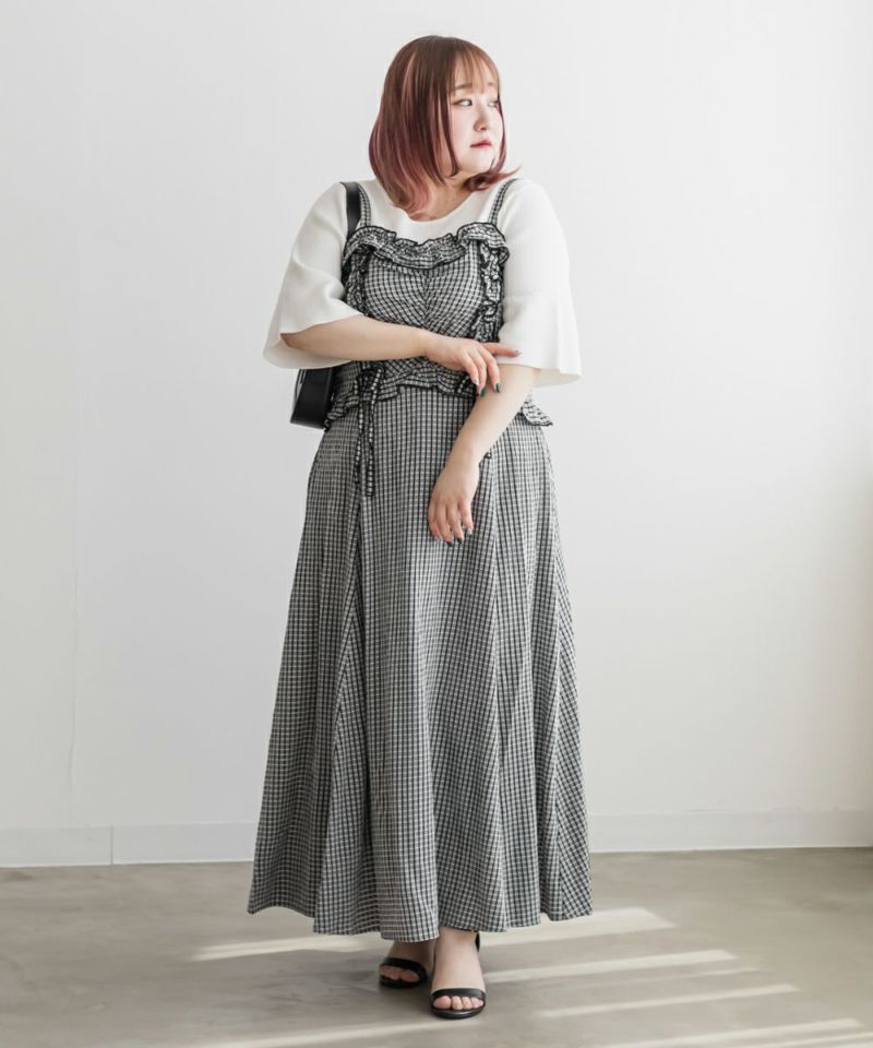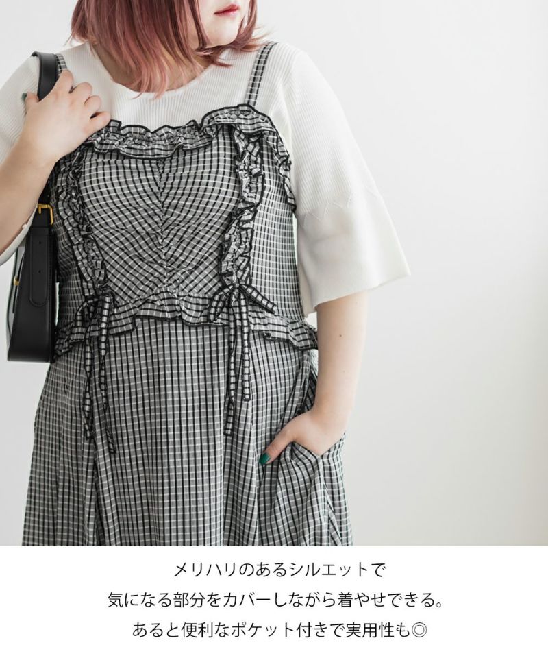 3Lサイズを着用しました。肩紐で長さが調整できるので、身長に合わせてバランスよく着られてちょうどよかったです◎ 身幅にもゆとりがあり、締め付け感なく楽な着心地なのに、広がりすぎないシルエットで大人っぽく着られるのがうれしいポイント♪ 胸元のフリルデザインが存在感があって、シンプルなインナーに合わせるだけでコーデが華やかになります。 光沢感のある素材で高見えするので、おでかけやお食事などちょっと特別な日にもぴったり!