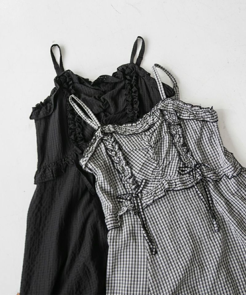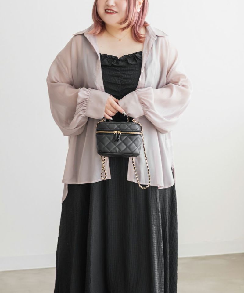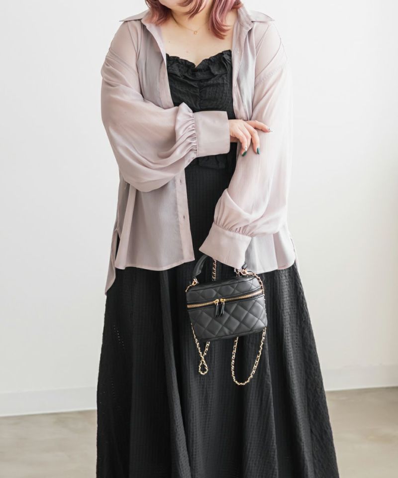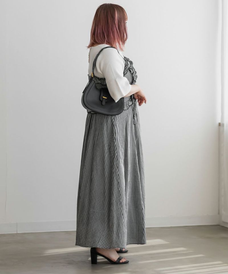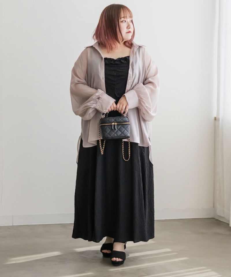 3Lサイズを着用しました。肩紐で長さが調整できるので、身長に合わせてバランスよく着られてちょうどよかったです◎ 身幅にもゆとりがあり、締め付け感なく楽な着心地なのに、広がりすぎないシルエットで大人っぽく着られるのがうれしいポイント♪ 胸元のフリルデザインが存在感があって、シンプルなインナーに合わせるだけでコーデが華やかになります。 光沢感のある素材で高見えするので、おでかけやお食事などちょっと特別な日にもぴったり!