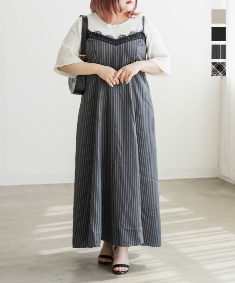 3Lサイズを着用しました。肩ひもはアジャスターで調節ができるので、自分の身長に合わせてバランスよく着ることができました◎ウエスト周りやヒップに程よくゆとりがあり、身体のラインを拾いすぎず、きれいなシルエットで着られました。繊細なレースが胸元に使われていて、フェミニンな雰囲気たっぷり♪ でも甘くなりすぎず、大人っぽく着こなせるのが嬉しいポイントです。季節を問わずインナー次第で着回しが効くのも魅力的です!Tシャツやブラウスとのレイヤードはもちろん、羽織を合わせてもレースが映えるので、1枚持っておくと本当に便利なアイテムだと思います◎