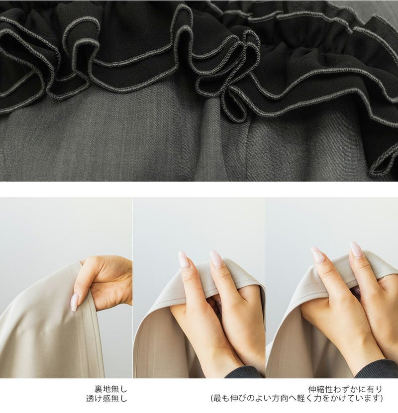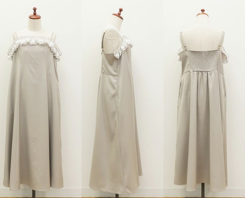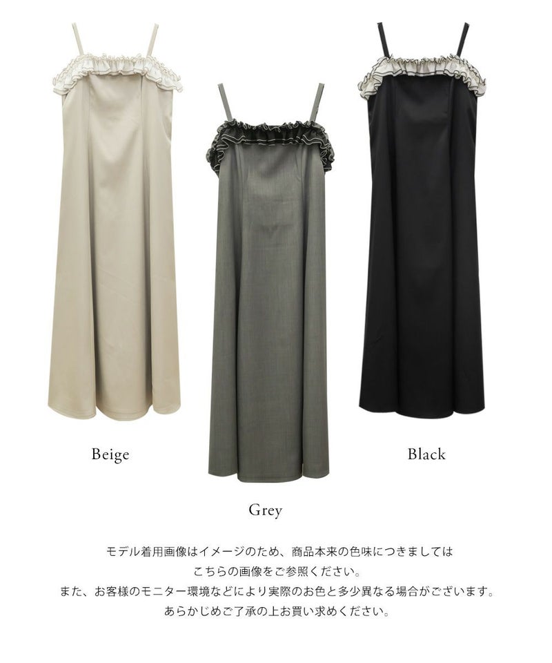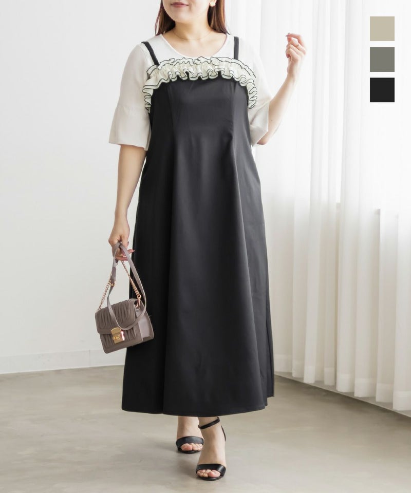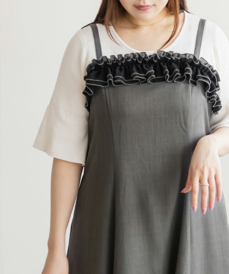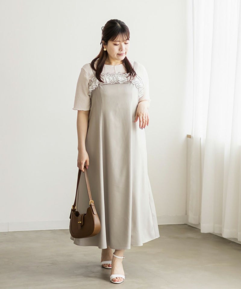 3Lを着て、ちょうどいいサイズ感でした。いつも通りの着心地です。ウエストに切替が無いすっきりしたシルエットなのに、キュッと締まって見えるデザインでとってもきれいでした◎胸元のフリルが他にないデザインで、春夏のシンプルな装いに可愛いアクセントをプラスしてくれます。華奢なシルエットだけど、窮屈感が無く、視覚効果でスタイルアップして見えるのが嬉しいポイントです♪肩ひもで長さが調整できるから、自分の体型に合わせてバランスを取れるのも◎さらっとした素材感も快適でした!インナー次第でロングシーズン使えそうなので、着回しが楽しみです♪