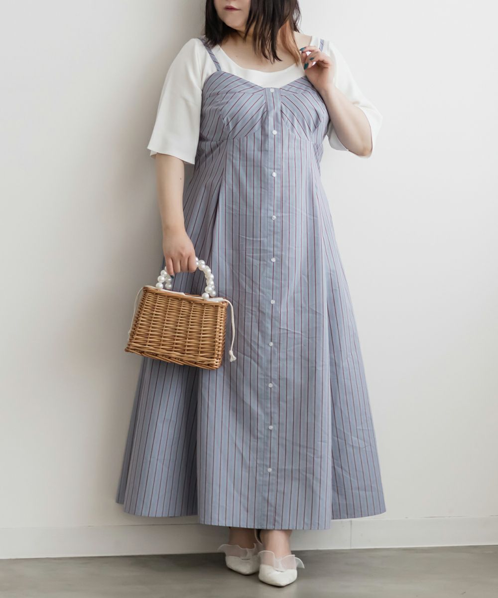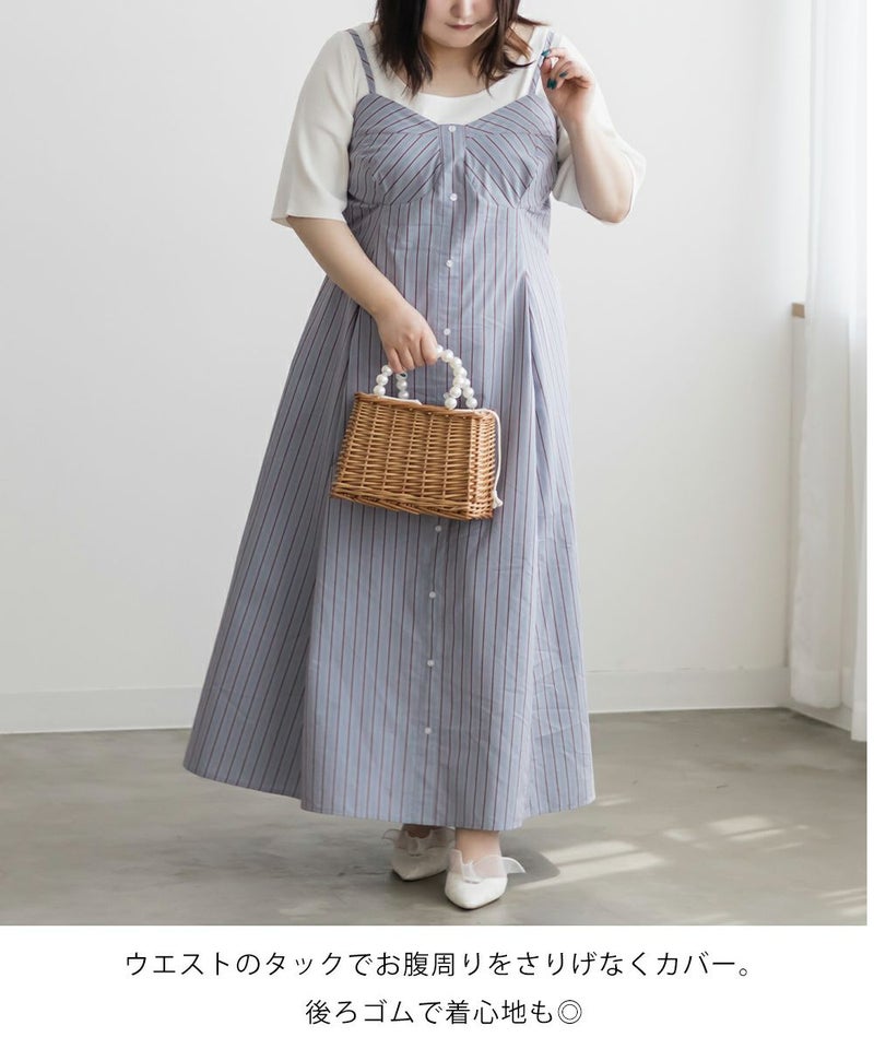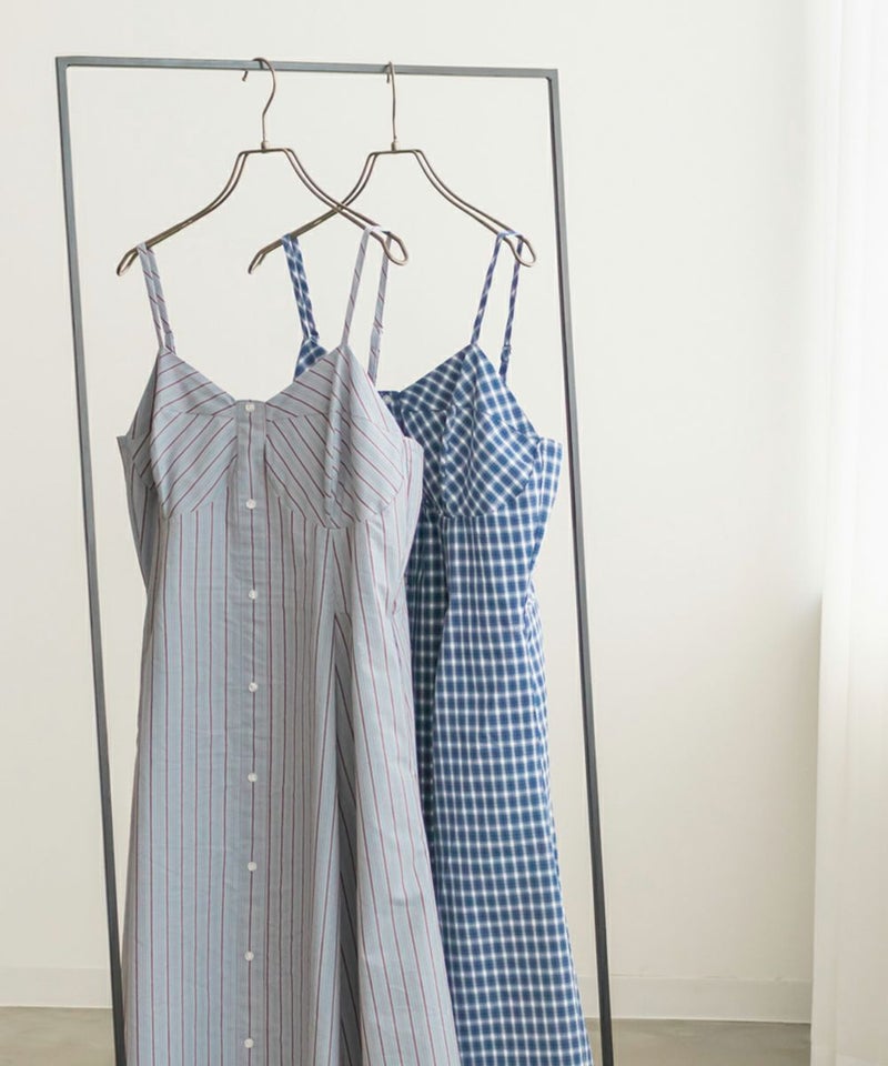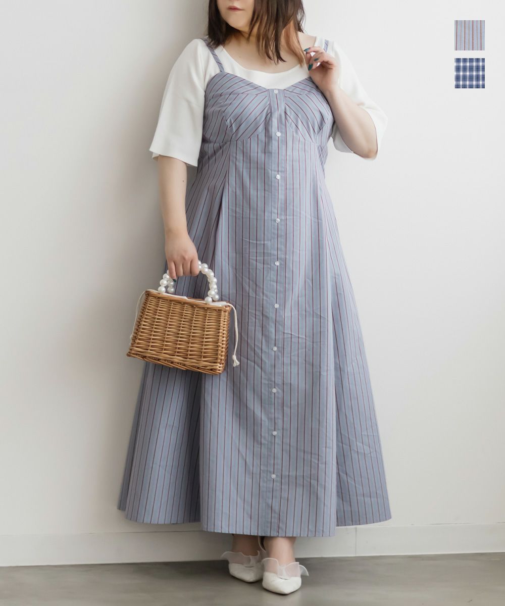 LLサイズを着用しましたが、着心地はちょうどよく、程よく身体のラインを拾わず安心感のあるサイズ感でした◎肩ひもはアジャスター付きで長さ調整できるので、低身長さんでもバランス良く着こなせるのが嬉しいポイント♪ウエストは自然にくびれて見える構築的なディティールでスタイルアップ見えも叶いました!フロントのボタンデザインが縦ラインを強調してくれるから、キャミワンピでも大人っぽく仕上がります。コルセットっぽい胸元のデザインが今っぽく、大人フェミニンに着こなせます♪トレンド感のあるストライプとチェックの展開で、あわせるアイテムによってカジュアルにもガーリーにもなれちゃいます!インナーを変えれば季節を問わず着回せる万能アイテムです♪