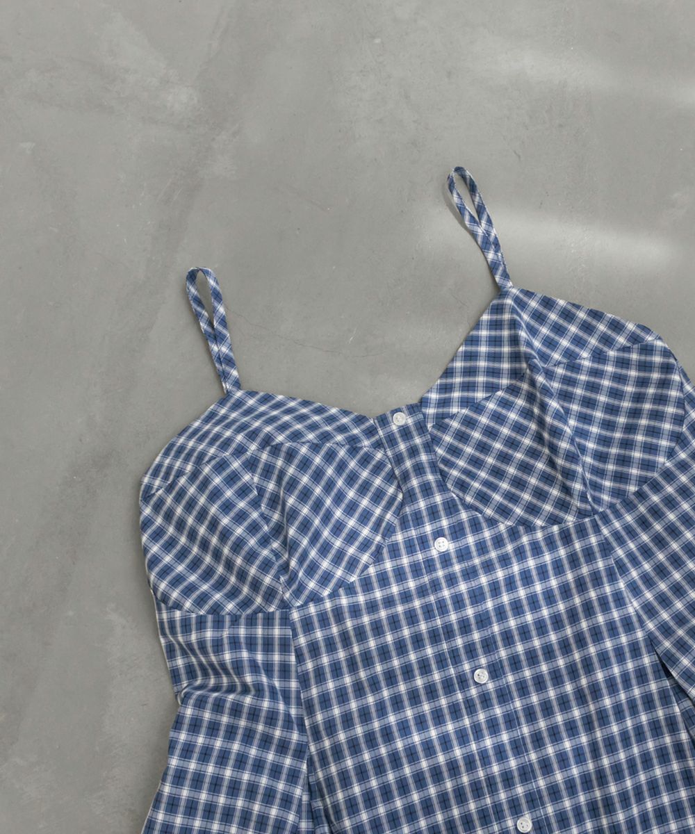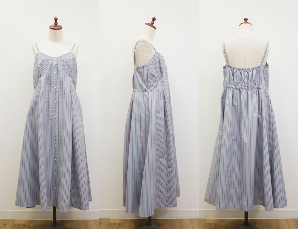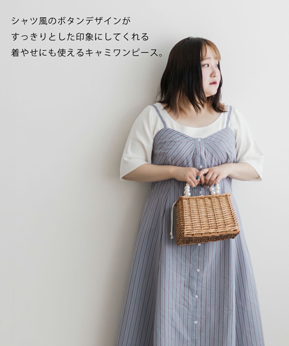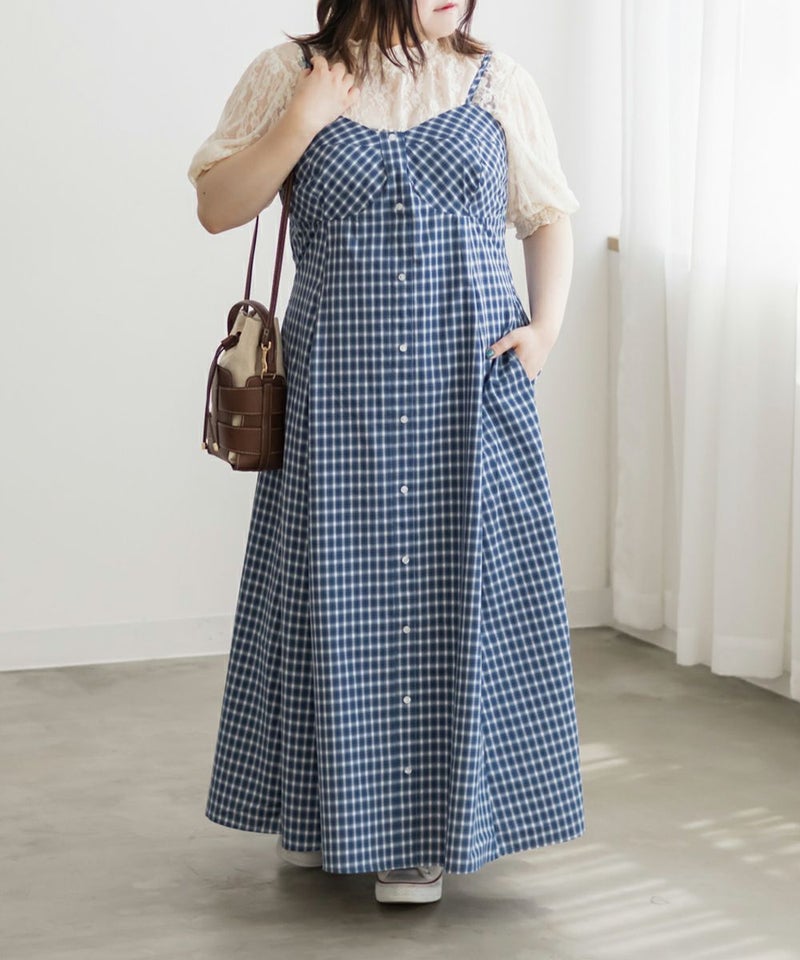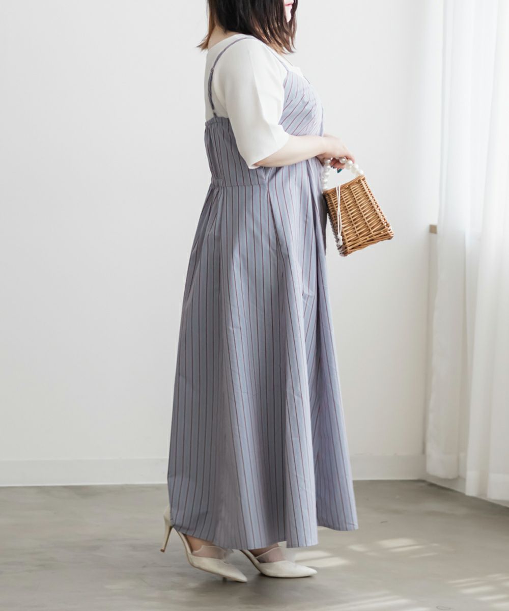 LLサイズを着用しましたが、着心地はちょうどよく、程よく身体のラインを拾わず安心感のあるサイズ感でした◎肩ひもはアジャスター付きで長さ調整できるので、低身長さんでもバランス良く着こなせるのが嬉しいポイント♪ウエストは自然にくびれて見える構築的なディティールでスタイルアップ見えも叶いました!フロントのボタンデザインが縦ラインを強調してくれるから、キャミワンピでも大人っぽく仕上がります。コルセットっぽい胸元のデザインが今っぽく、大人フェミニンに着こなせます♪トレンド感のあるストライプとチェックの展開で、あわせるアイテムによってカジュアルにもガーリーにもなれちゃいます!インナーを変えれば季節を問わず着回せる万能アイテムです♪