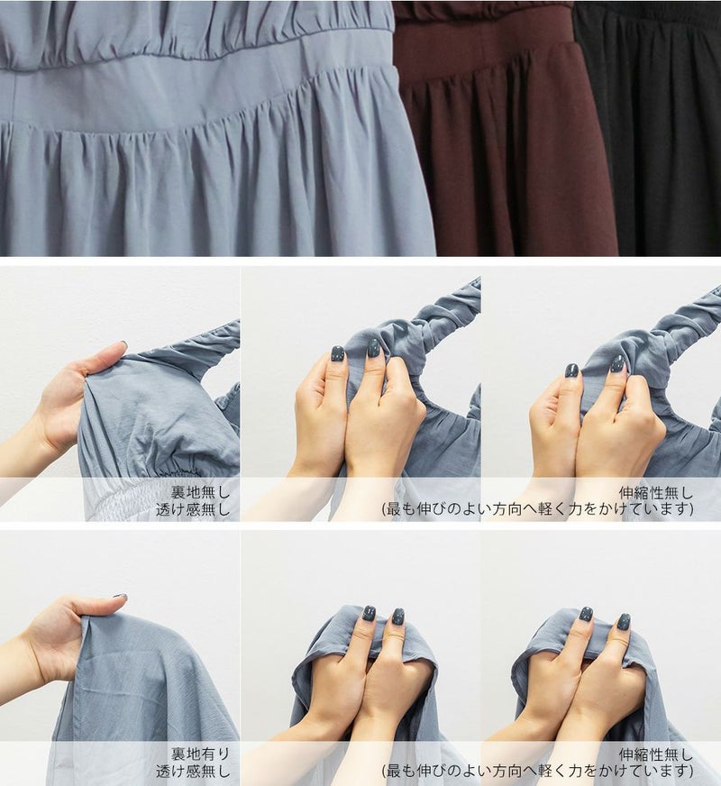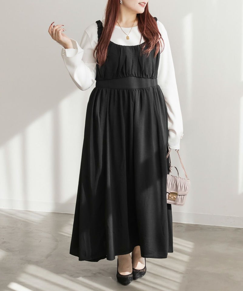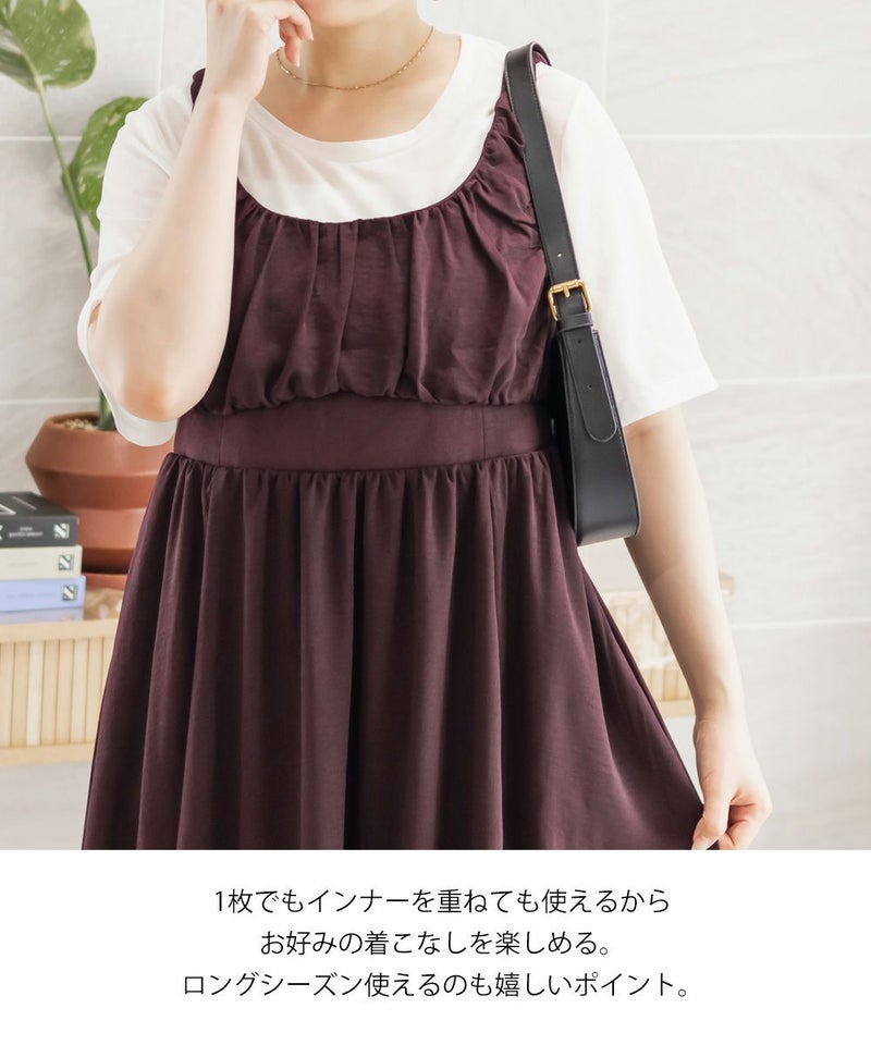 3Lサイズを着用しました。バストはゴムが無かったので、心配な方はサイズ確認をお勧めします◎ ノースリーブでも脇が開きすぎていないので、1枚でも安心して着用できました。ギャザーがたっぷりでボディラインを拾いにくいデザインが嬉しいです! 1枚でもインナーを重ねも使えて着回しが効くアイテムです!大人っぽいデザインとカラバリでこなれ感のあるスタイリングにぴったり!