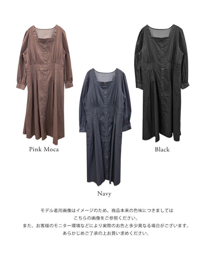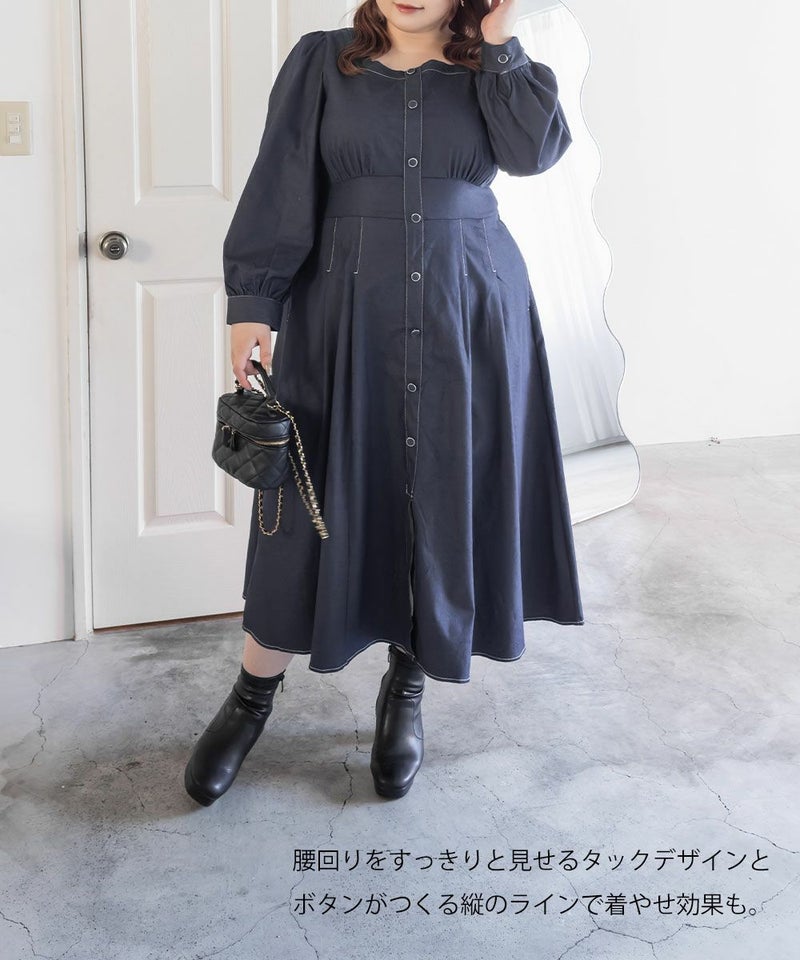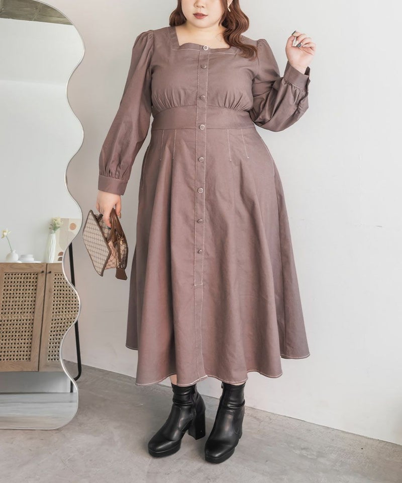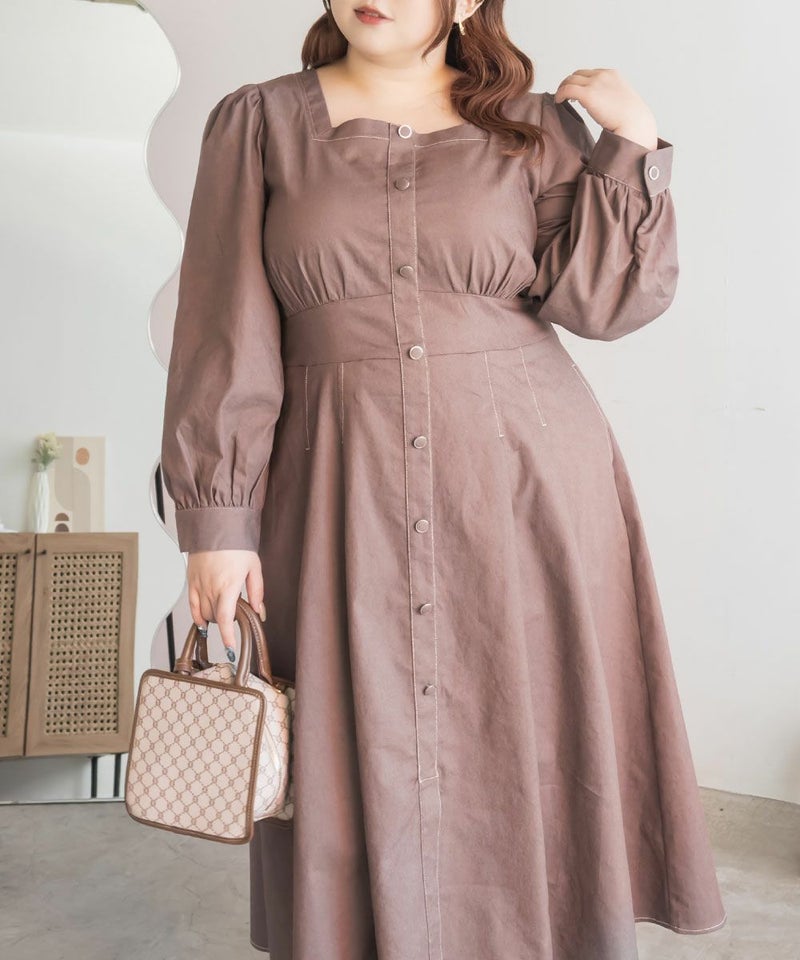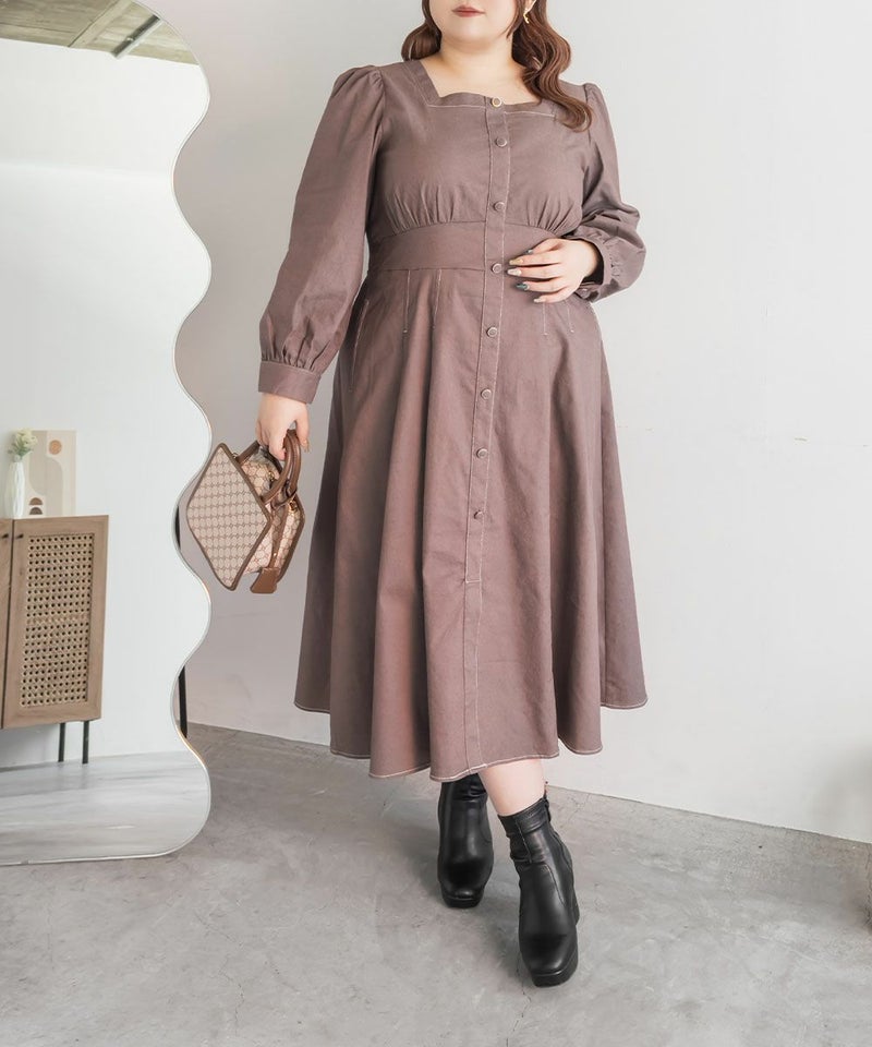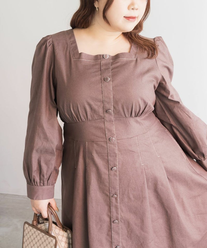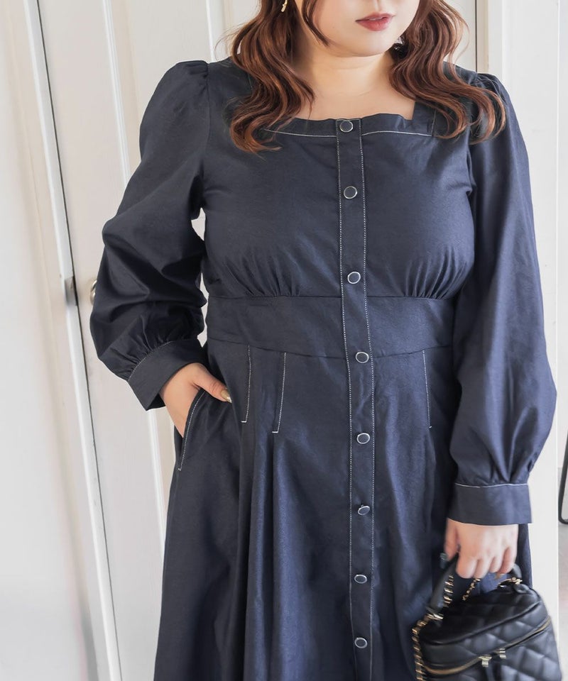 3Lサイズを着用て丁度いいサイズ感でした。スクエアネックなので、デコルテを綺麗に魅せてくれます!背中側はあまり開いてないのも嬉しいポイントです◎フロントは大きめのボタンがついているのと配色ステッチでメリハリのあるすっきりとした印象です!1枚でコーデが完成する主役級ワンピースで、丈感もしっかりありいろいろなシーンで着られるのが嬉しいです!上品で大人っぽいデザインなので、お出かけはもちろん、ちょっときっちりしたいシーンなどでも活躍できそうです!