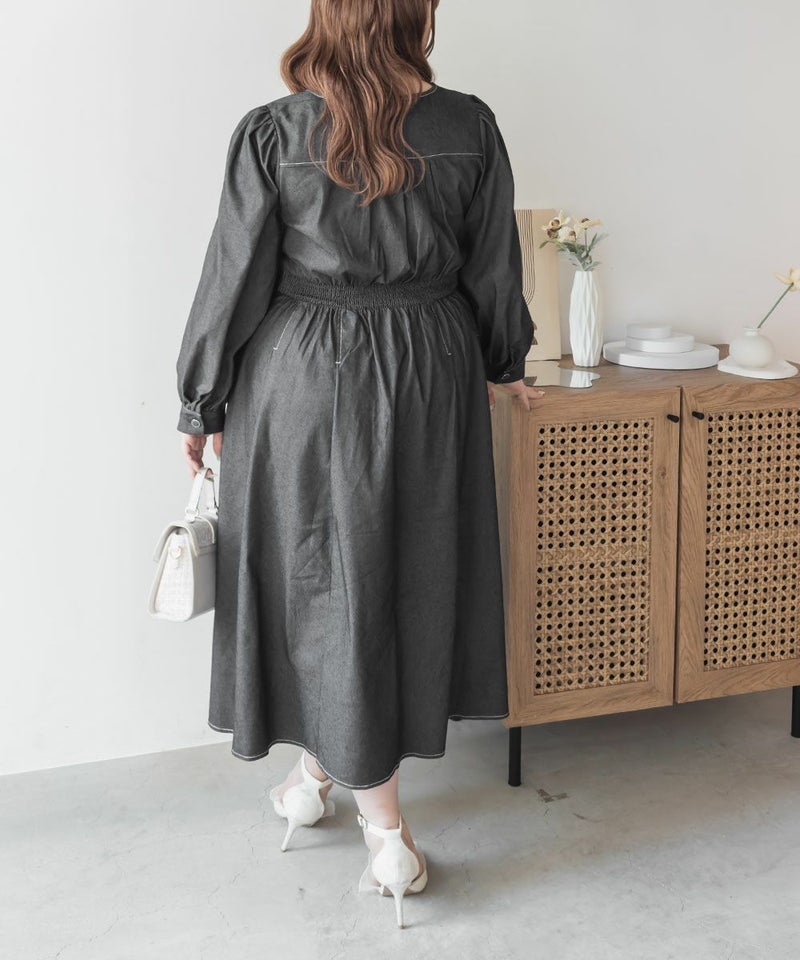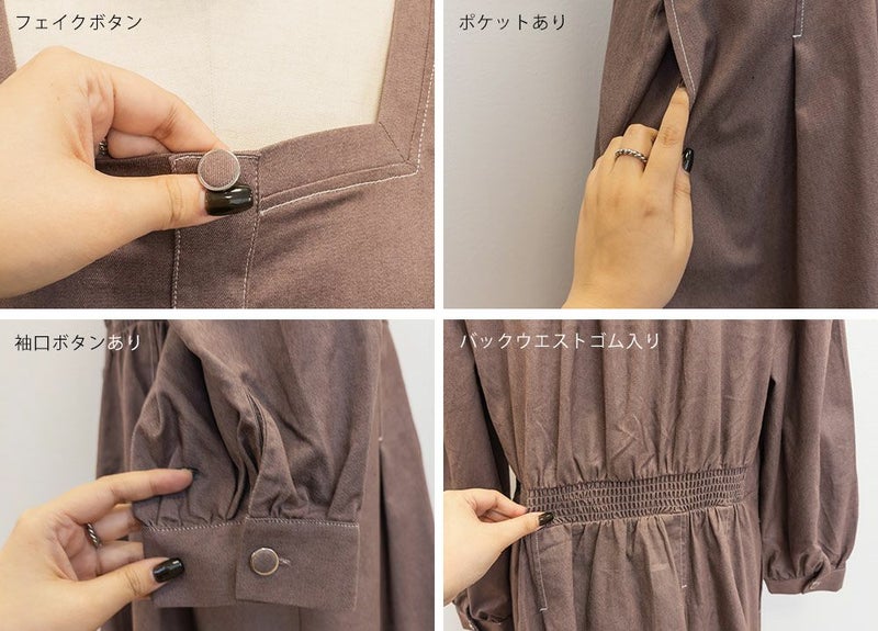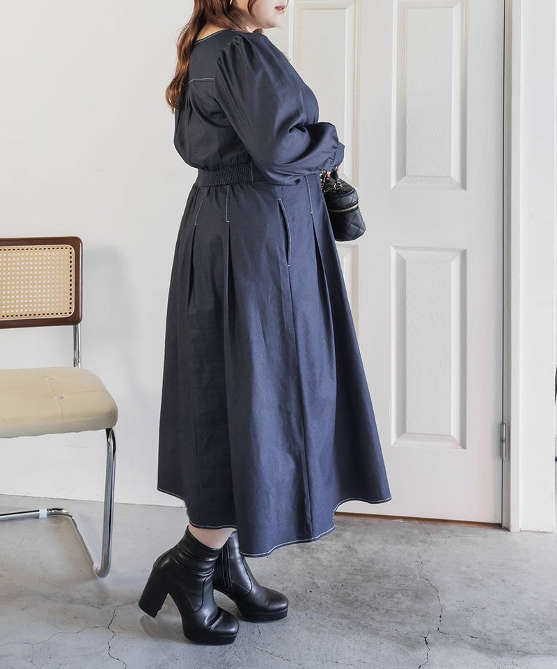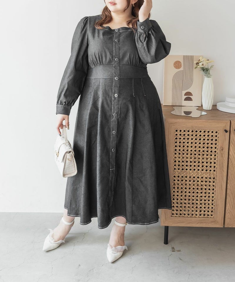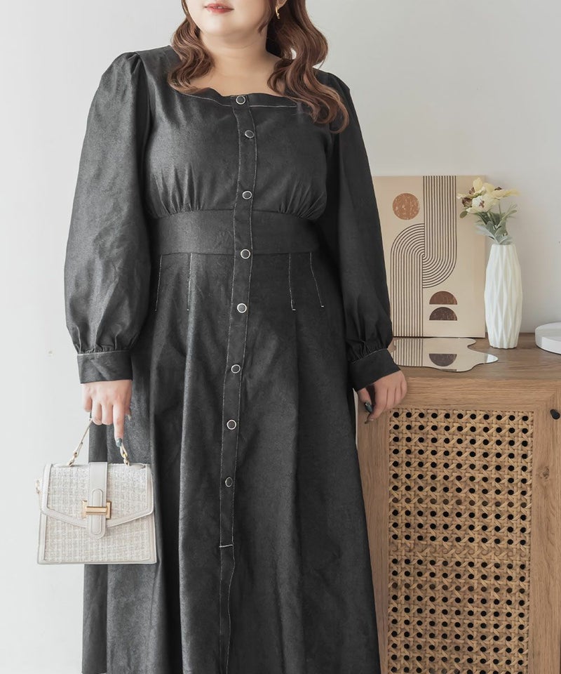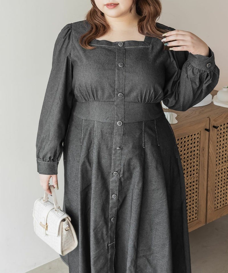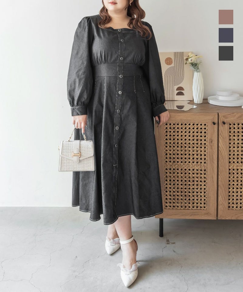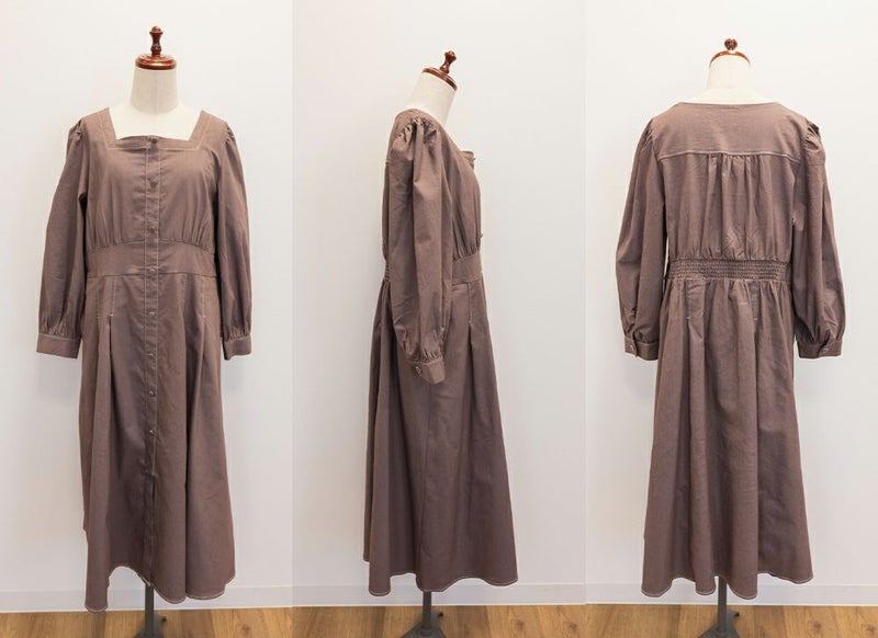 3Lサイズを着用て丁度いいサイズ感でした。スクエアネックなので、デコルテを綺麗に魅せてくれます!背中側はあまり開いてないのも嬉しいポイントです◎フロントは大きめのボタンがついているのと配色ステッチでメリハリのあるすっきりとした印象です!1枚でコーデが完成する主役級ワンピースで、丈感もしっかりありいろいろなシーンで着られるのが嬉しいです!上品で大人っぽいデザインなので、お出かけはもちろん、ちょっときっちりしたいシーンなどでも活躍できそうです!
