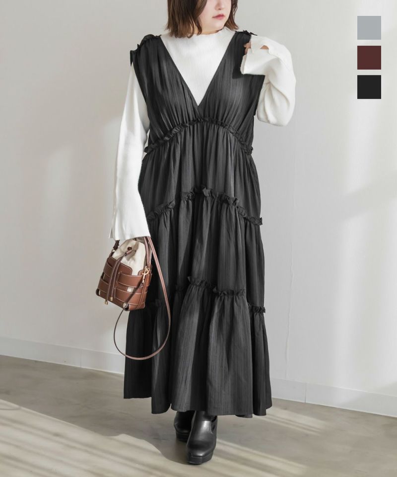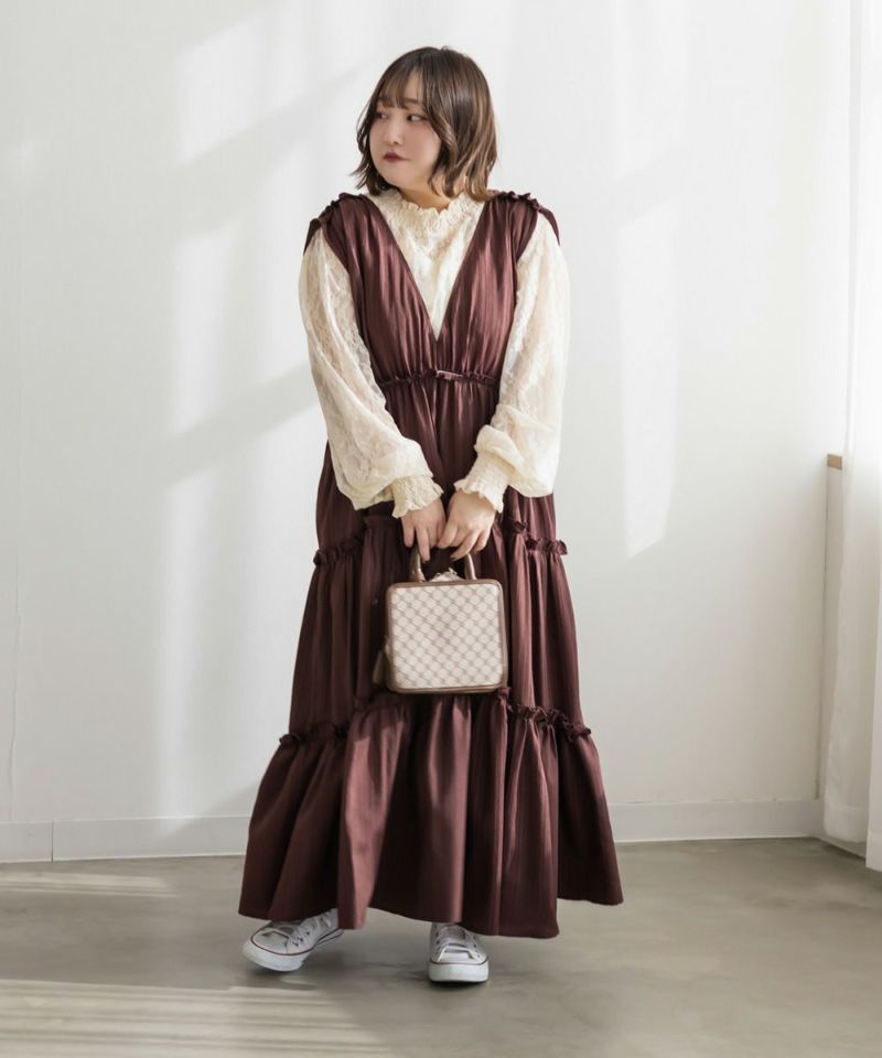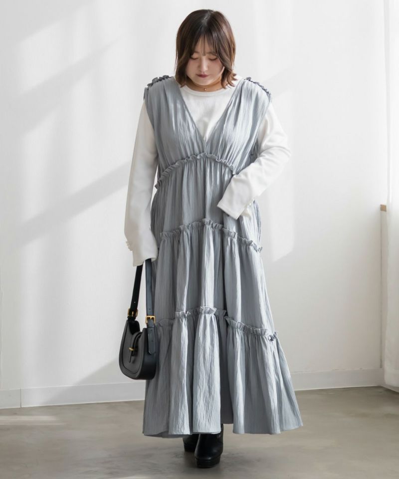 LLサイズを着て少し余裕を持って着られました!長めに着るバランスがおしゃれな雰囲気で、低身長の私がローカットのスニーカーを履いて床にすらないくらいの長さになりました◎身体のシルエットをすっぽりカバーしてくれるデザインで、小さめのフリルとシワ感のある生地が可愛いです♪シワになりにくく、気軽に着れるのも嬉しいです!深いVネックになっているから顔回りもメリハリが出来てすっきりとした印象です。春夏はTシャツやシアーアイテムと合わせて、冬はタートルネックのニットをあわせたりして、オールシーズン使えるのも嬉しいです。