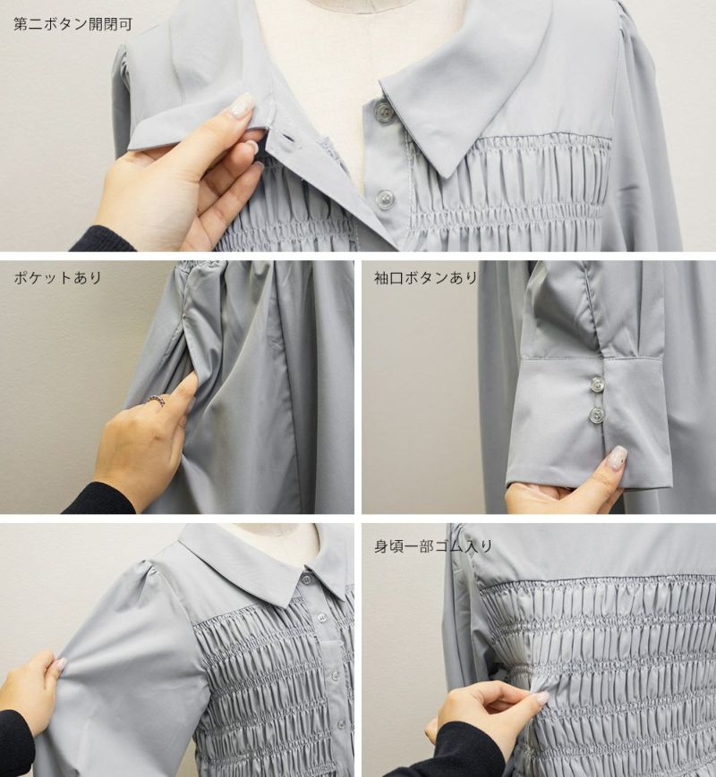 バストからウエストあたりまでをシャーリングでほどよくフィットさせて、メリハリのあるシルエットを作れるデザイン。気になる下半身まわりをフレアシルエット隠してくれる。首に窮屈感が出ない、ほどよくゆとりのある襟まわりと、ゆとりのある袖がさらに着やせ効果をプラス。