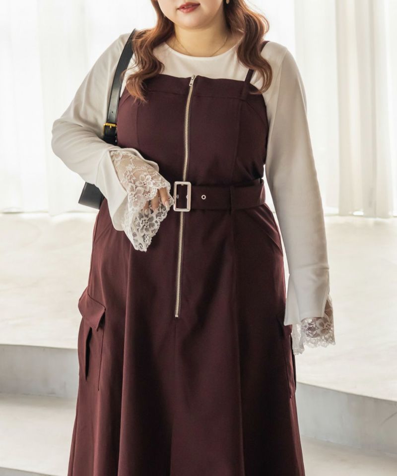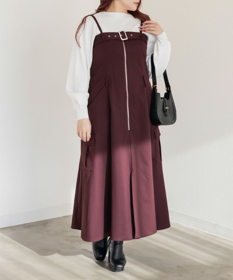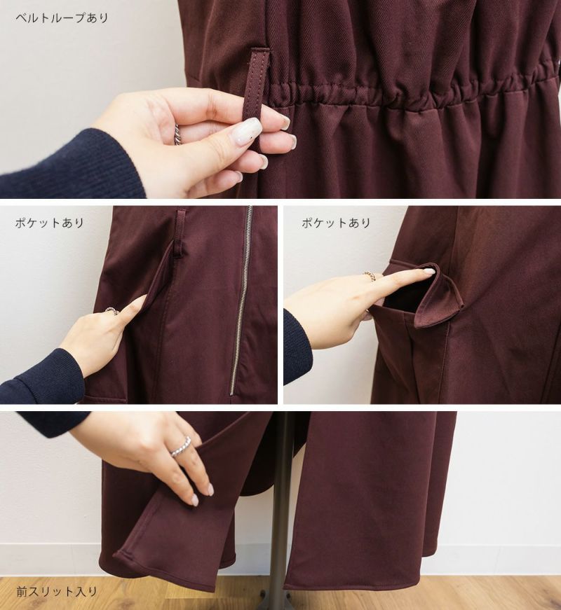 【design】胸元/ウエストどちらにもベルトをまける2WAYデザイン。ベルトの位置を変えるだけで全く違ったシルエットと表情に変化できるワンピース。ベルト・ジップデザイン・サイドポケットがメリハリを与えてすっきりと着やせできる。【material】しっかりとしたハリ感のあるツイル織の布帛生地。ボディラインを拾いづらく、季節問わず着用可能な素材。【styling】甘くなり過ぎないデザイン性の高いワンピースだから、インナーにはシンプルなデザインがおすすめ。夏はTシャツ冬はベーシックなハイネックニットなど、オールシーズン着回し可能。スニーカーなどカジュアルシューズはもちろん、大人の女性らしさがプラスされるショートブーツと合わせもおすすめです。