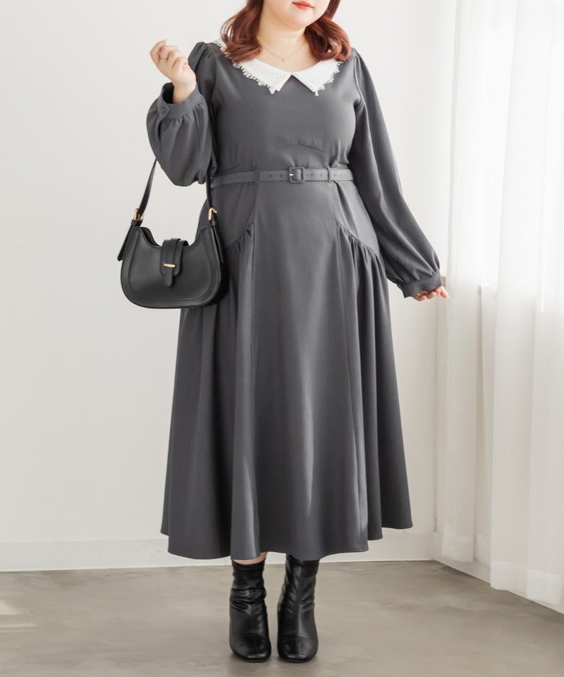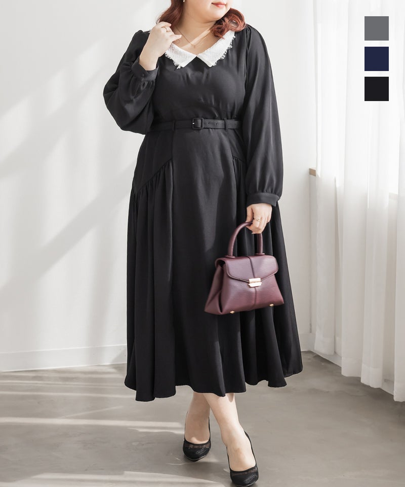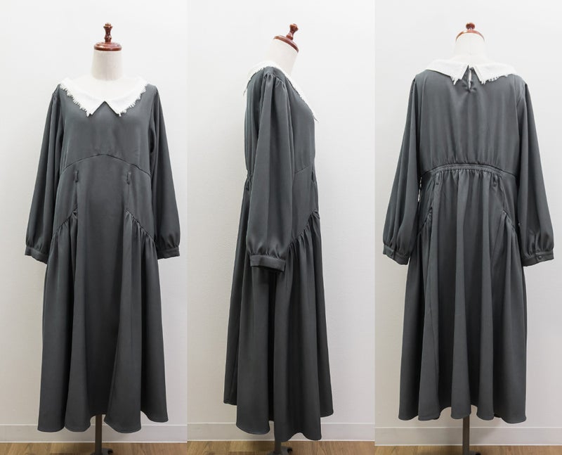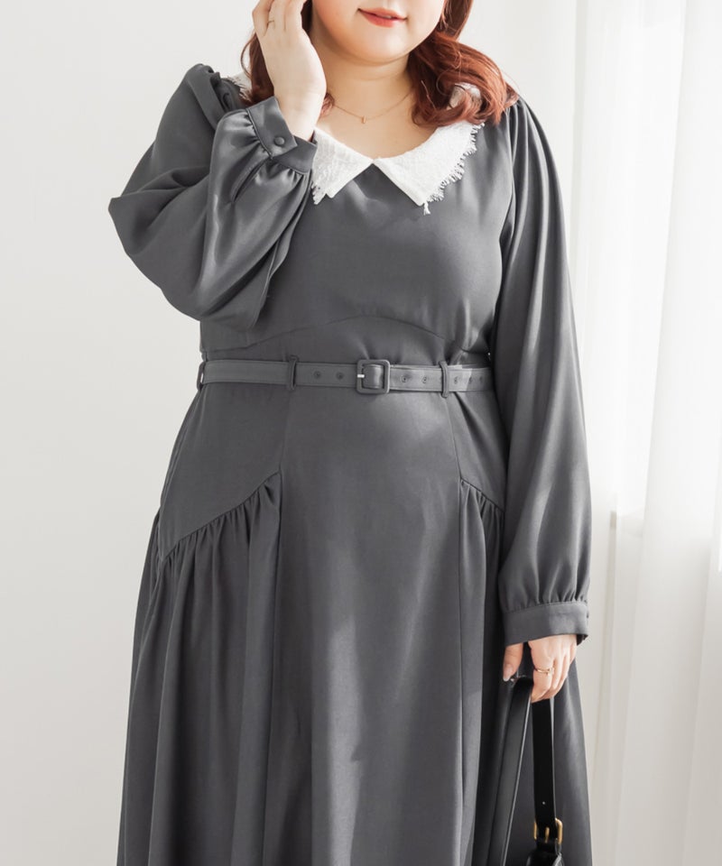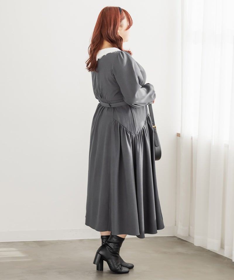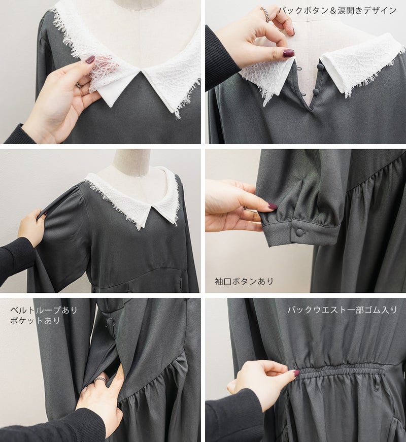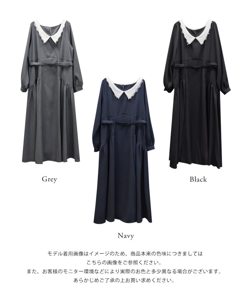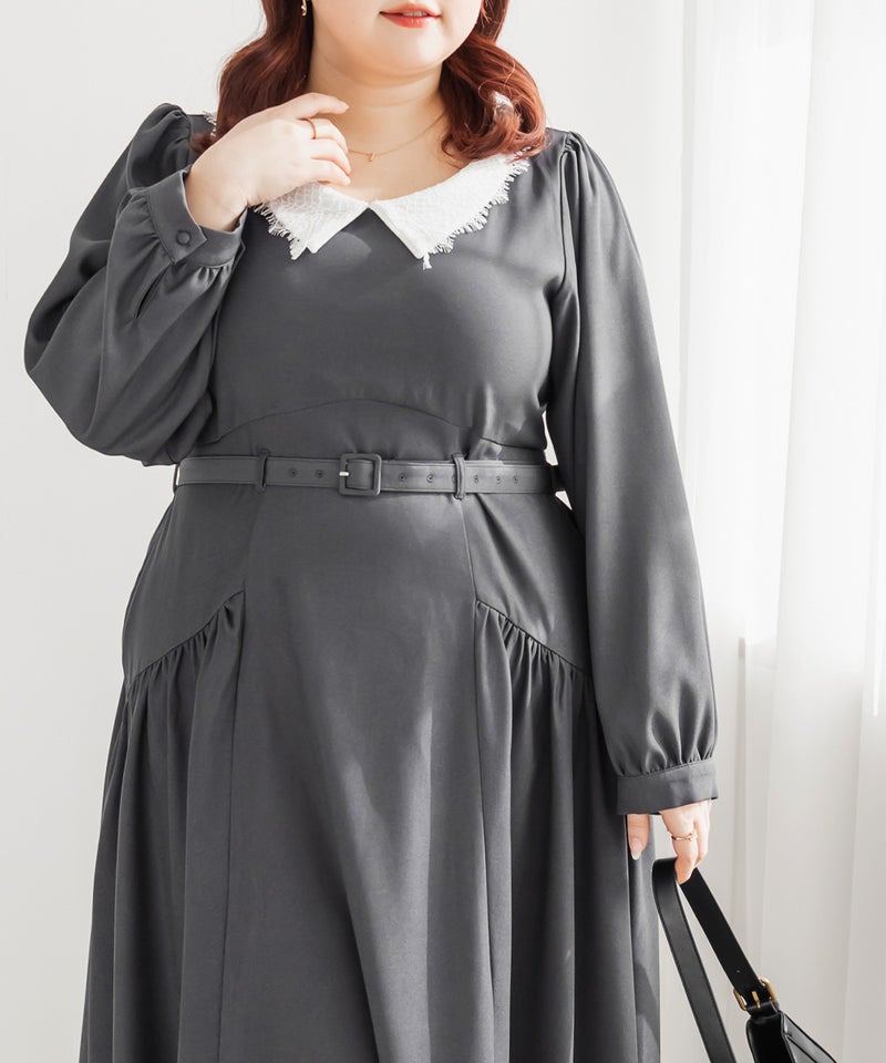 【design】繊細なレース使いの襟がデコルテ・顔回りを美しく演出。ウエストを細くシャープに見せるベルトセットデザインに、気になる下腹・腰回りはギャザーを入れて体型をカバー。甘くなり過ぎないレディな印象になれるワンピース。【material】本体生地はしっかりとした上品な布帛生地。襟はジョーゼット素材とスカラップレースを重ねた繊細な生地使い。【styling】お出かけに着ていきたくなる主役感のあるデザイン。上品に着こなせるから、ちょっとしたフォーマルシーンや特別な日にも◎