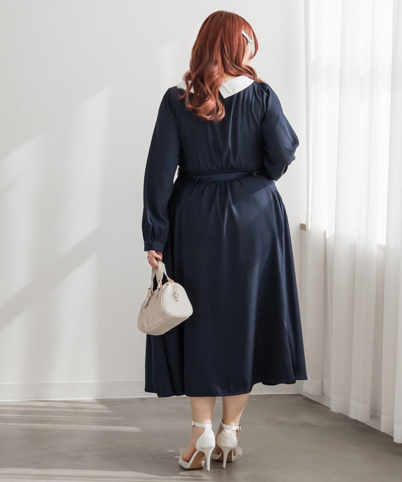 3Lサイズを着用して、全体的にちょうどいい着心地でした。のびる生地ではないので、サイズの確認をお勧めします!ウエストは程よくシェイプされていて、すっきり見えするシルエットなのに締め付け感はなく、着心地も快適でした♪ 繊細なレース襟が上品なアクセントになっていて、顔まわりをパッと華やかに見せてくれます。ネック周りはすっきり開いていて窮屈感が無いのが嬉しいです◎ハリのある素材が大人っぽく上品で、特別な日にもぴったりの一枚です! 一枚でコーデが完成するデザインなので、気分の上がる着こなしが楽しめます♪