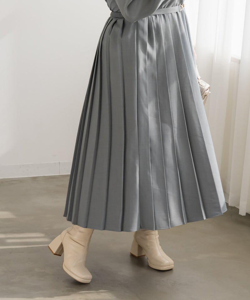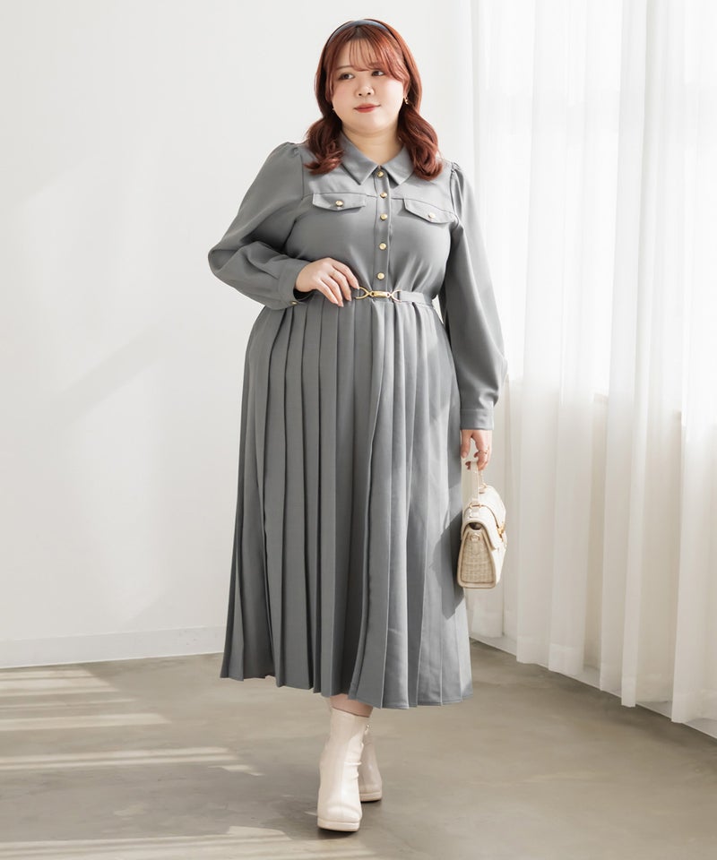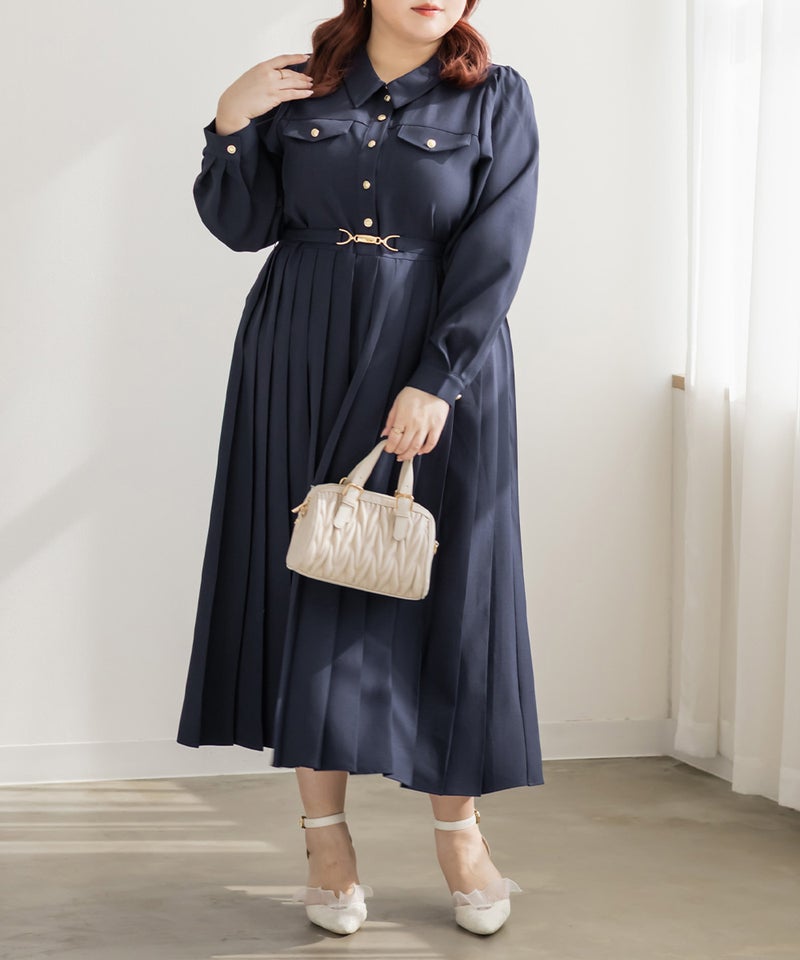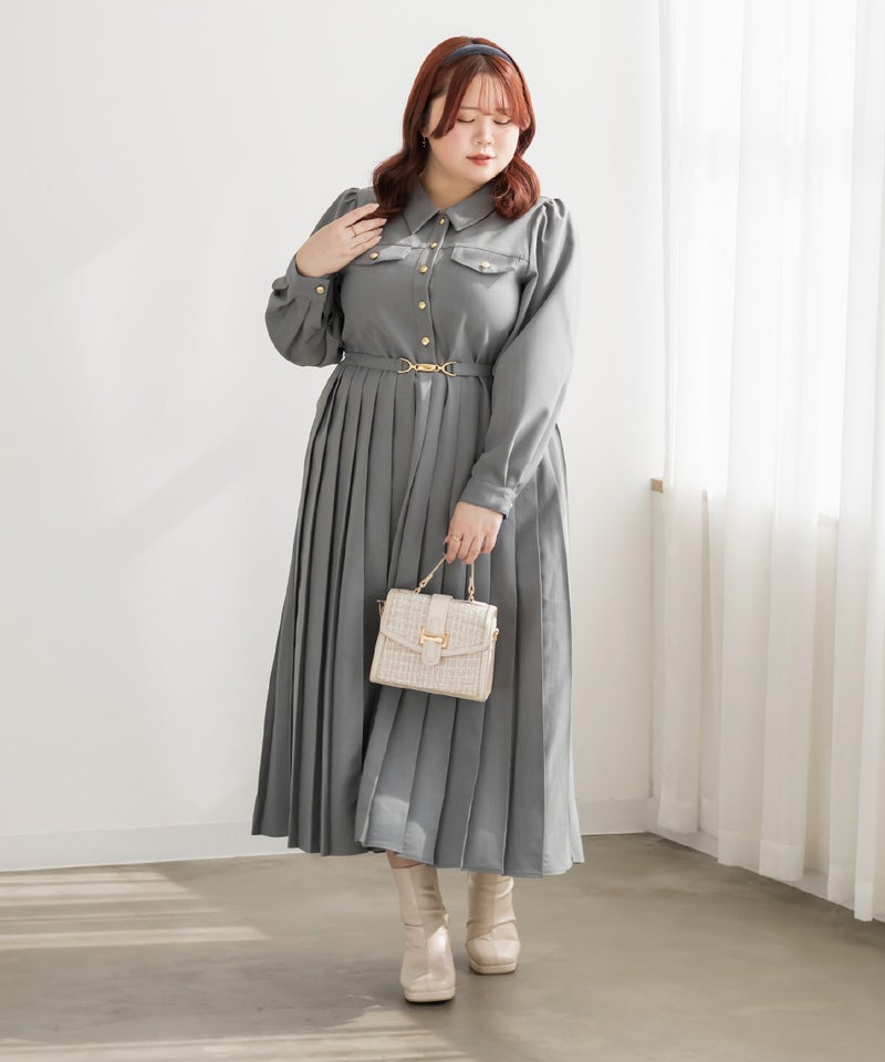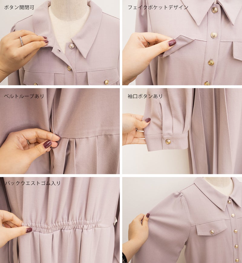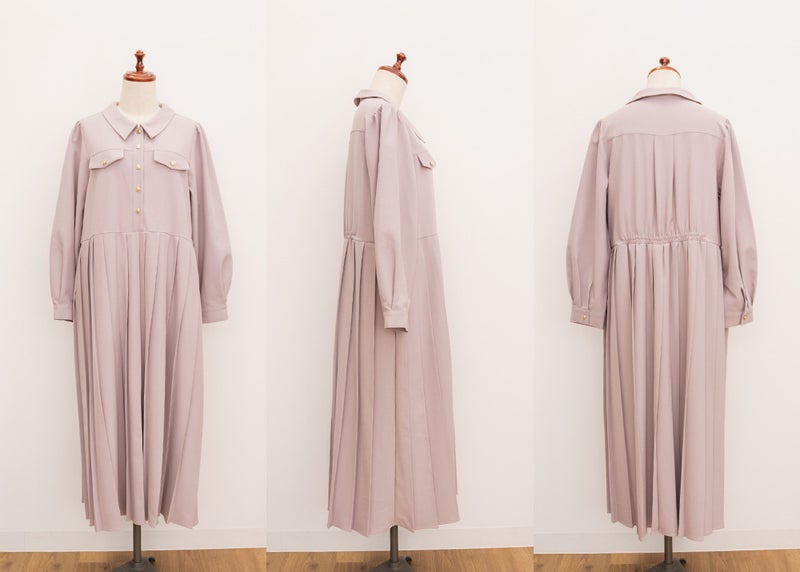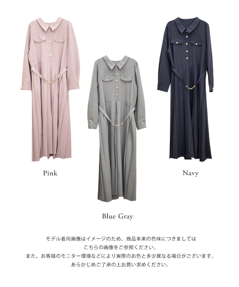 【design】クラシックでレディな雰囲気のゴールドボタンとベルトがポイントになったワンピース。プリーツがフェミニンさをプラスしつつ、体型もカバーしてくれる。【material】上品で厚すぎず、薄すぎないロングシーズン着用できる布帛生地。