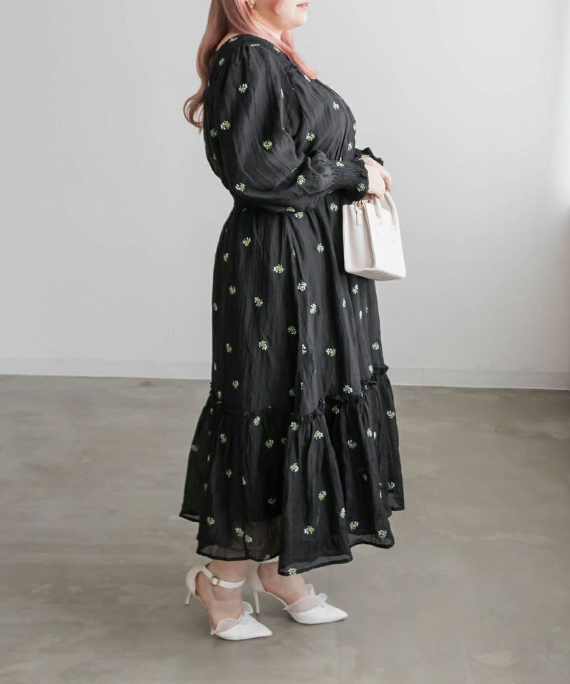 3Lを着てちょうどいいサイズでした。花柄の生地が派手ではないけど洗練されたデザインになっていて、細かいところまで可愛いです!胸元が見えないけれどすっきりとしたネックデザインがポイントでウエストシャーリングで着心地が楽なのも嬉しいです!大人っぽいけどフェミニンになれる、他にはないワンピースです♪