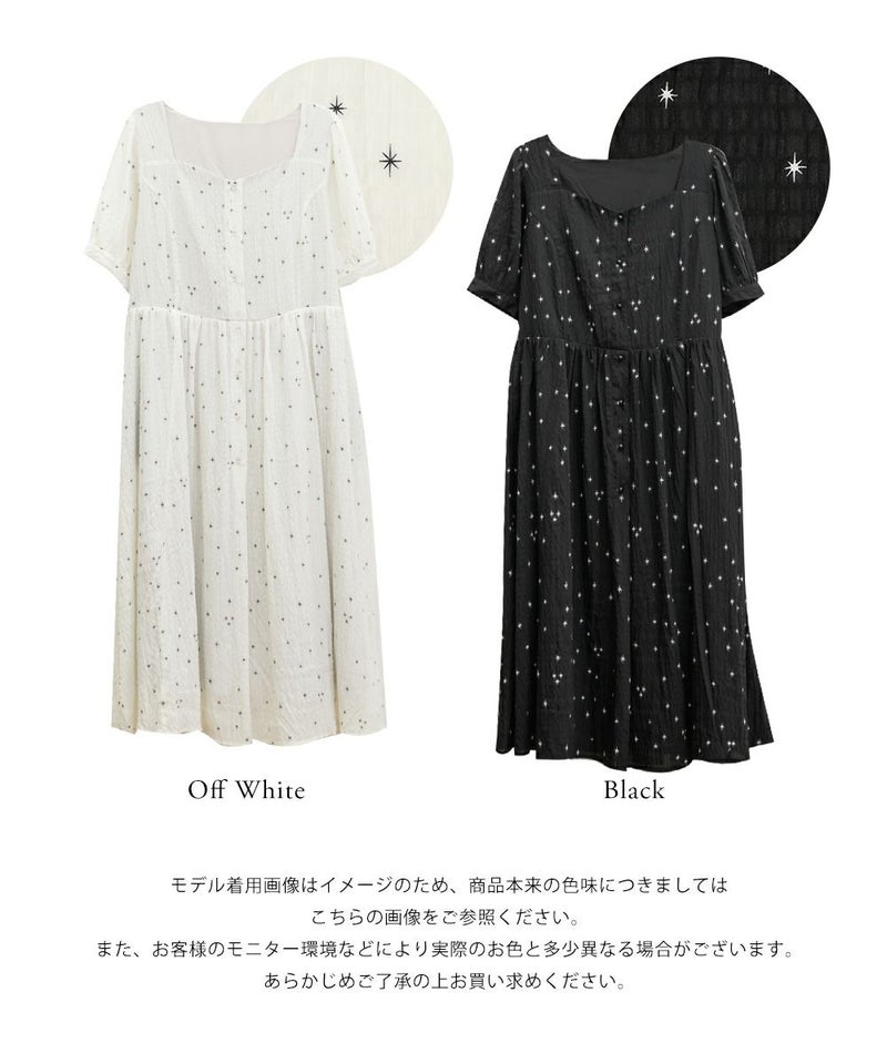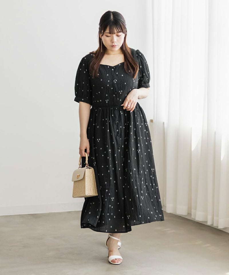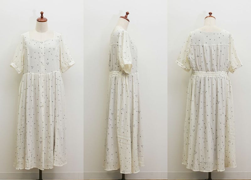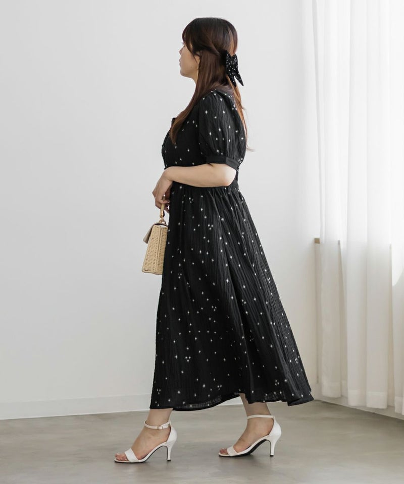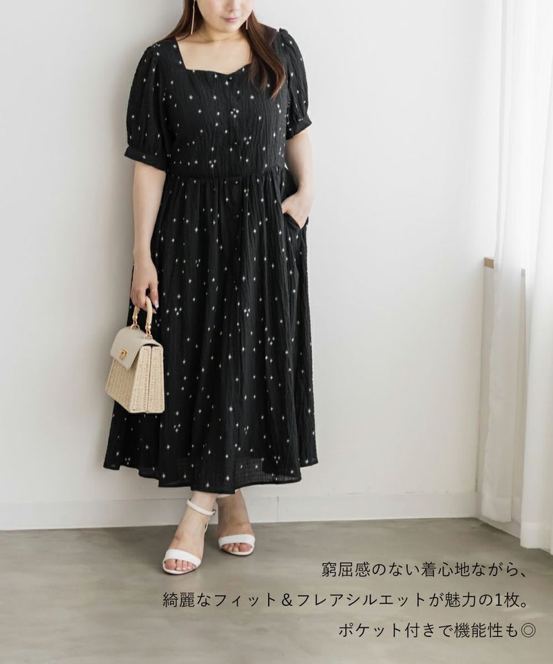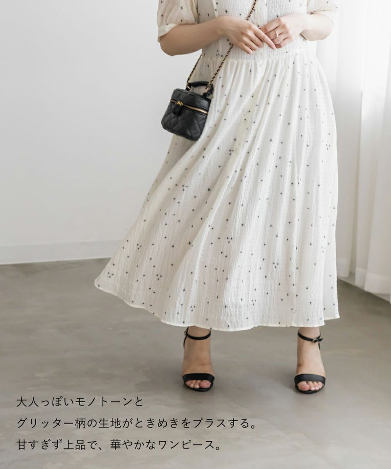 3Lサイズを着用して、全体的にちょうどいいサイズ感でした。ウエスト部分は後ろゴム仕様で、締めつけ感なくリラックスした着心地♪ふわっと広がるスカートと、グリッター柄の生地が華やかさをプラスしてくれるので、シンプルなワンピースながら着映え感抜群です!袖のボリュームも可愛くて、二の腕カバーにも◎1枚でお出かけ仕様になる、お気に入りになりそうな1着です!