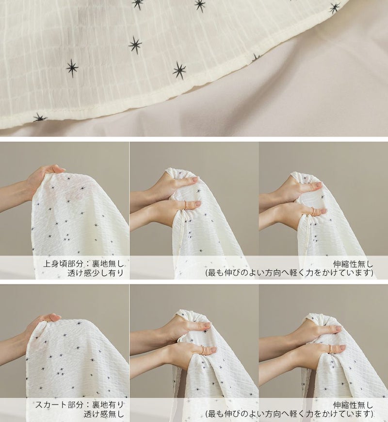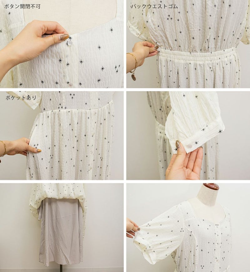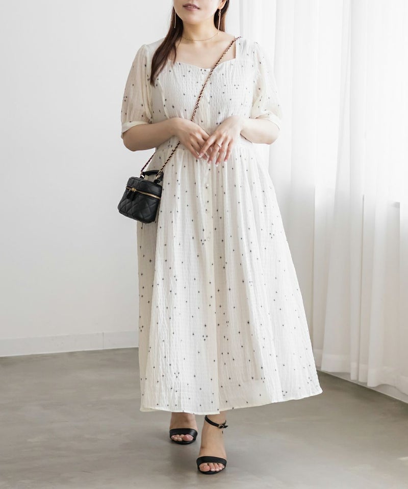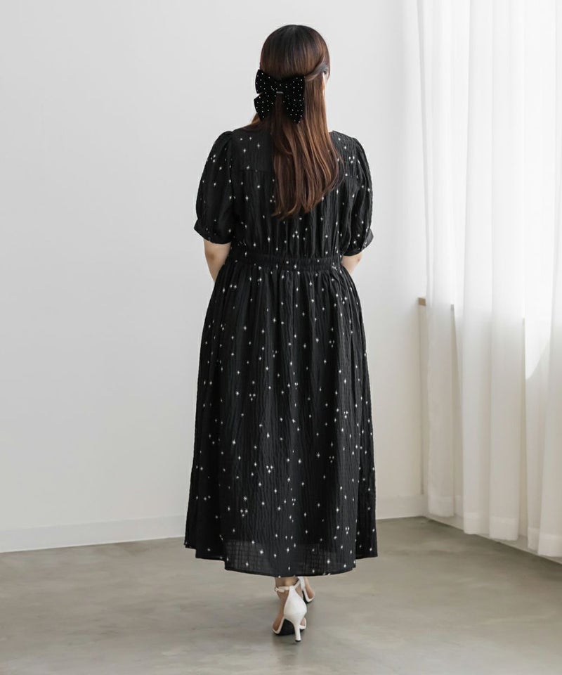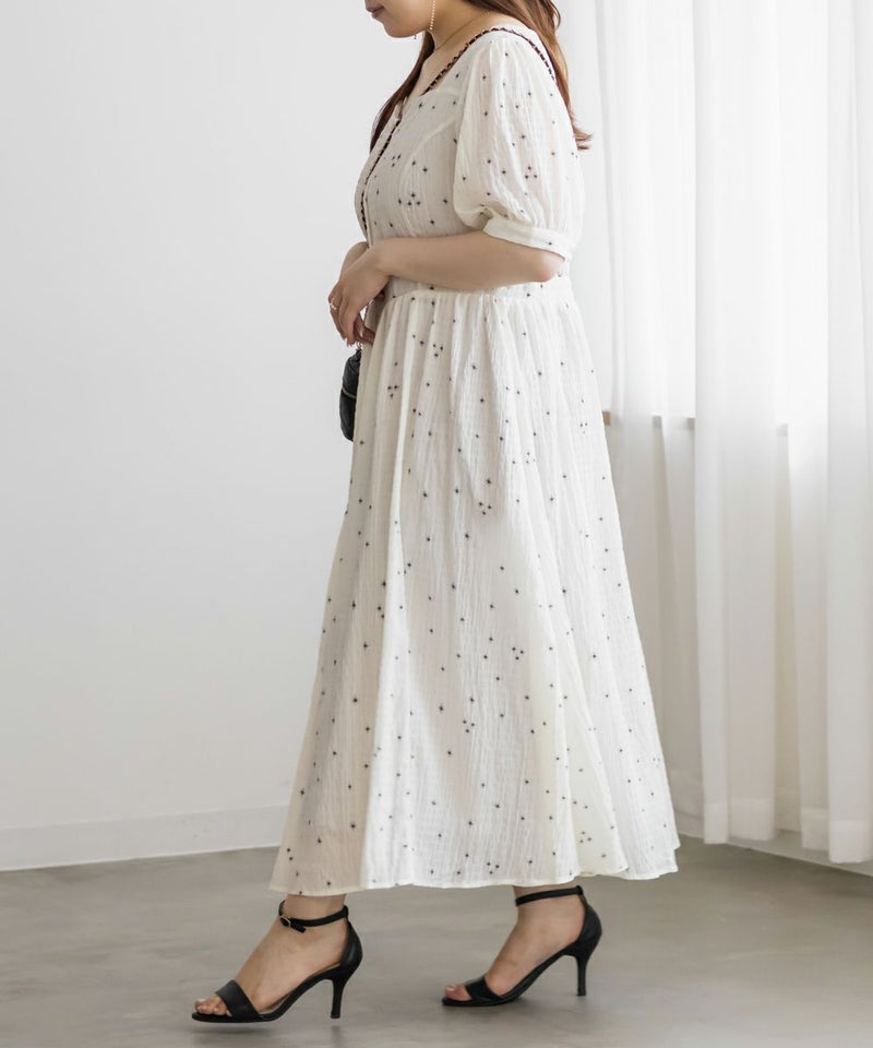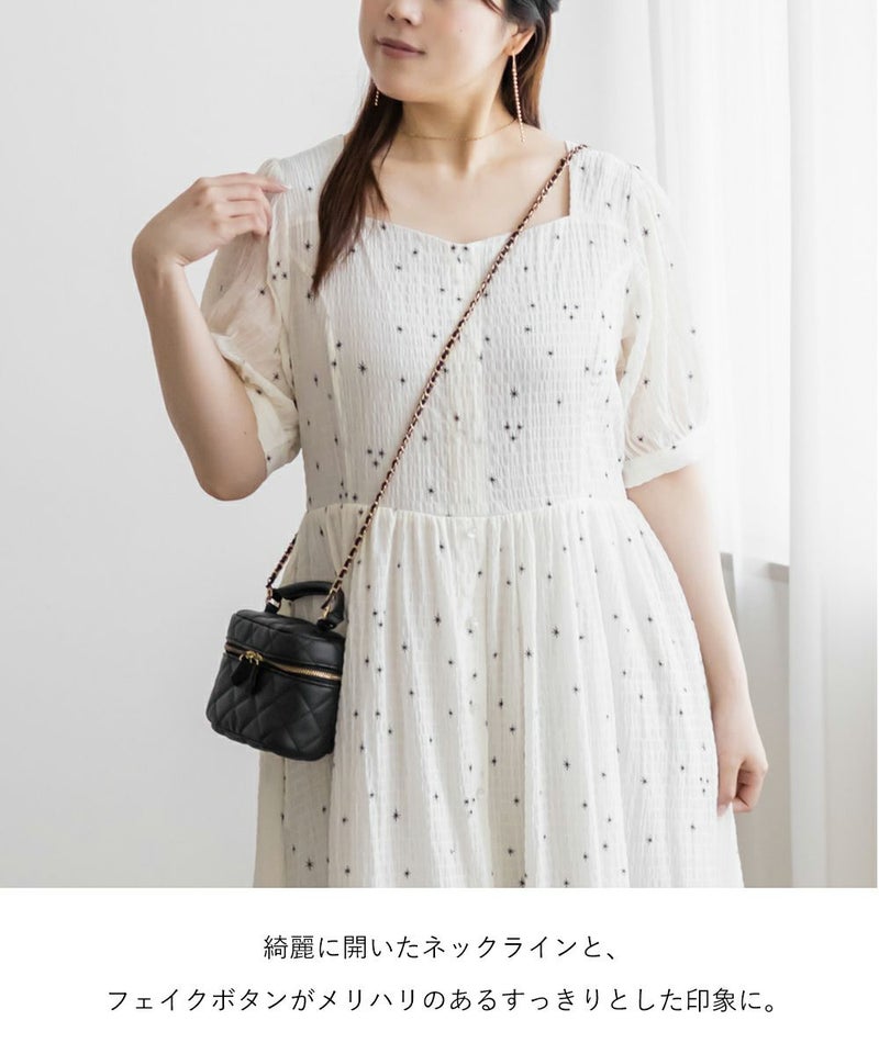 3Lサイズを着用して、全体的にちょうどいいサイズ感でした。ウエスト部分は後ろゴム仕様で、締めつけ感なくリラックスした着心地♪ふわっと広がるスカートと、グリッター柄の生地が華やかさをプラスしてくれるので、シンプルなワンピースながら着映え感抜群です!袖のボリュームも可愛くて、二の腕カバーにも◎1枚でお出かけ仕様になる、お気に入りになりそうな1着です!