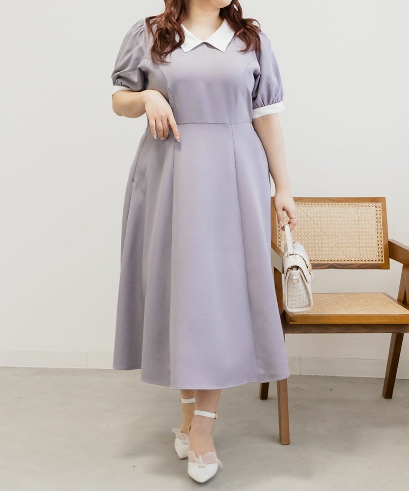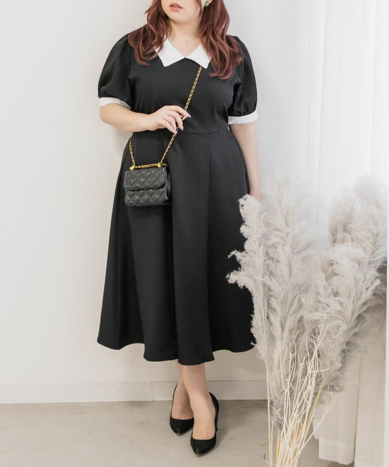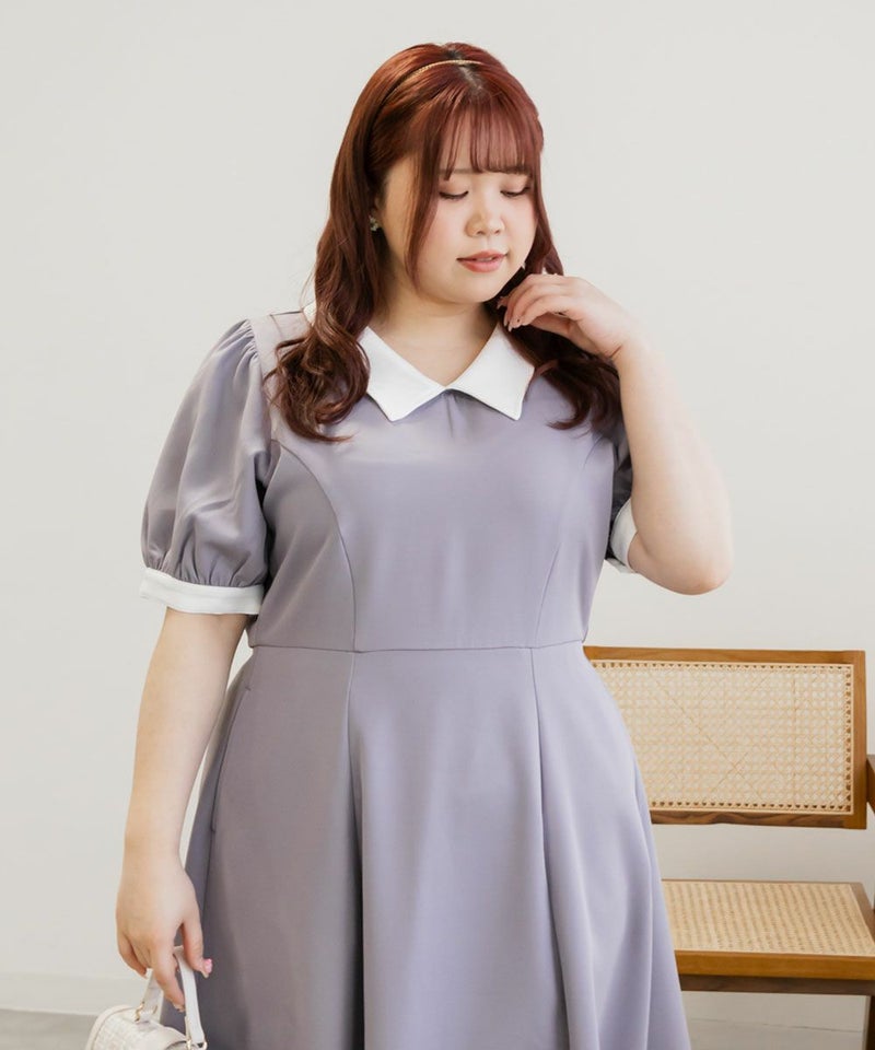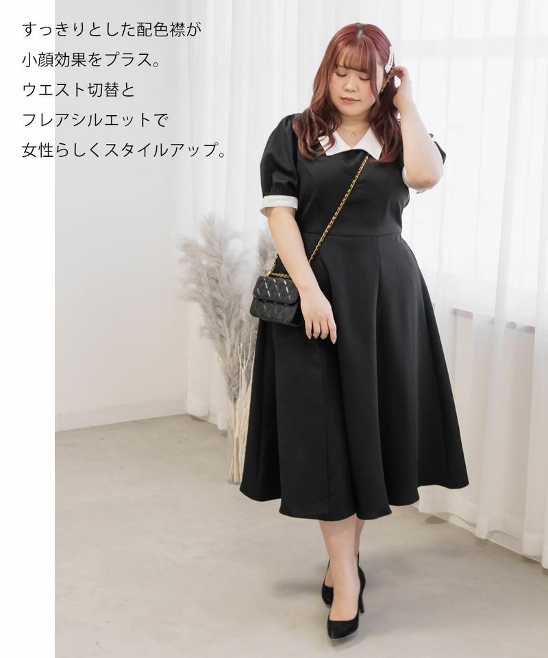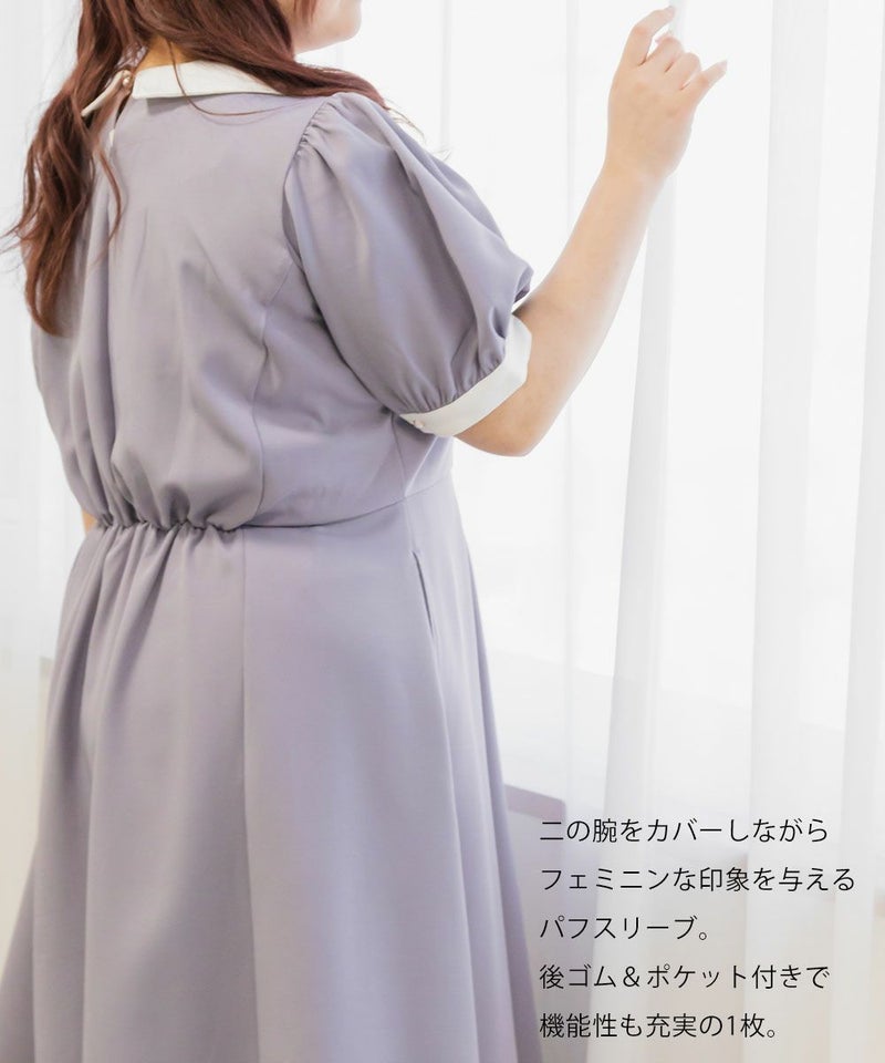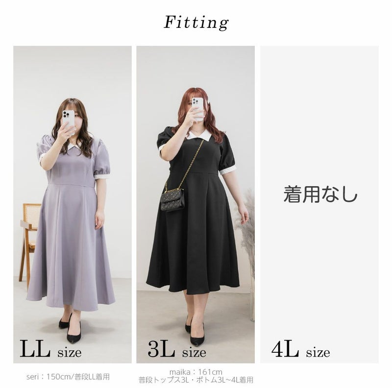 3Lを着て丁度いいサイズでした。王道のフィット&フレアでシルエットの綺麗なシルエットだから着るだけで着やせできます♪襟と袖が配色になっていて、上品でフェミニンな雰囲気に着こなせます!襟はほどよくあいていて、窮屈感がないのも嬉しいです。ポケット付きだからお出かけにも便利です◎シンプルだからこそ洗練されたスタイルになれるワンピースです!