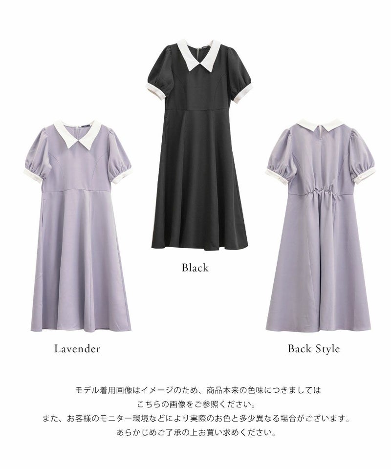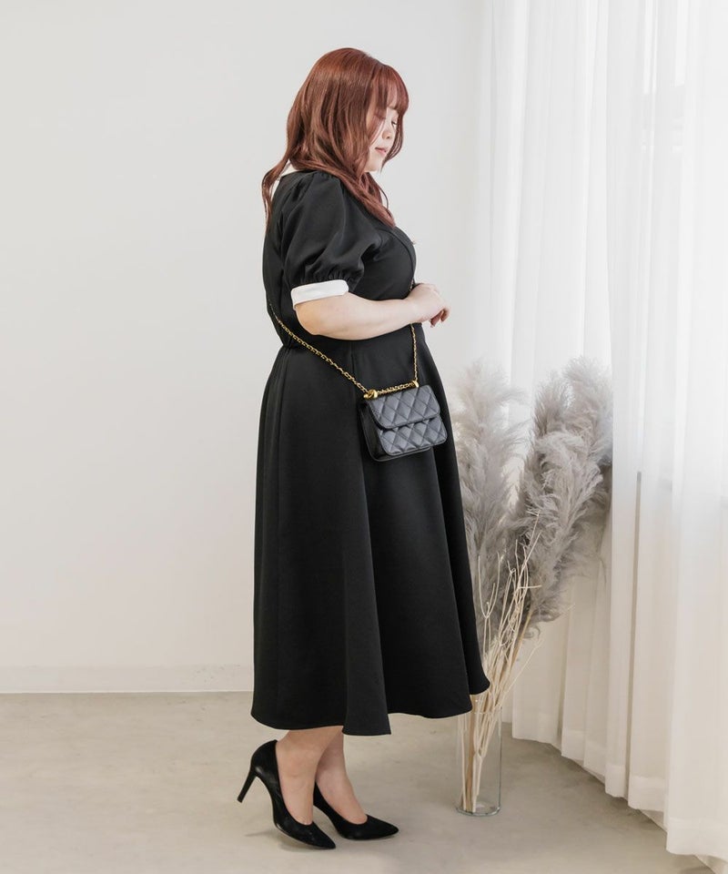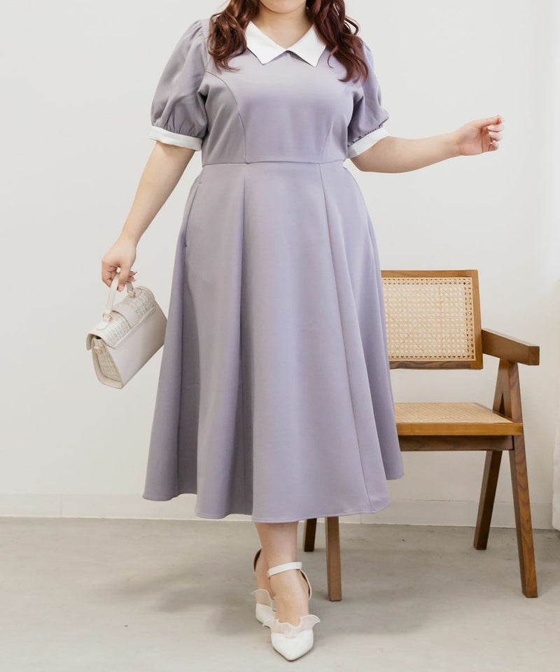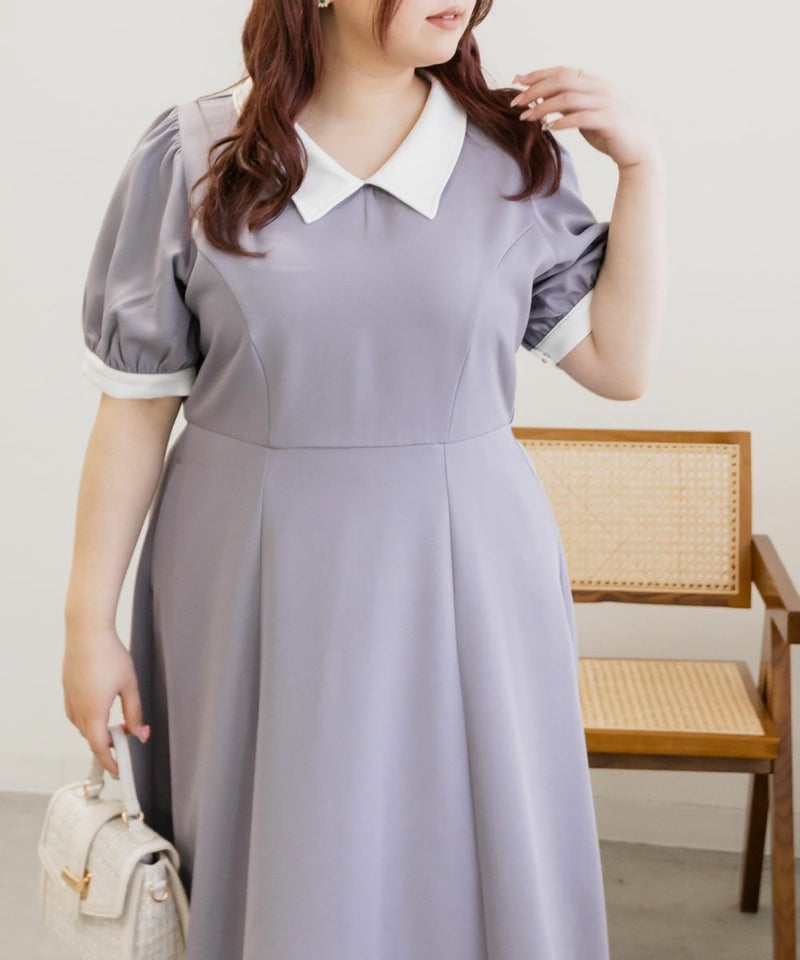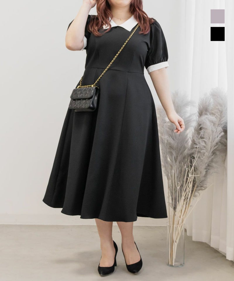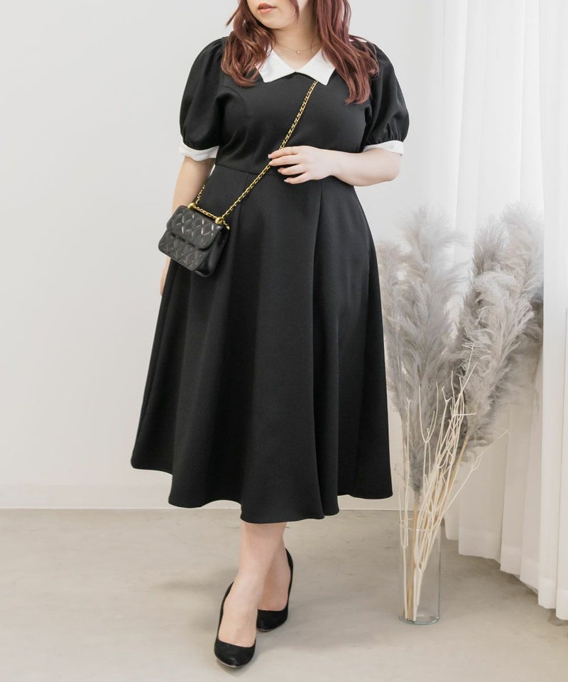 3Lを着て丁度いいサイズでした。王道のフィット&フレアでシルエットの綺麗なシルエットだから着るだけで着やせできます♪襟と袖が配色になっていて、上品でフェミニンな雰囲気に着こなせます!襟はほどよくあいていて、窮屈感がないのも嬉しいです。ポケット付きだからお出かけにも便利です◎シンプルだからこそ洗練されたスタイルになれるワンピースです!