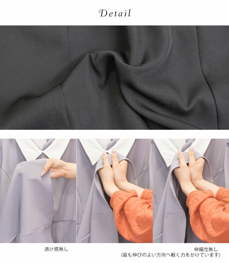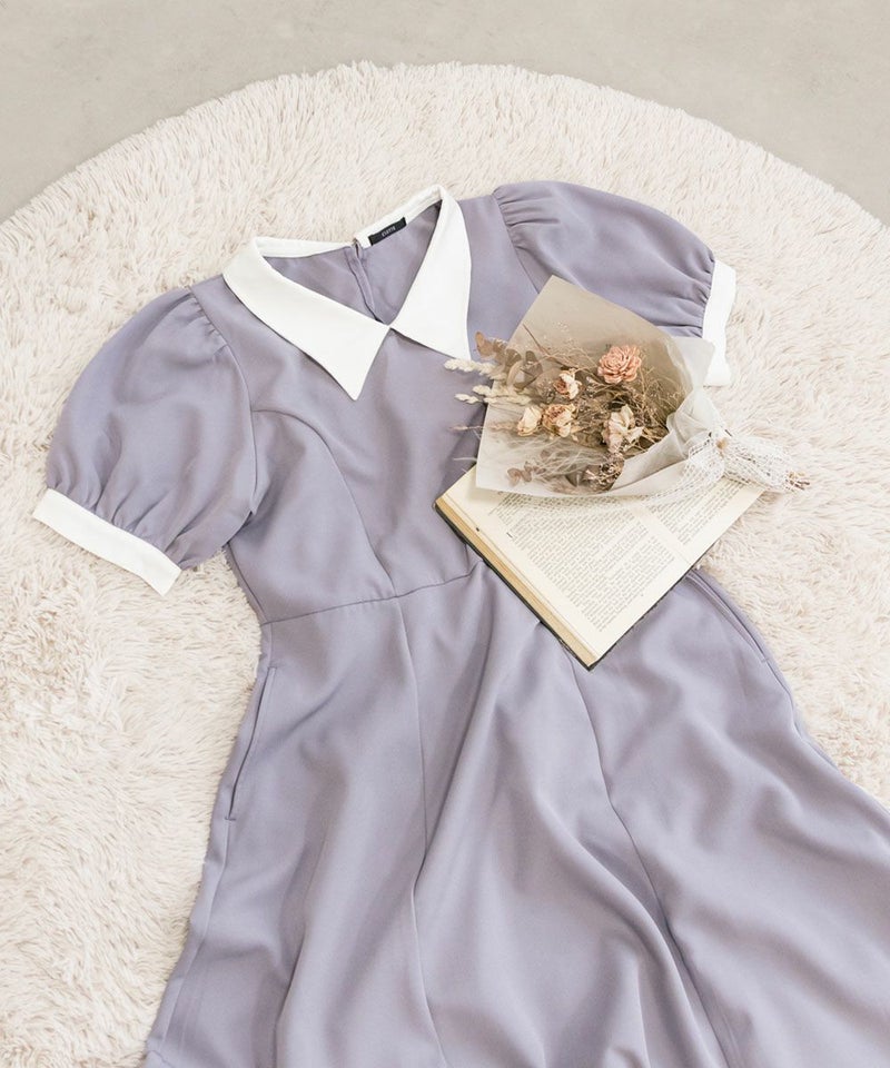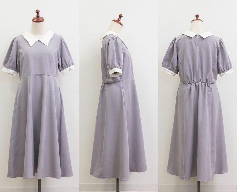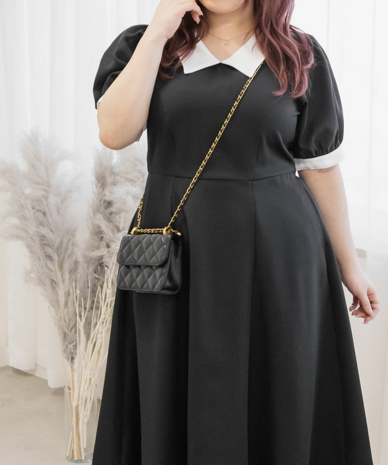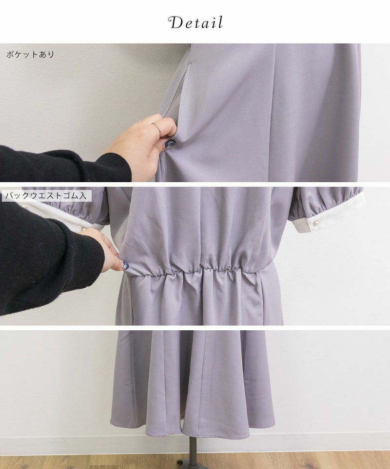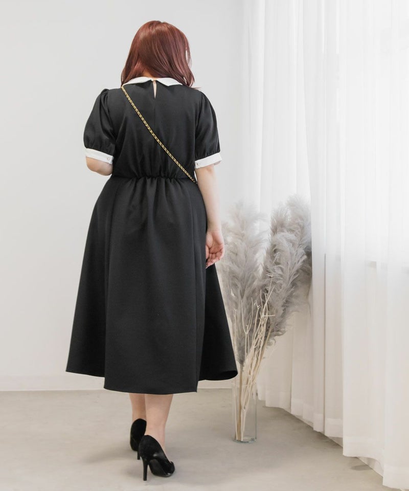 3Lを着て丁度いいサイズでした。王道のフィット&フレアでシルエットの綺麗なシルエットだから着るだけで着やせできます♪襟と袖が配色になっていて、上品でフェミニンな雰囲気に着こなせます!襟はほどよくあいていて、窮屈感がないのも嬉しいです。ポケット付きだからお出かけにも便利です◎シンプルだからこそ洗練されたスタイルになれるワンピースです!