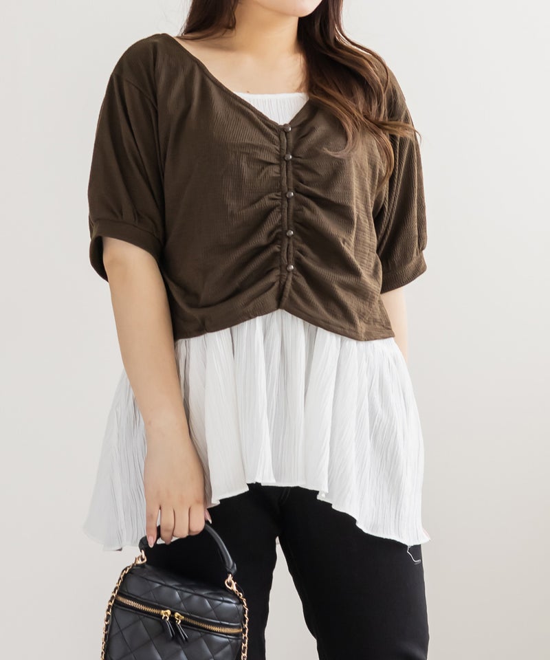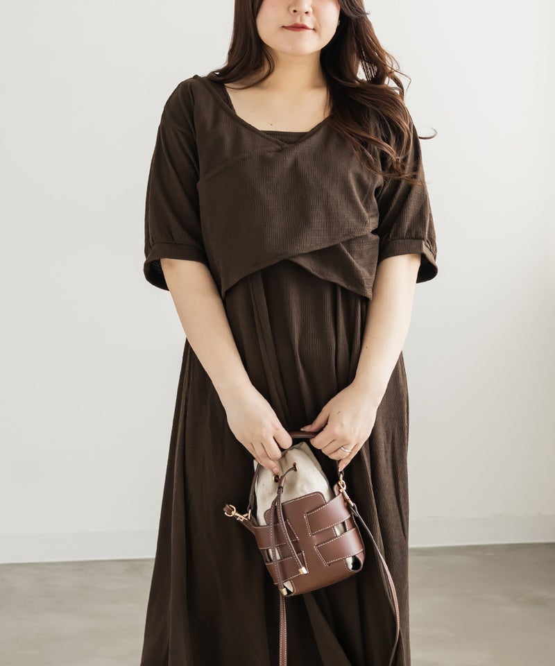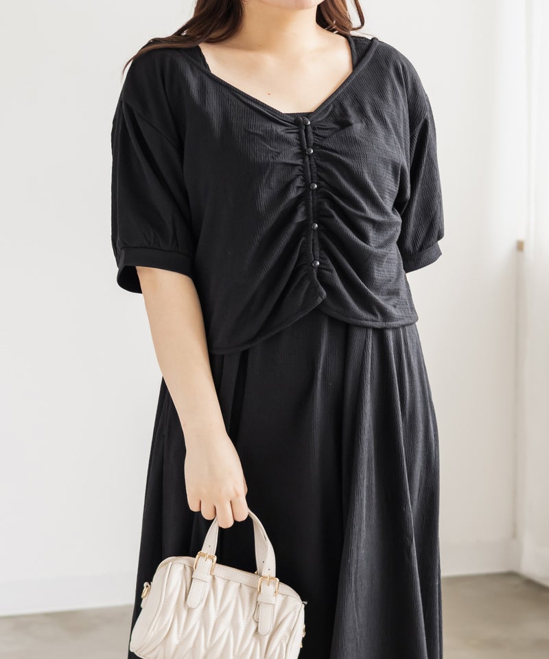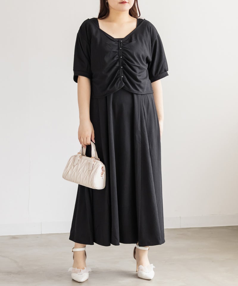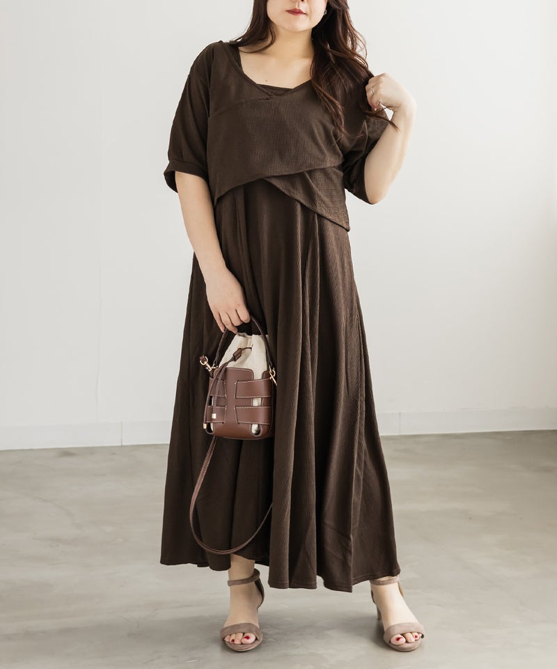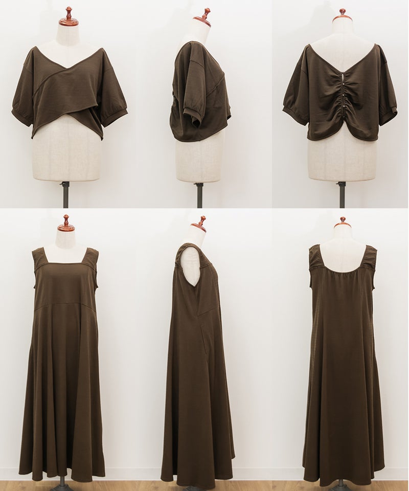 3Lサイズを着用して、ワンピースもトップスもどちらも程よくゆとりを持って着られました。全体的にちょうどいいサイズ感でした◎ セットアイテムなので、コーディネートに悩まずにサッと着られるのが嬉しいポイントです♪ トップスは前後2WAY仕様なので、気分に合わせて着こなしを変えられて着回し力も抜群! ワンピースは凹凸のある生地感で体のラインを拾いすぎずにすっきり見せてくれます。セットでも単品でも着回せるから、季節の変わり目にも重宝しそうです♪