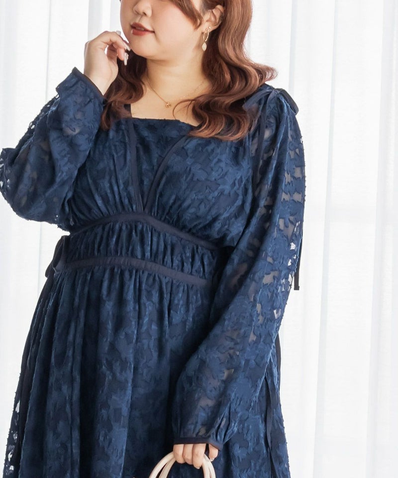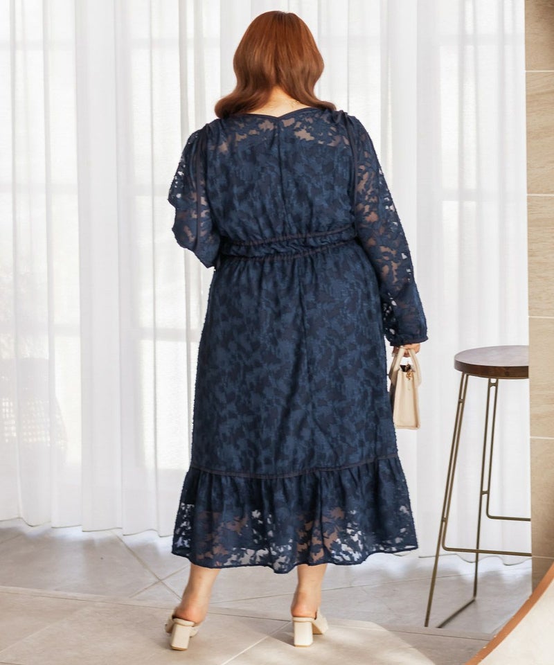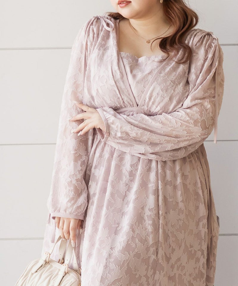 透け感のある花柄調の布帛生地。少し表面感のあるシアー素材で甘くなり過ぎない大人っぽい雰囲気です。伸縮性のないさらりとした裏地付き。デコルテ、袖部分は裏地無しで程よい透け感がアクセントになっています。