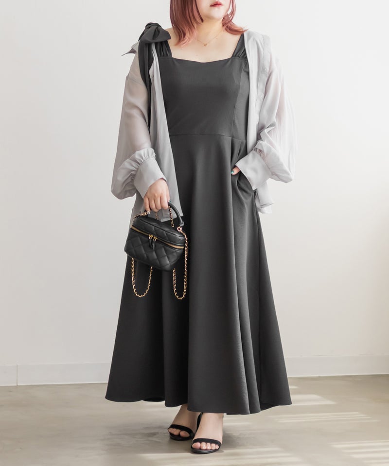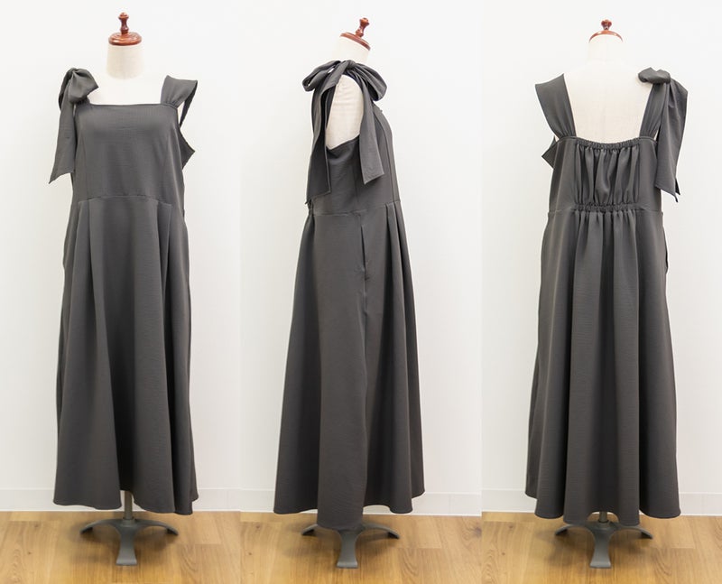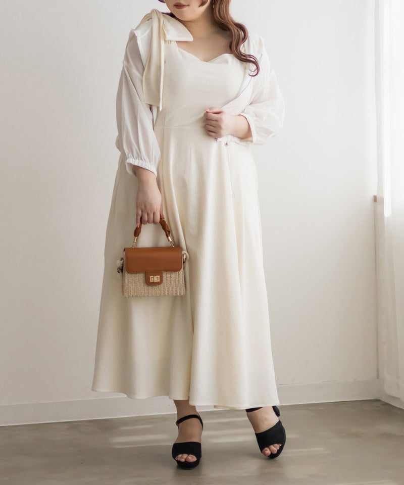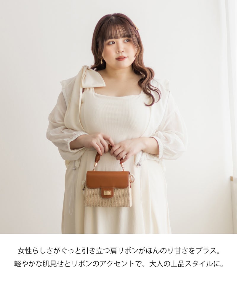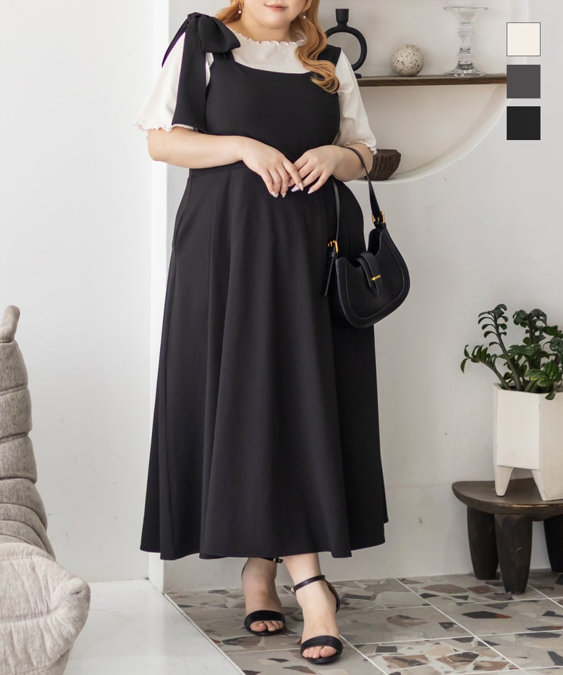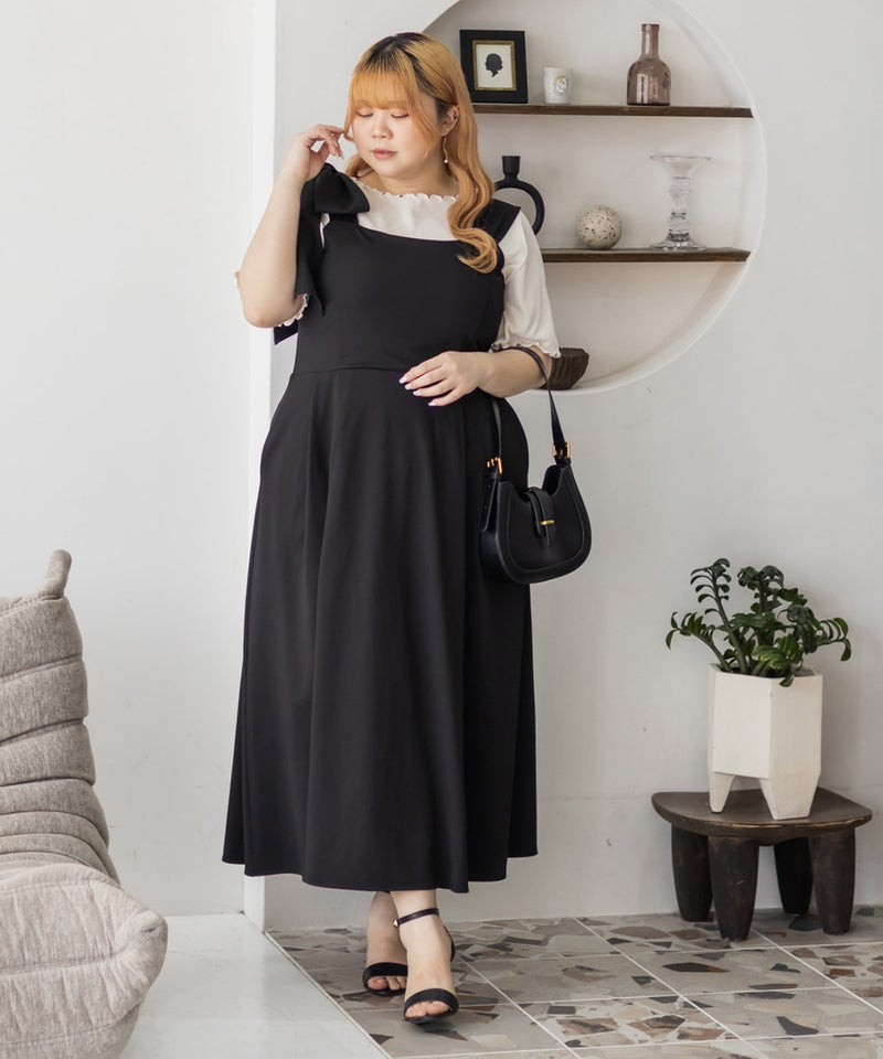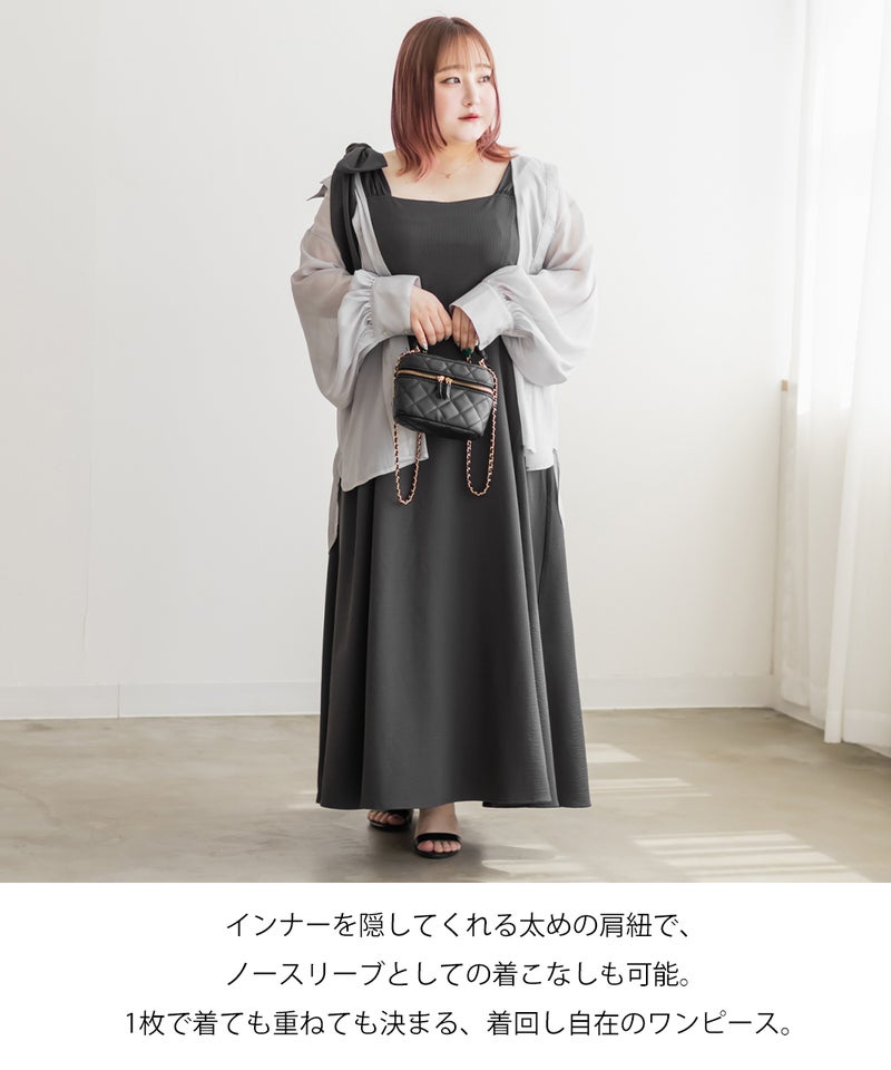3Lサイズを着用しましたが、肩まわりやバストまわりも窮屈感なく、全体的にちょうどいいサイズ感でした◎生地に少しハリがあって、体のラインを拾いにくいのが嬉しいです!しっかり伸びもあるのでらくちんな着心地でした。肩のリボンがアクセントになっていて、甘くなりすぎず、さりげなく可愛さをプラスしてくれます。ノースリーブでも着用できるよう肩紐が隠せるデザインになっているのがポイントで、インナー次第でロングシーズン使えてたくさんの着回しが可能です♪