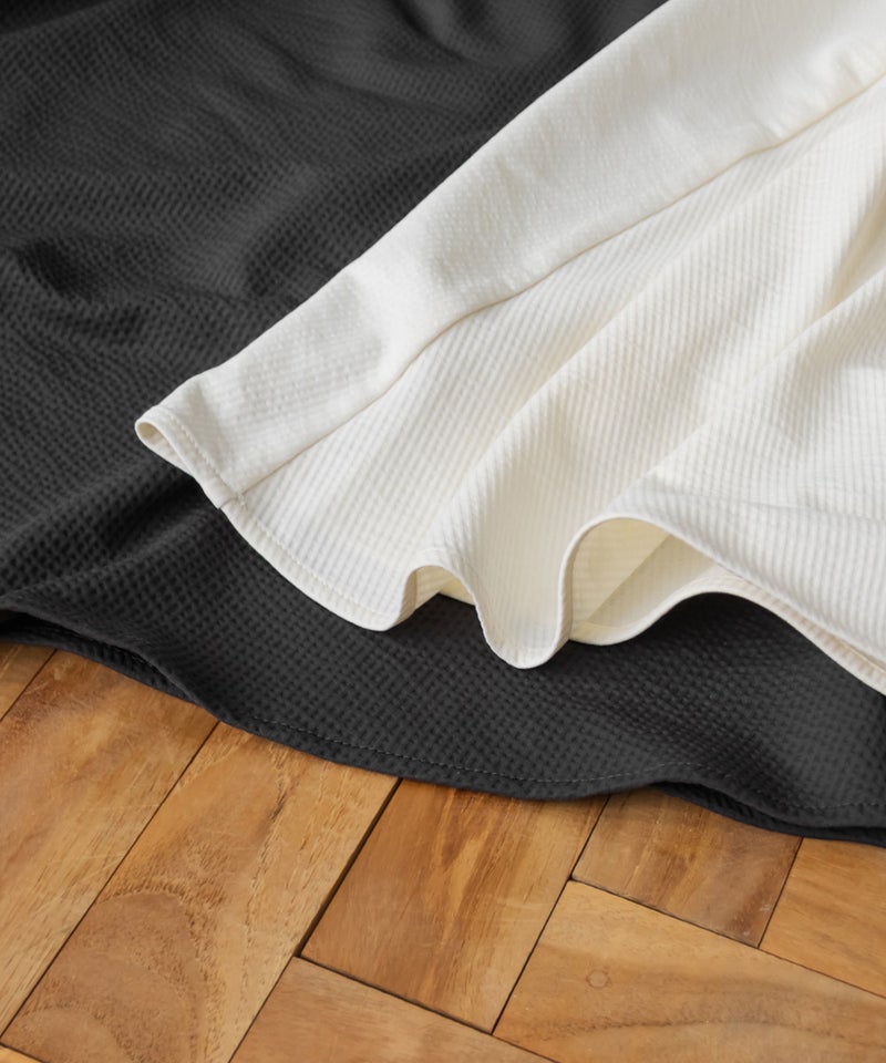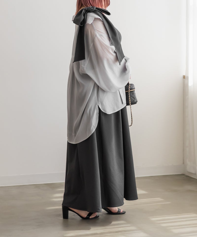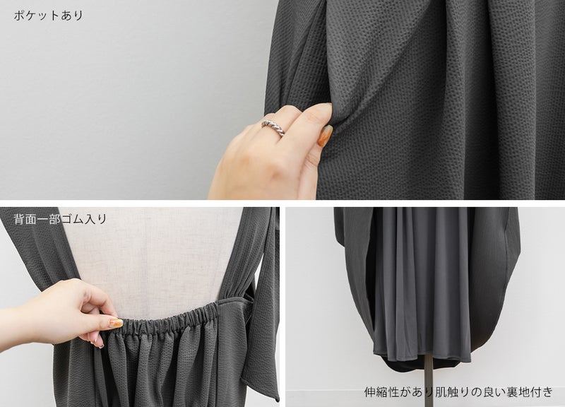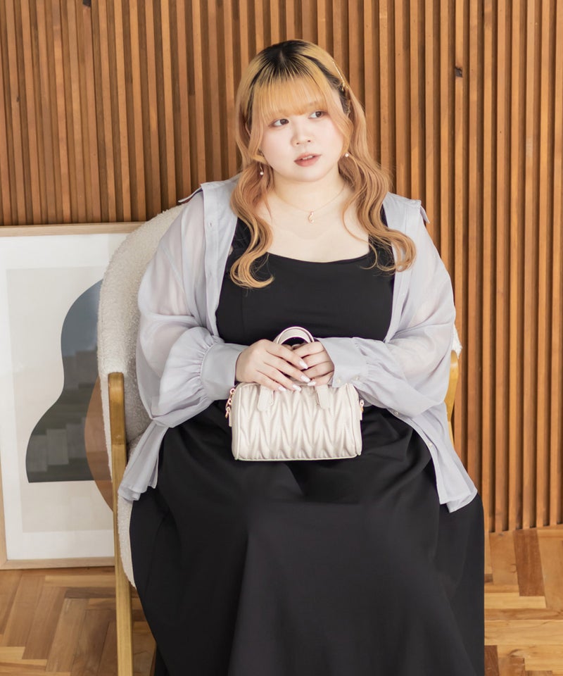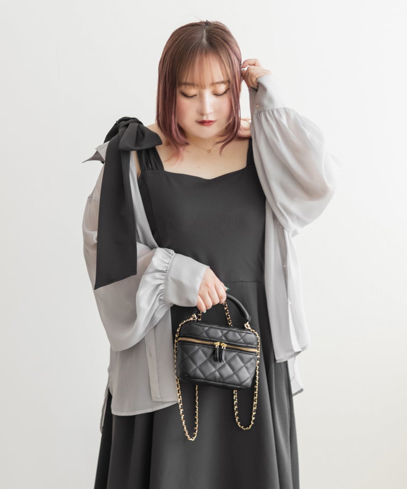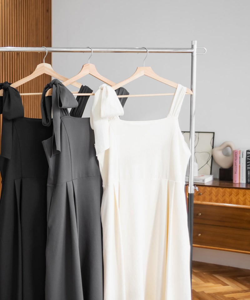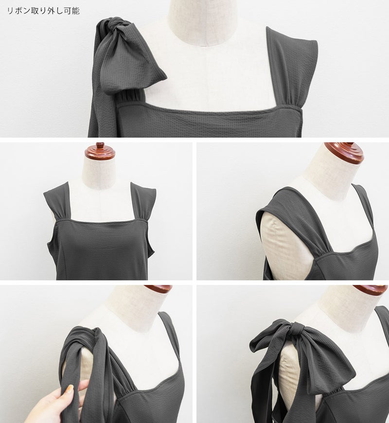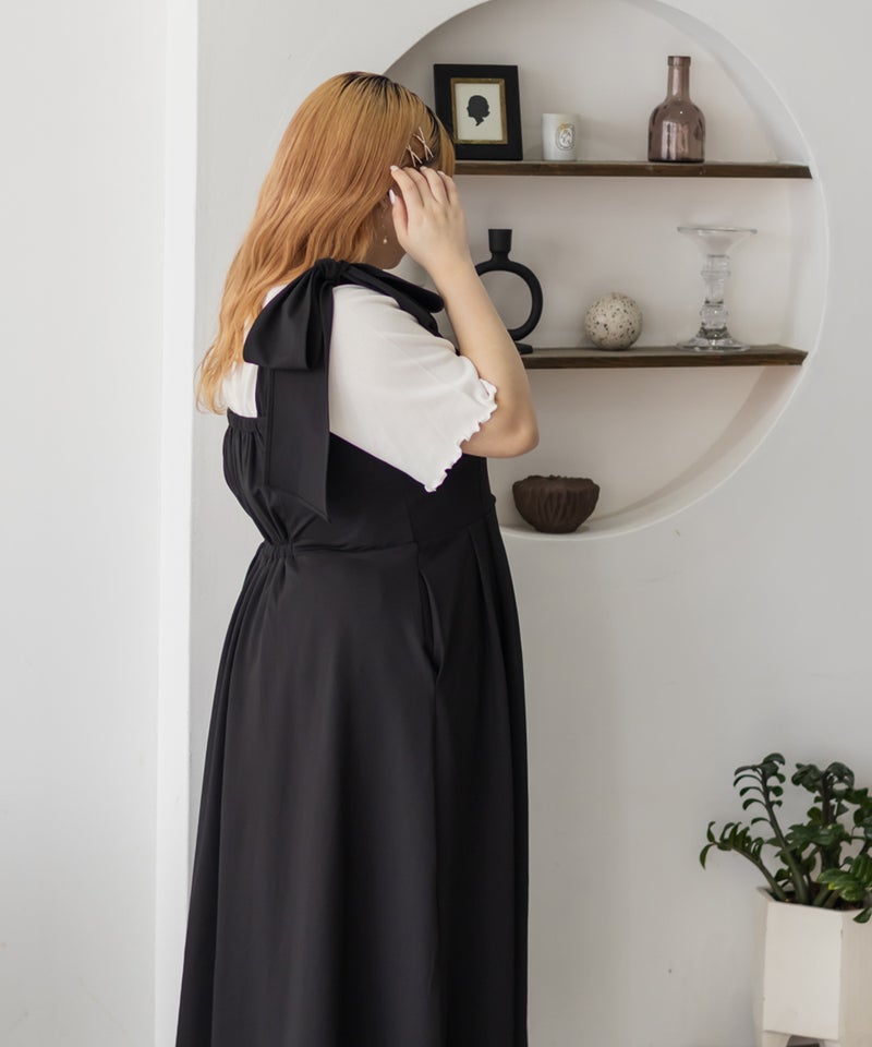 3Lサイズを着用しましたが、肩まわりやバストまわりも窮屈感なく、全体的にちょうどいいサイズ感でした◎生地に少しハリがあって、体のラインを拾いにくいのが嬉しいです!しっかり伸びもあるのでらくちんな着心地でした。肩のリボンがアクセントになっていて、甘くなりすぎず、さりげなく可愛さをプラスしてくれます。ノースリーブでも着用できるよう肩紐が隠せるデザインになっているのがポイントで、インナー次第でロングシーズン使えてたくさんの着回しが可能です♪